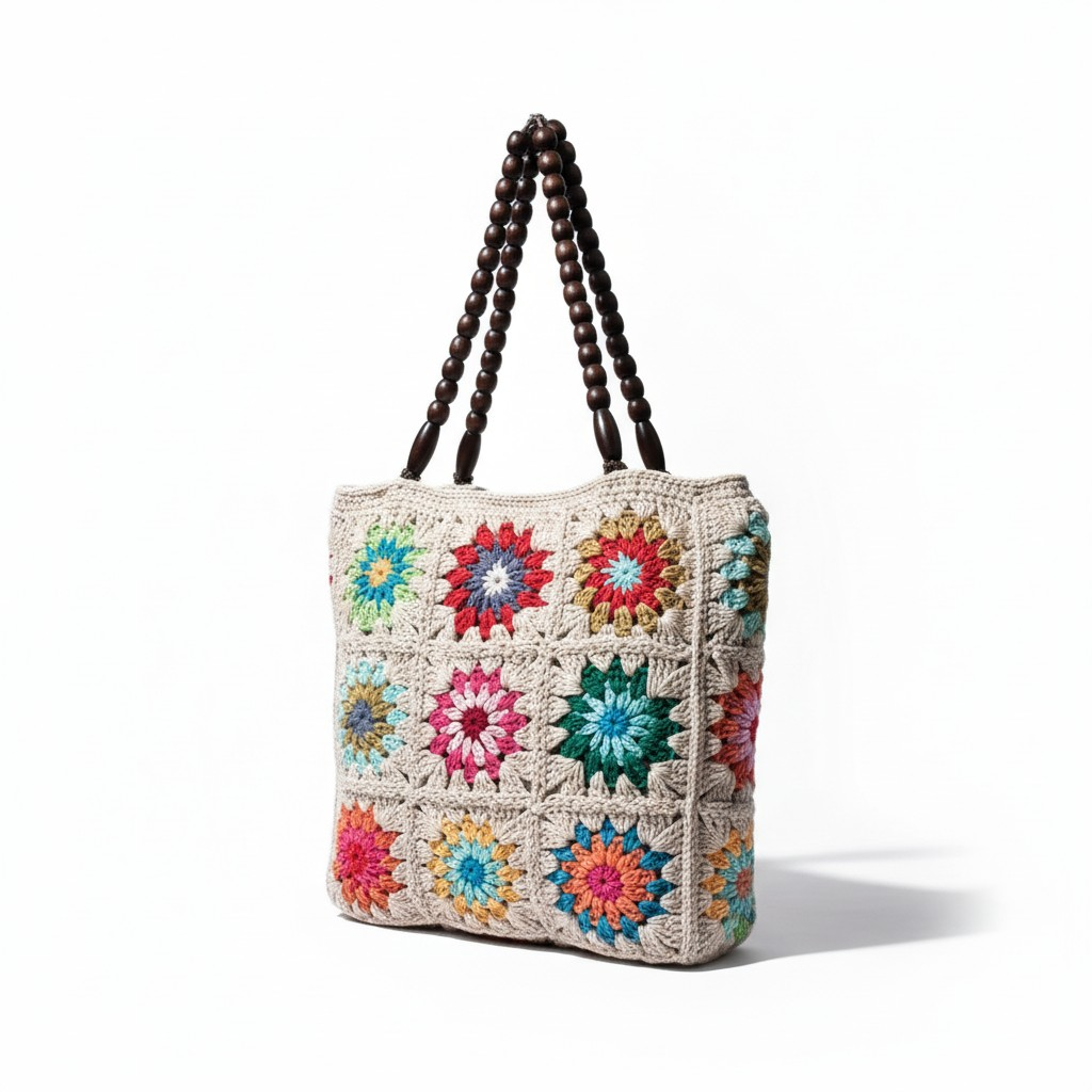 Beige base with multi colour motif,inner lining with pockets and zipper. dimension 40 x 40 cm