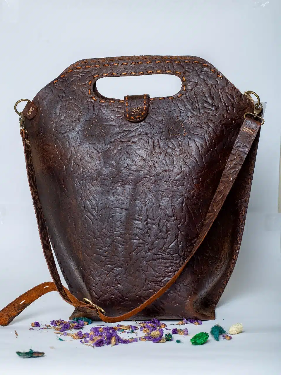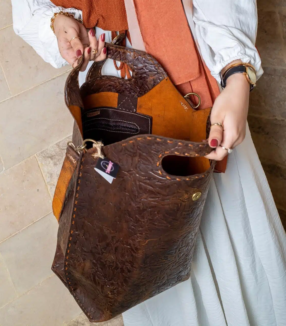 شنطة جلد طبيعي  من الجلد الطبيعي المميز والمطبوع مزودة بجيب كبير داخلي وآخر خارجي