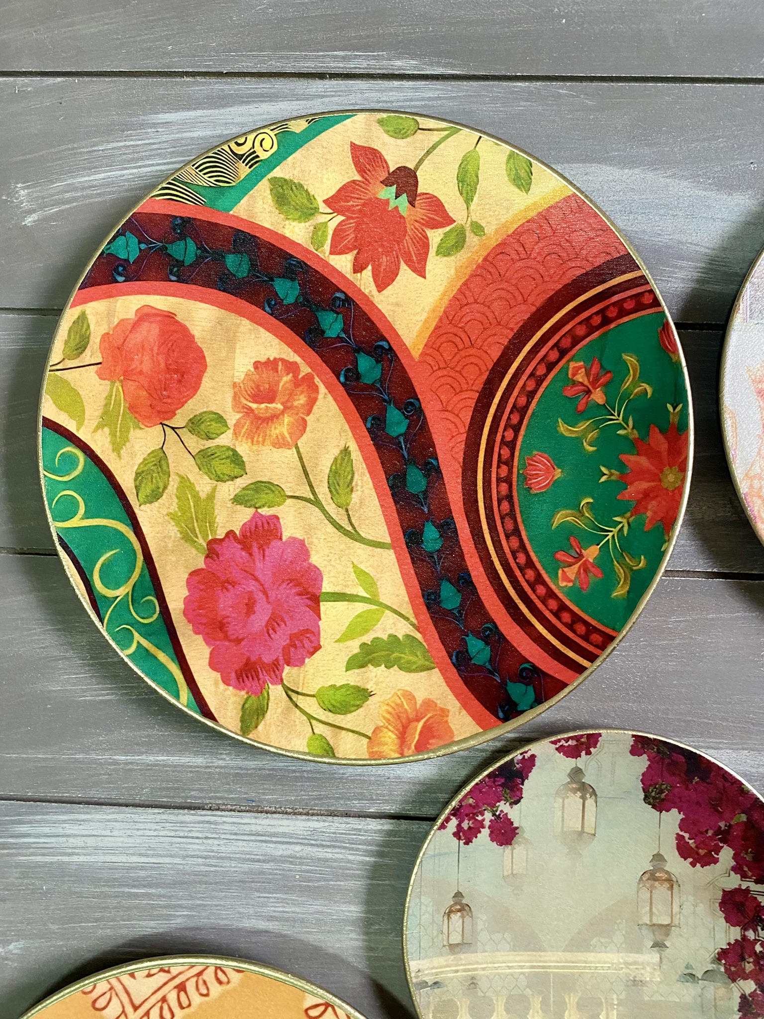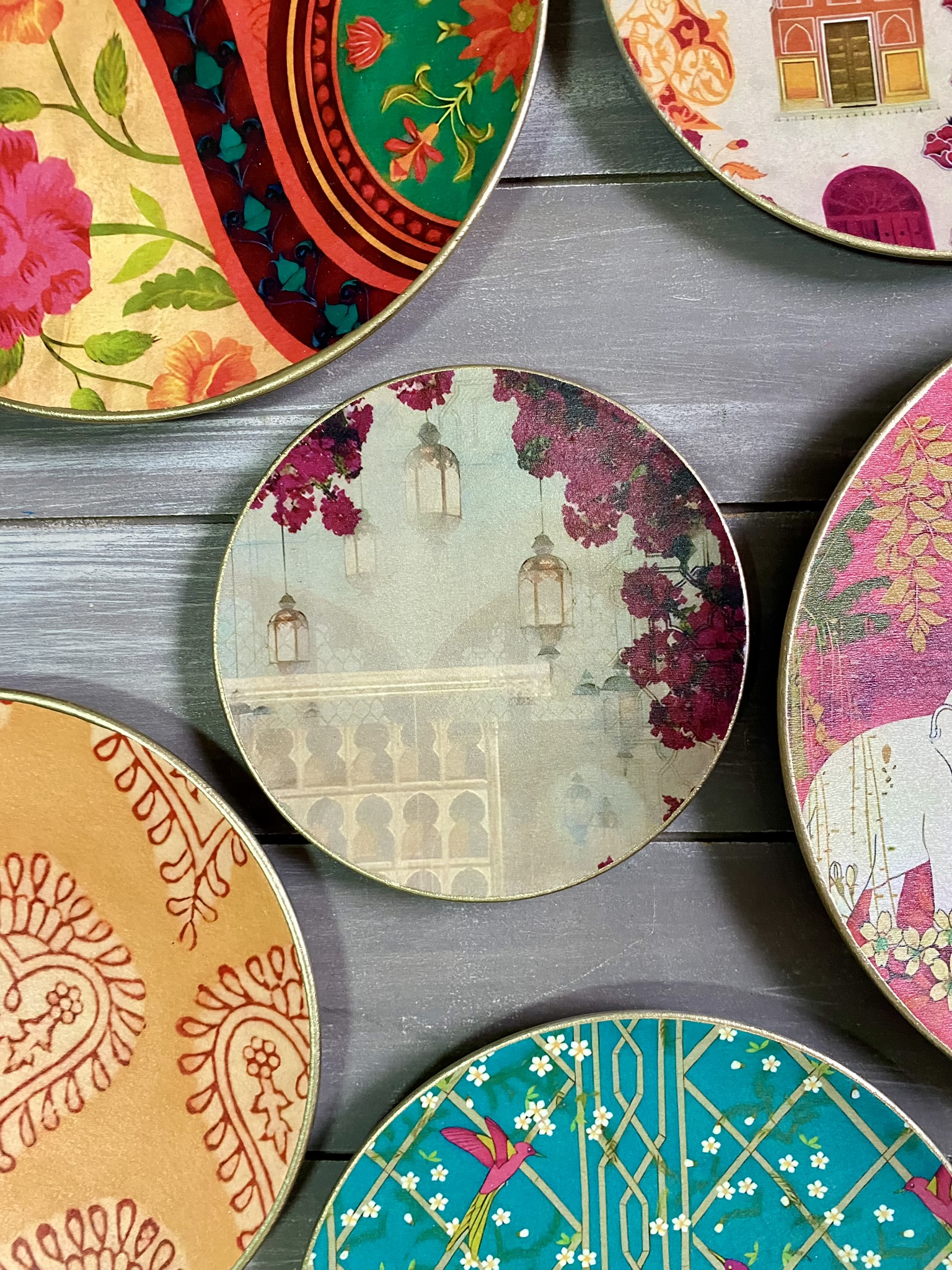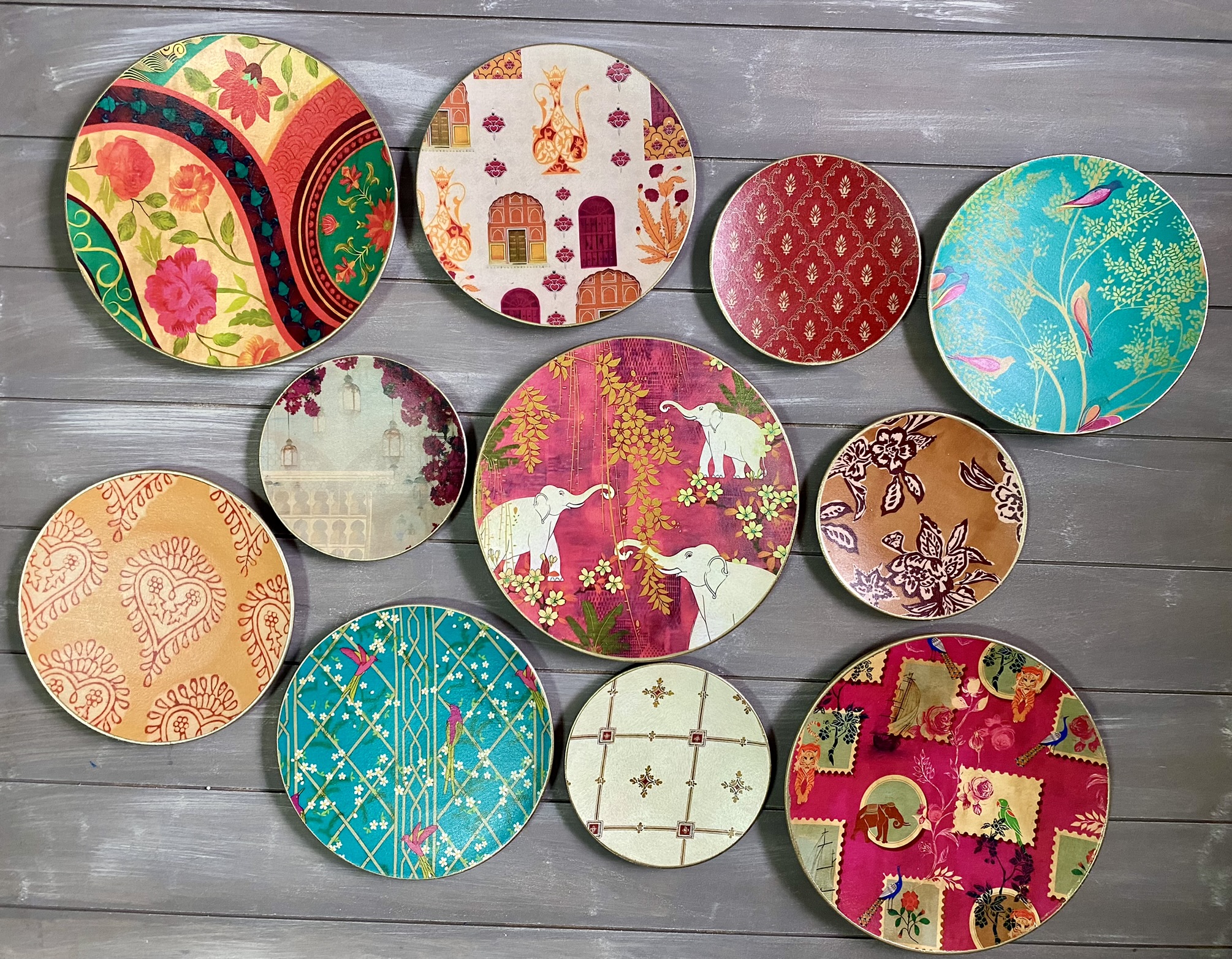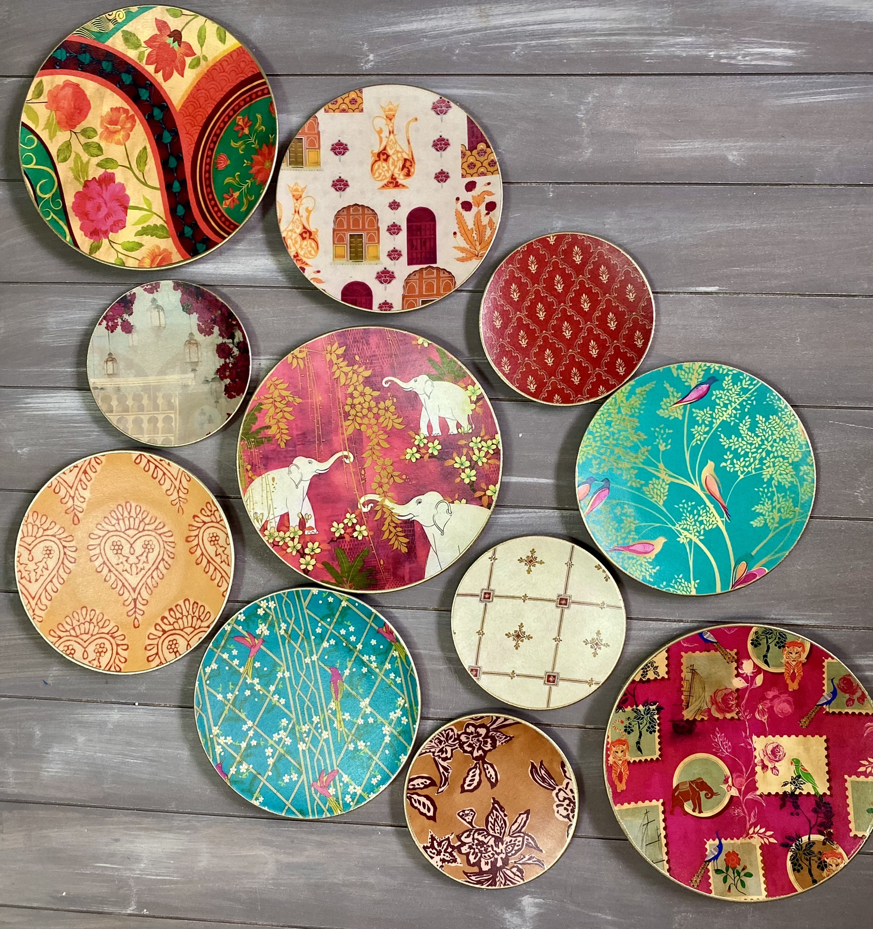 Decoupaged wall plates in indian patterns