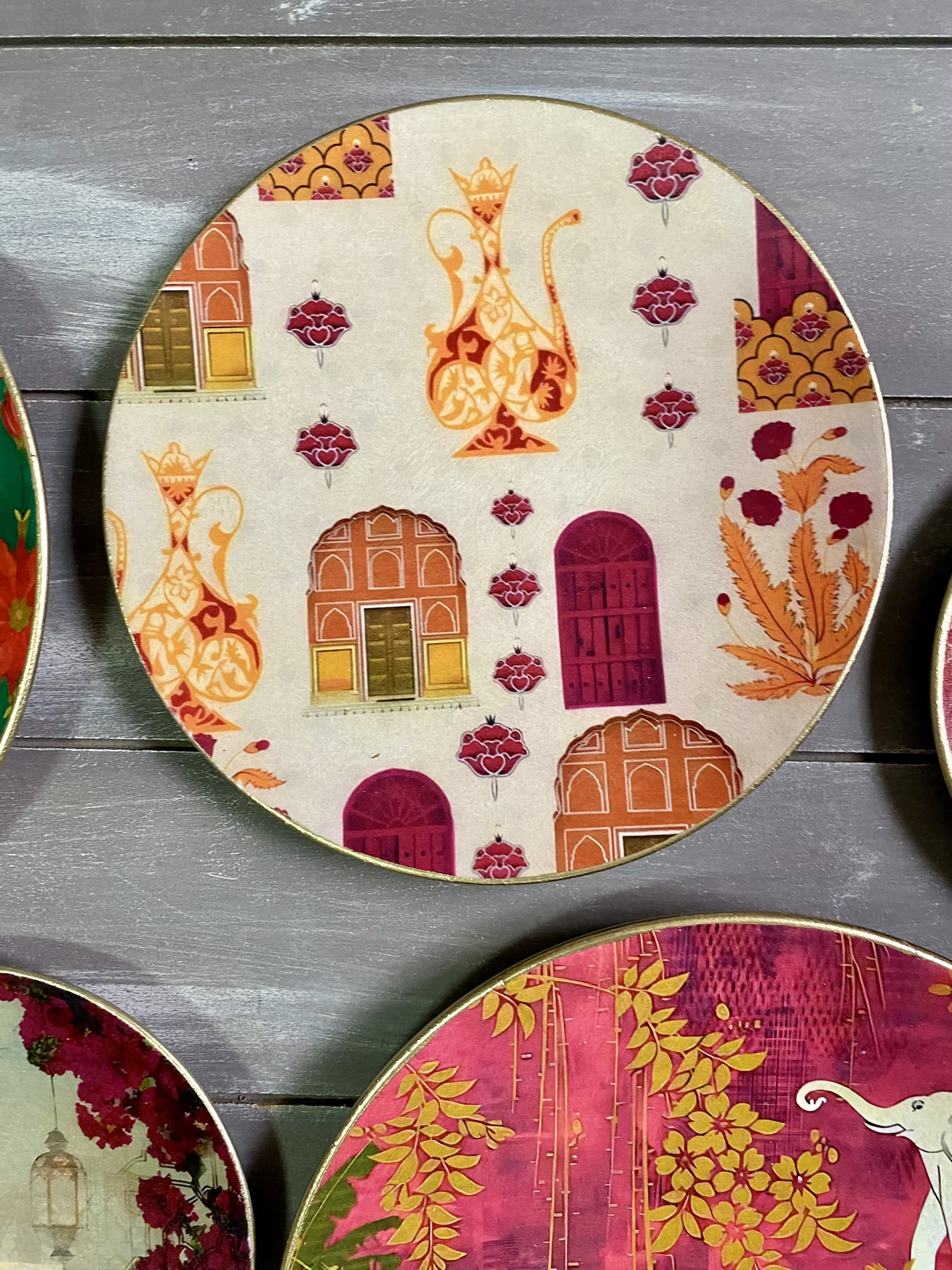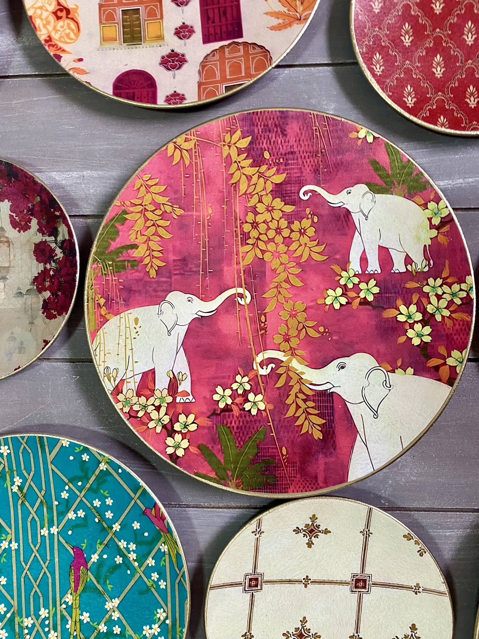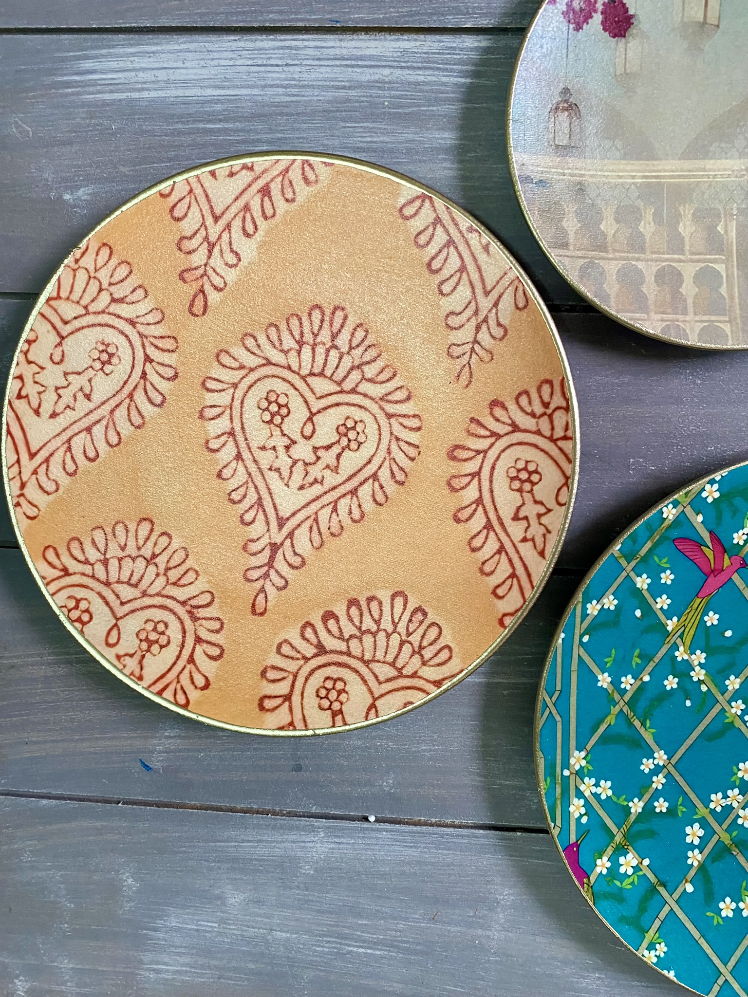 Decoupaged wall plates in indian patterns