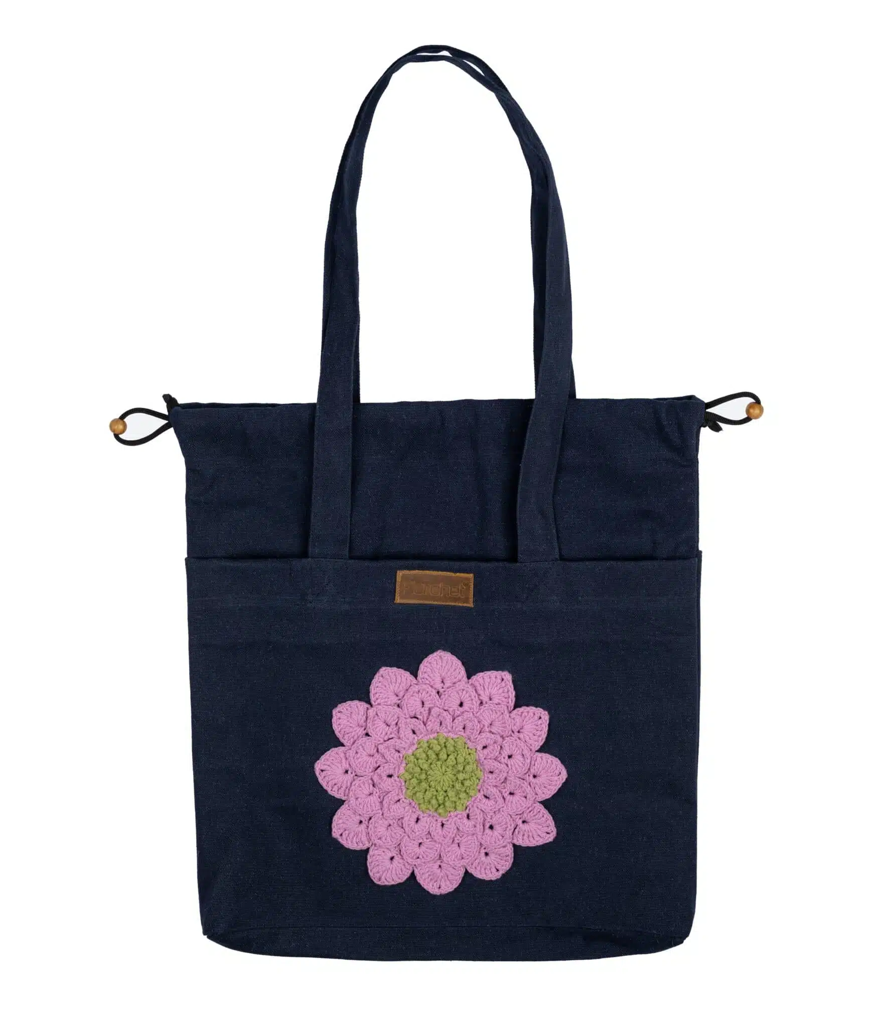 Indigo Tote bag with 2 large outer pockets and a small inner pocket.