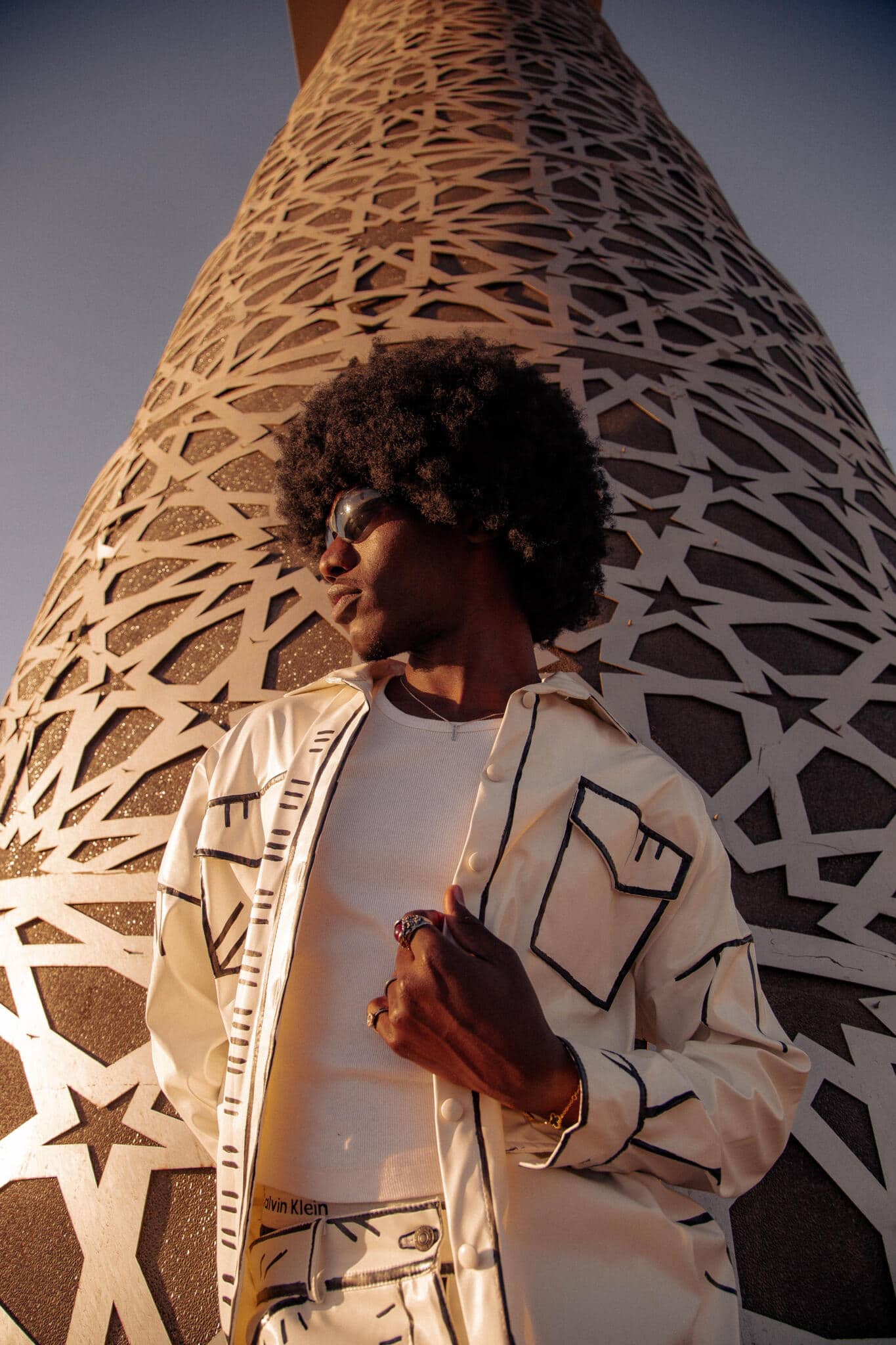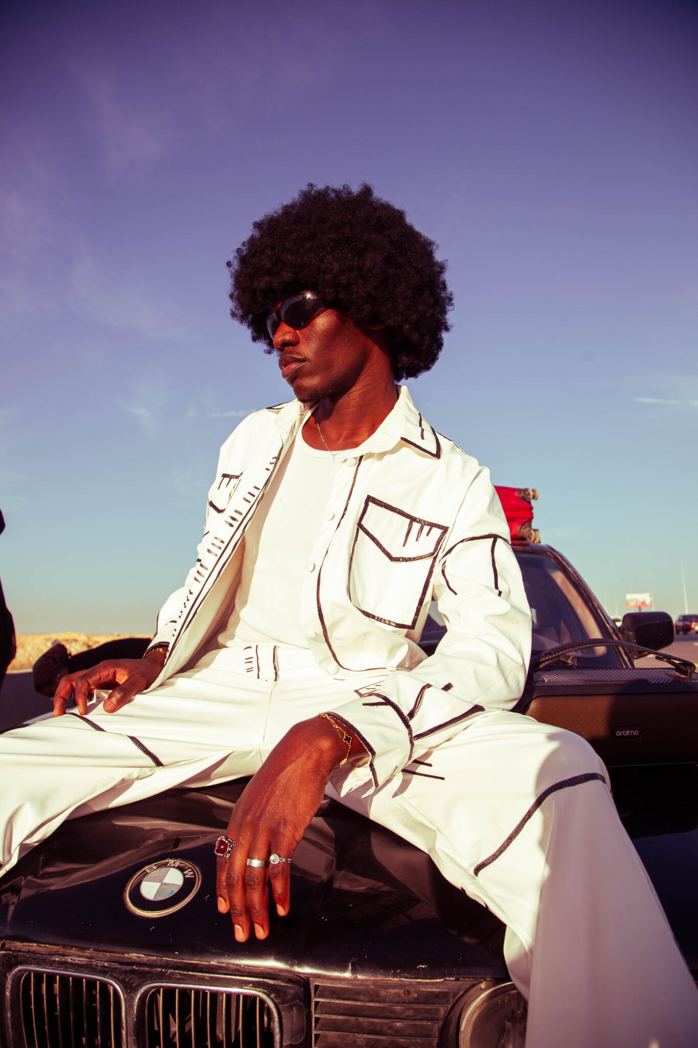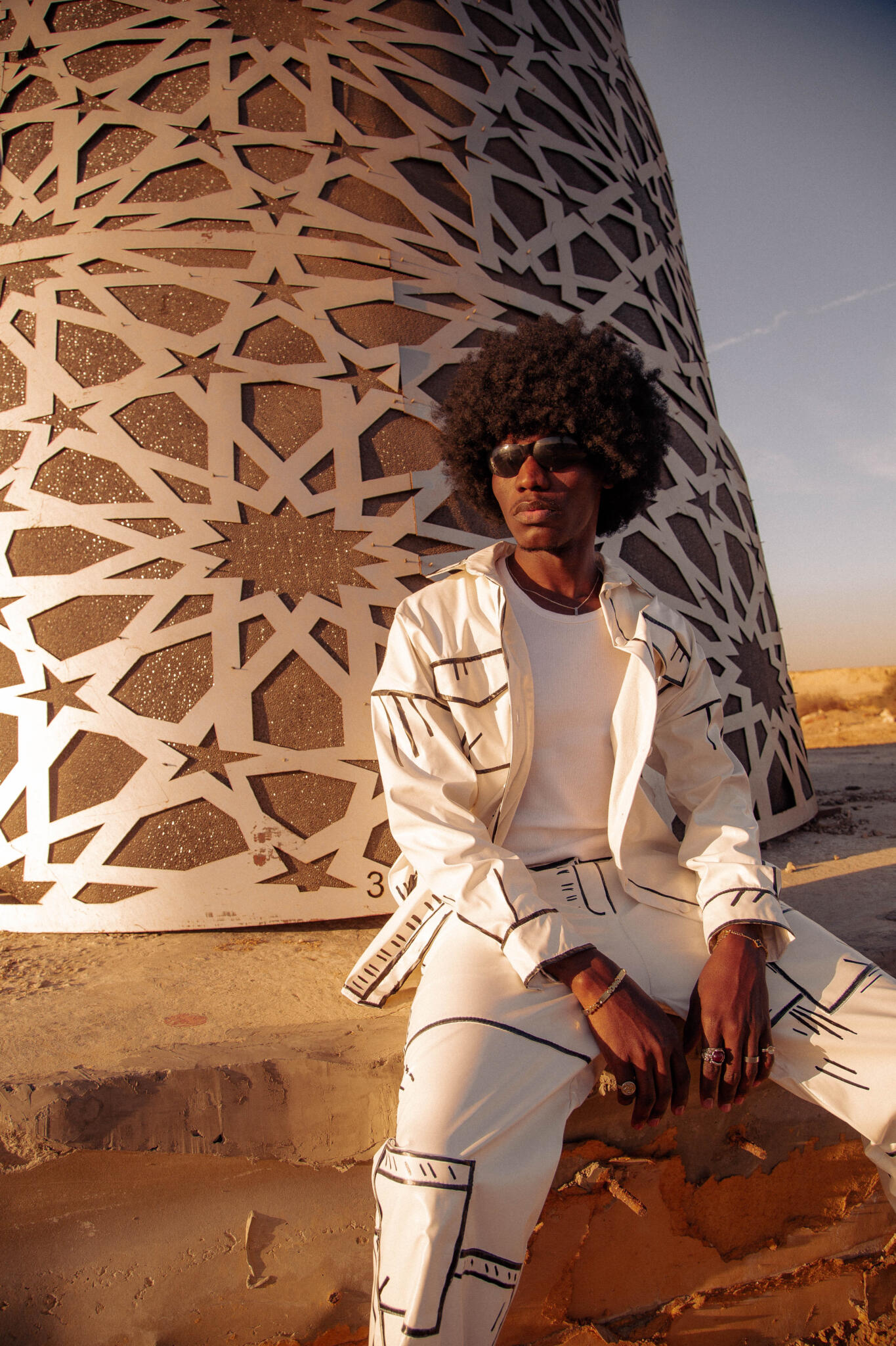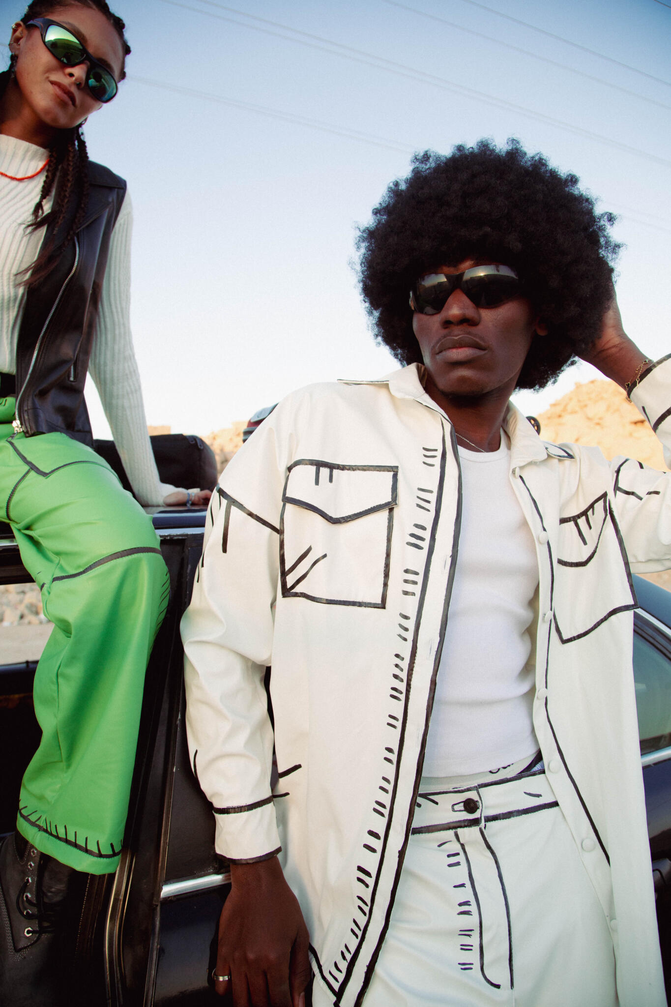 This white leather shirt is elevated with hand-drawn 2D black illustrations, creating a striking balance between clean design and artistic expression. Its graphic detailing gives it a modern, standout edge while keeping the look effortlessly wearable.
