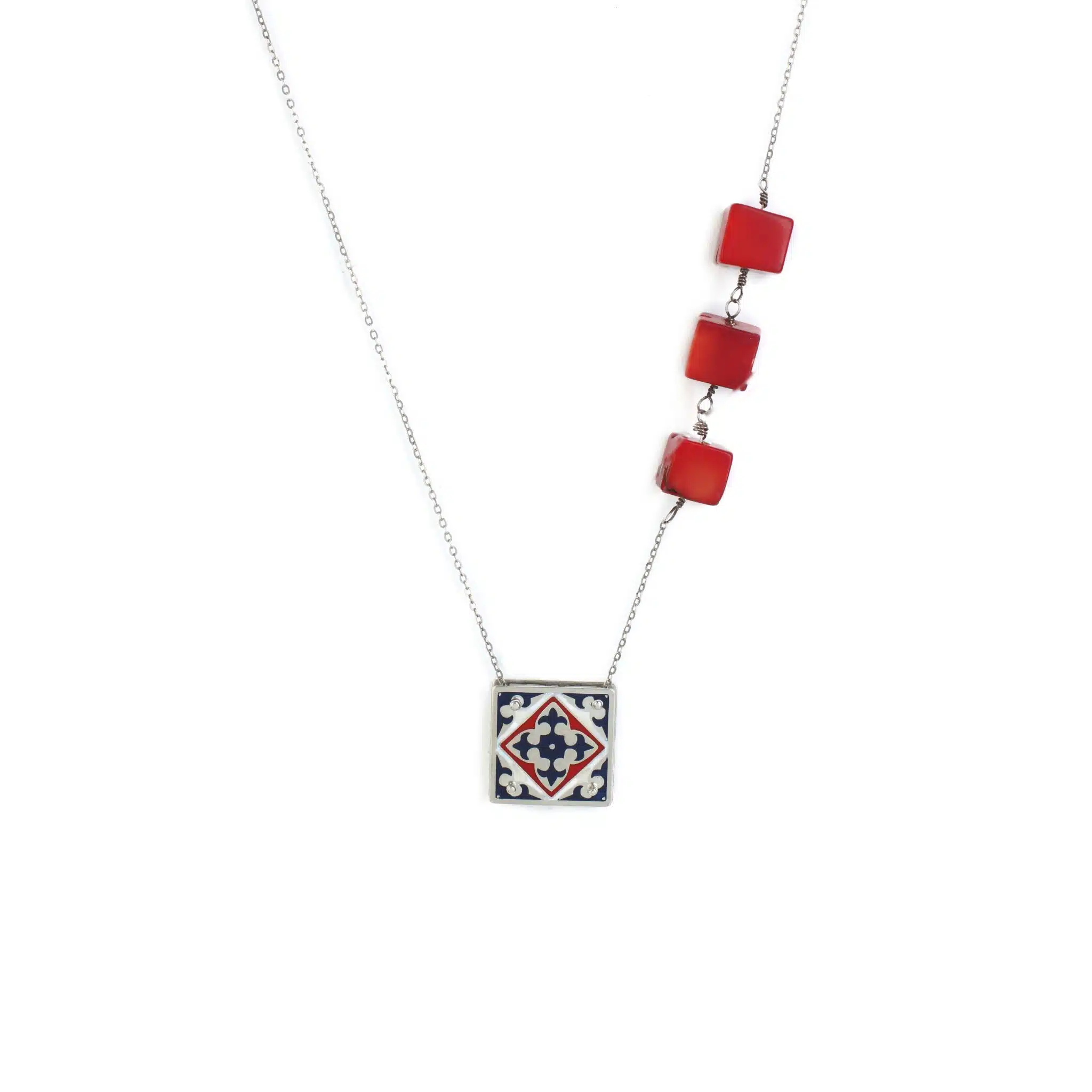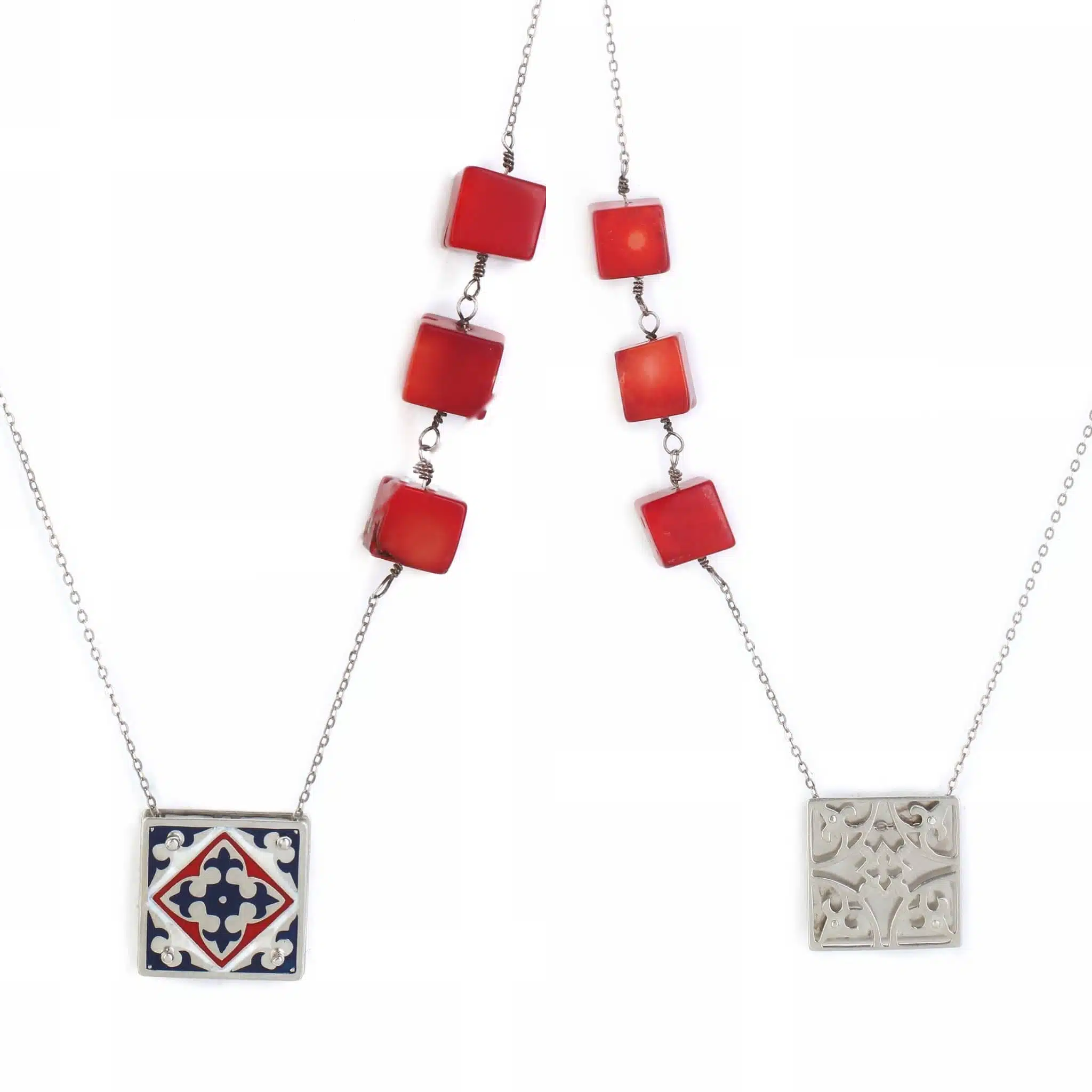 - Interchangeable necklace has one side with an intricate design, and the other with colorful enamel. Additionally, the necklace can be worn either as a square shape 🟥 or a diamond shape ♦️