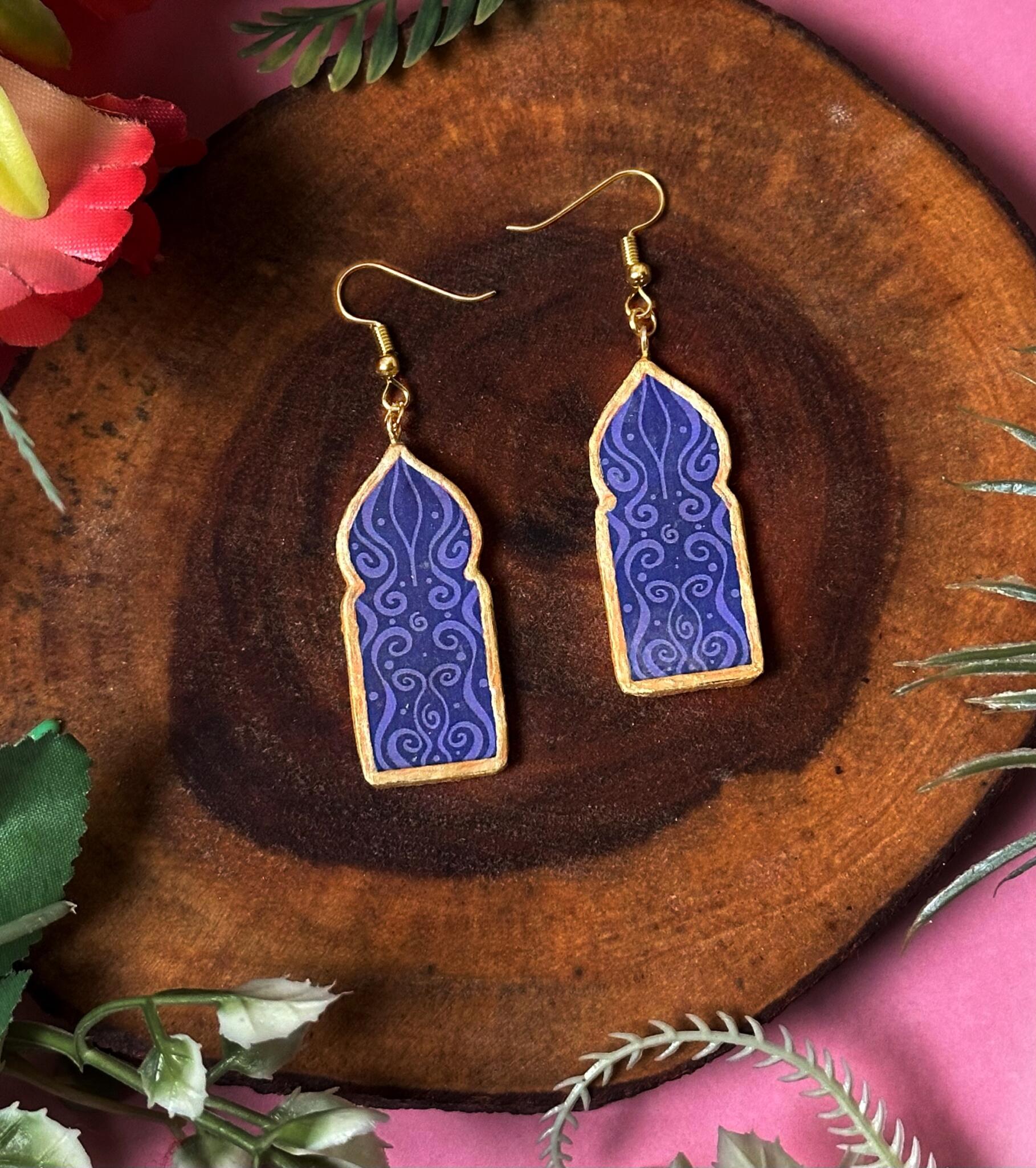 Elegant ceramic earrings with an Islamic arch silhouette, adorned with rich purple patterns inspired by traditional Arabic architecture, perfect for celebrating the spirit of Ramadan