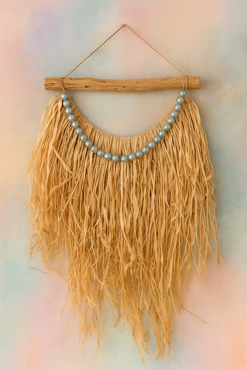 Handcrafted from dried raffia strands and accented with a graceful string of faux pearls, this piece evokes the spirit of island life and traditional craftsmanship. Mounted on a rustic wooden rod, it adds texture and a coastal, bohemian feel to any wall.