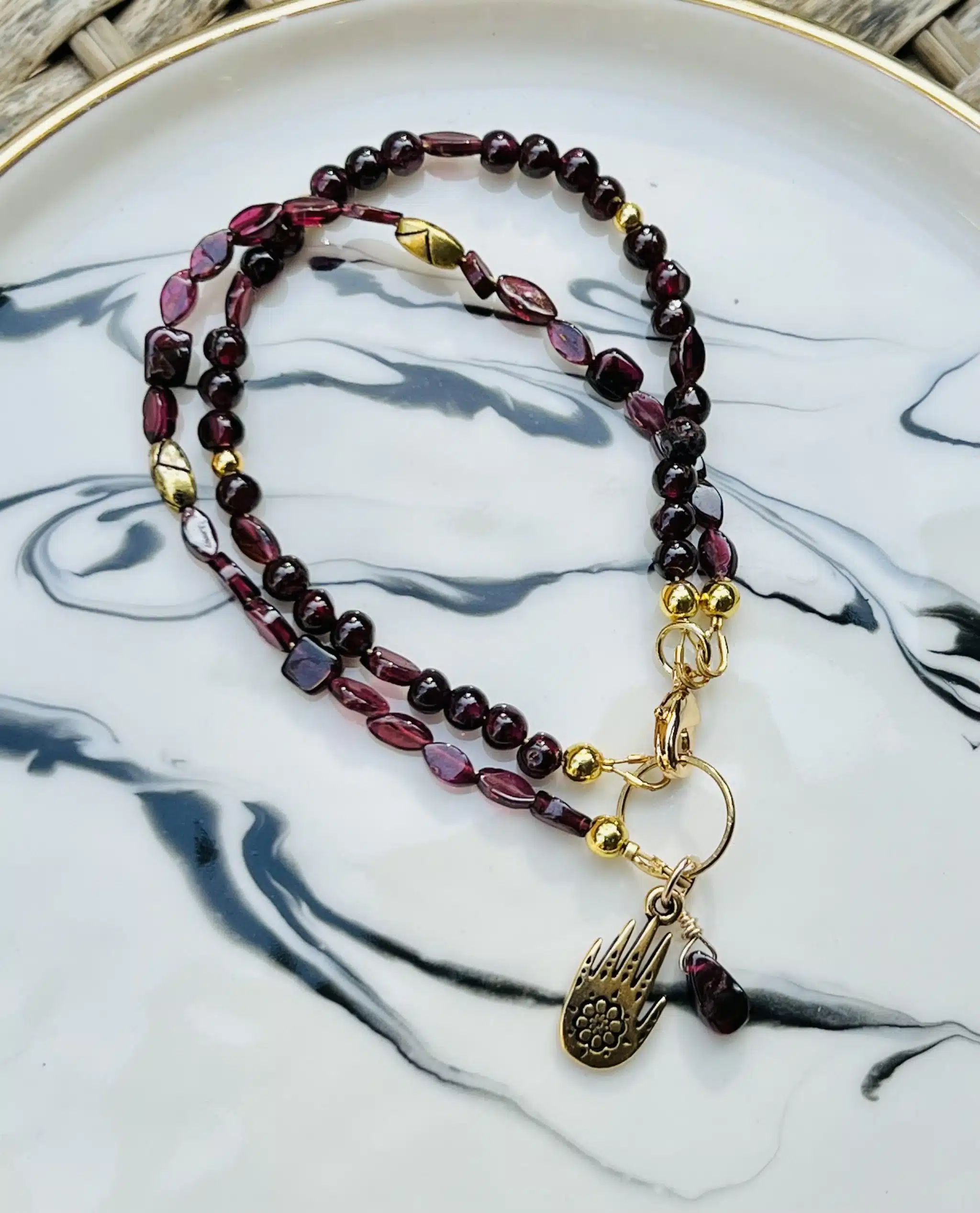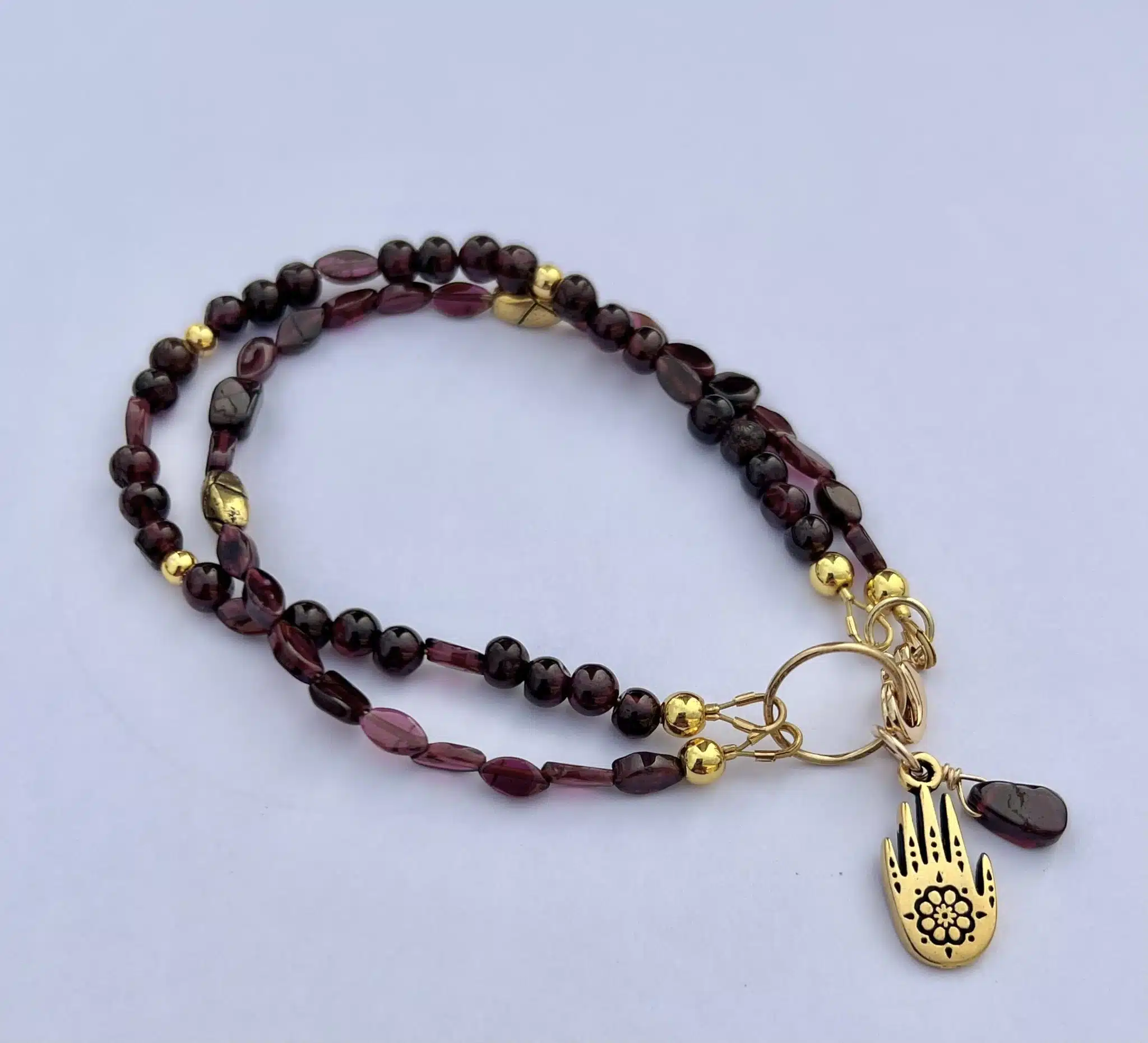 it’s made from beautiful garnet beads, gold filled spacers and clasp, gold plated Fatima’s hand charm.