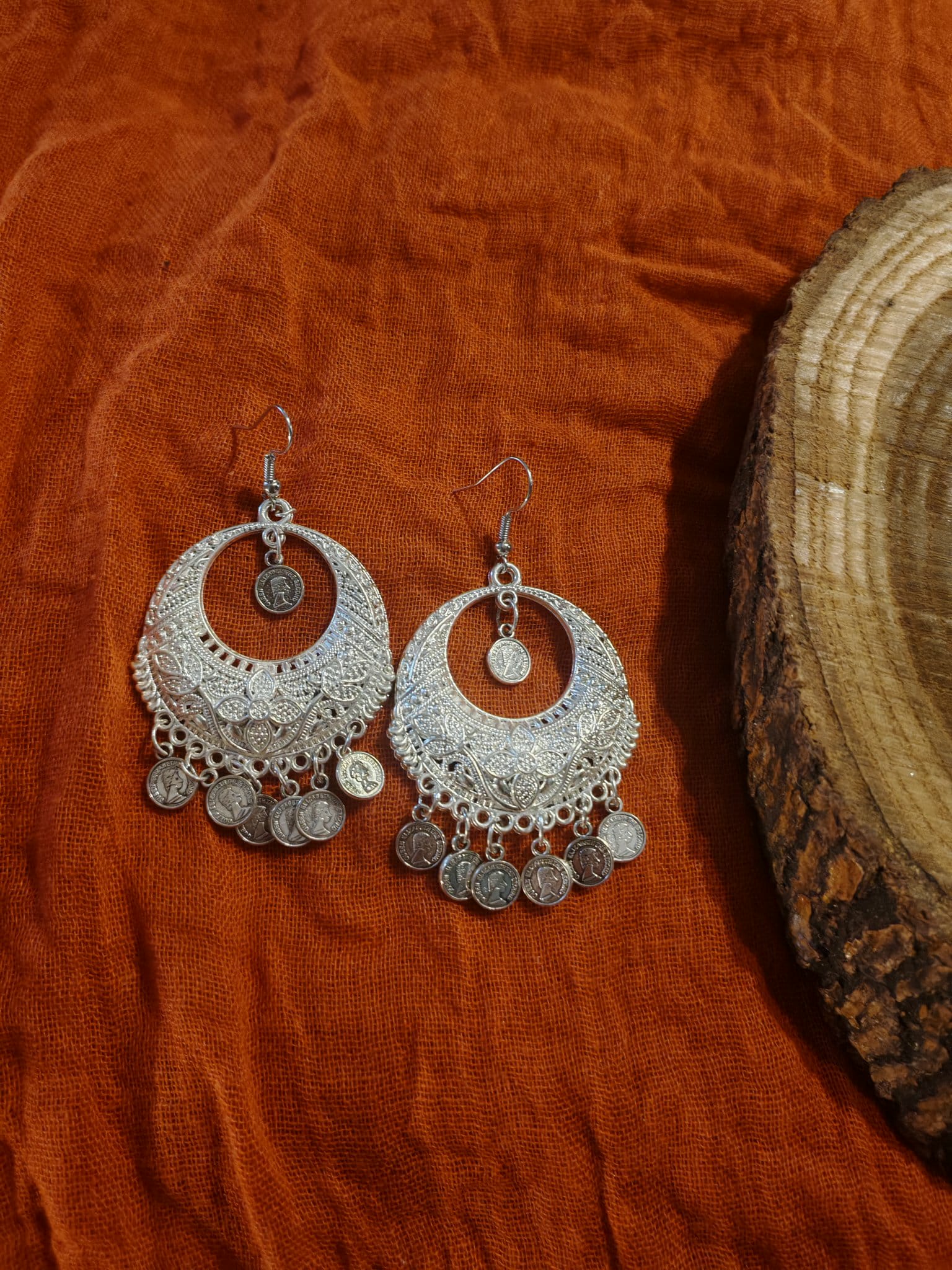زوج من الأقراط النسائية الفضية المؤكسدة بتصميم جمكا التقليدي، تتميز بحلقات دائرية كبيرة مزخرفة بنقوش دقيقة وتتدلى منها عملات معدنية صغيرة لمظهر بوهيمي وعرقي جذاب.
