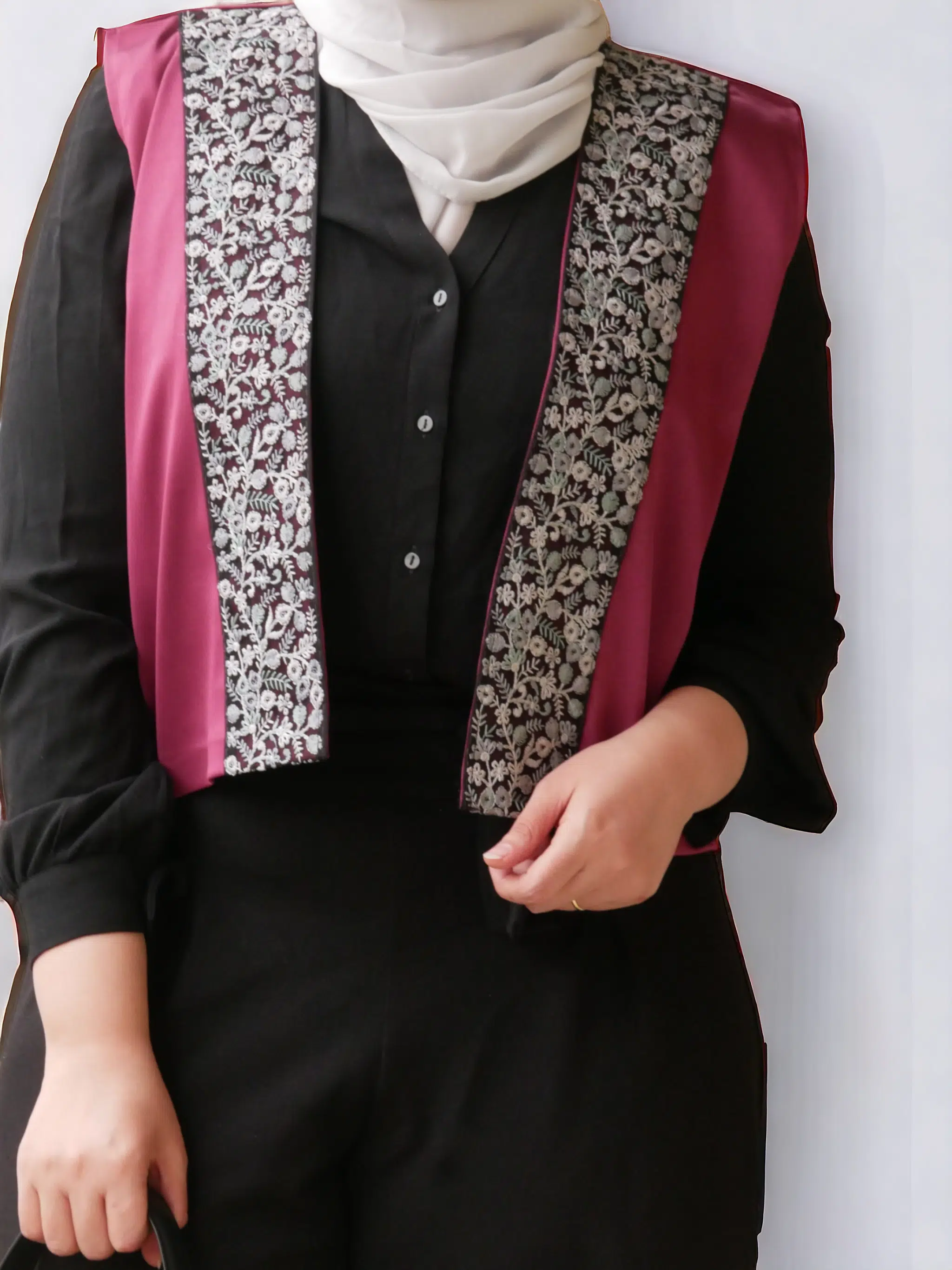 This satin vest features delicate floral embroidery, combining rich color with intricate detail. The soft, luxurious fabric provides a smooth feel, while the vibrant floral design adds a touch of elegance and charm. Perfect for adding a sophisticated, feminine flair to any outfit, this short vest is ideal for both casual and dressy occasions. Its timeless beauty and refined craftsmanship make it a standout piece in any wardrobe.