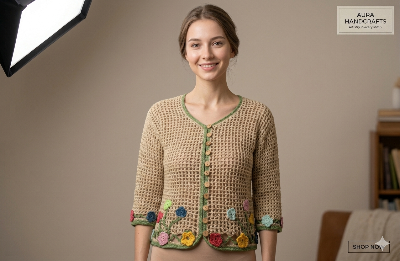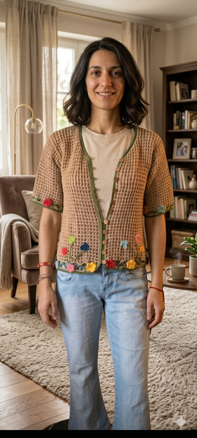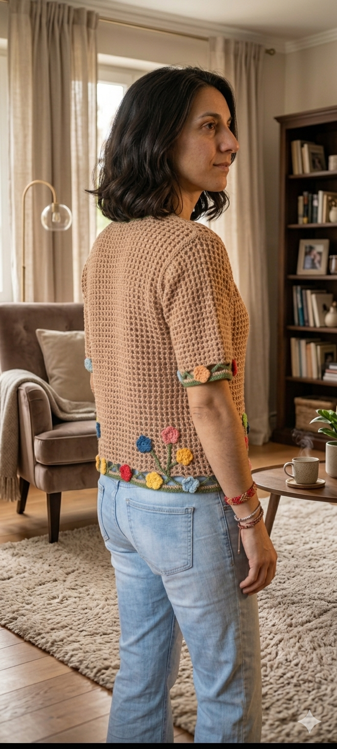 Trendy crochet jacket, made of high quality pure cotton , half sleeve, color beige with multi coloured flowers on borders.