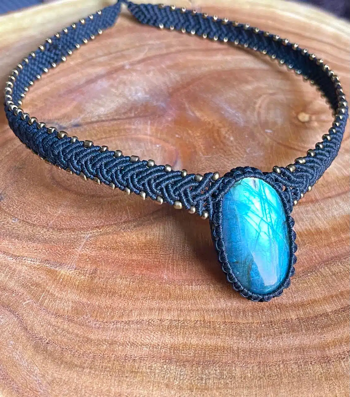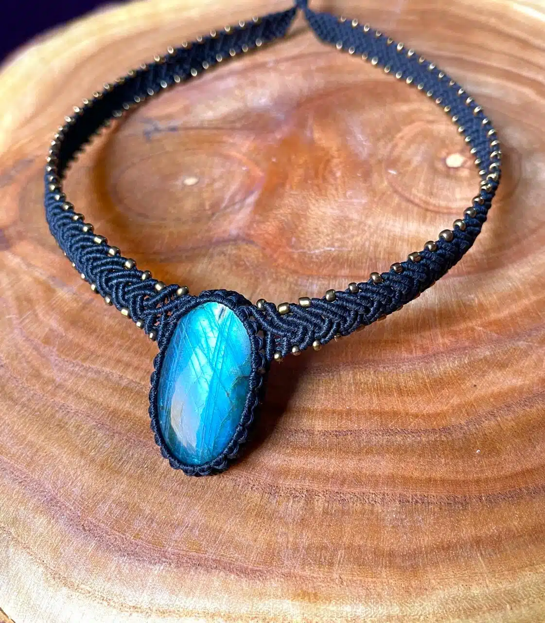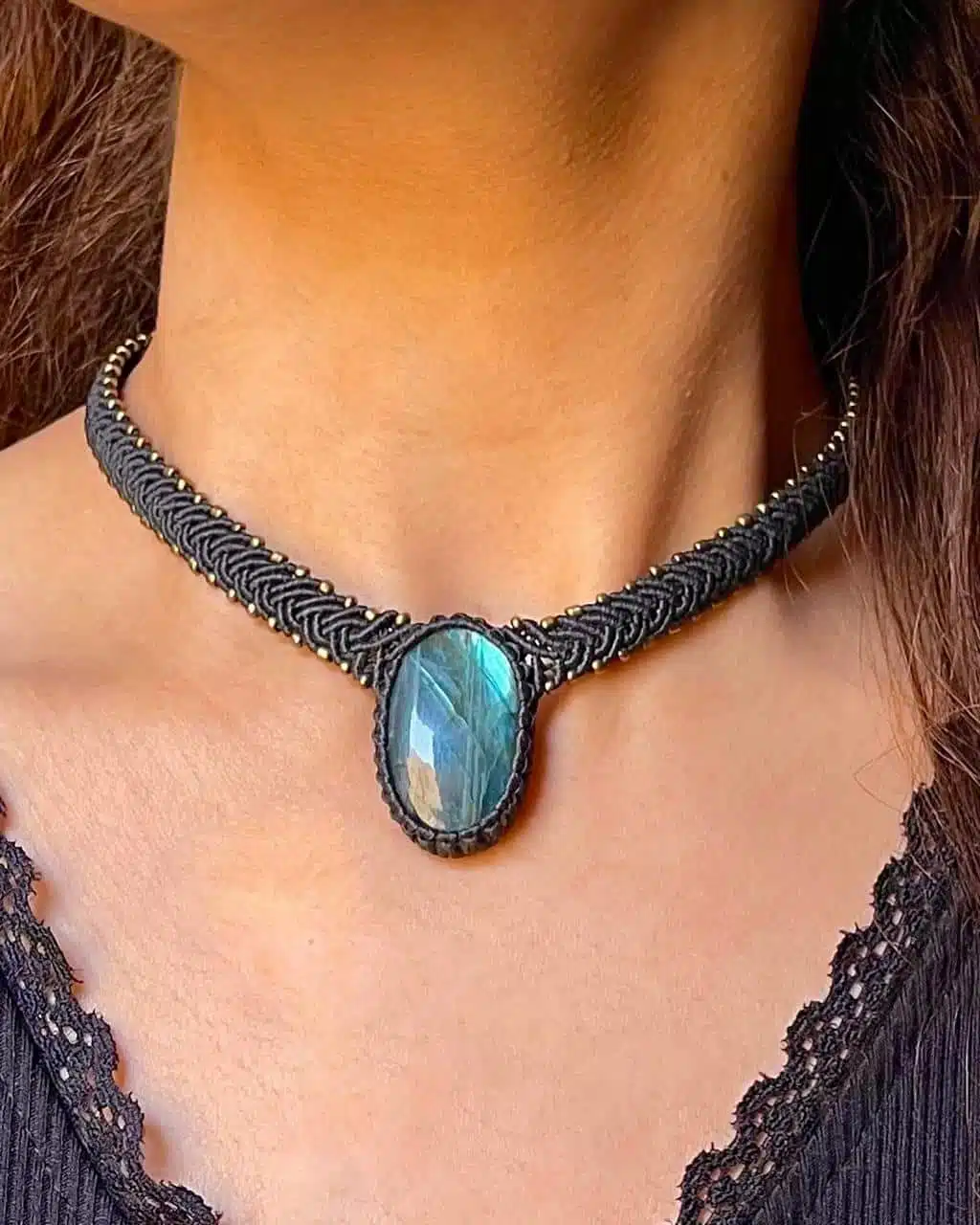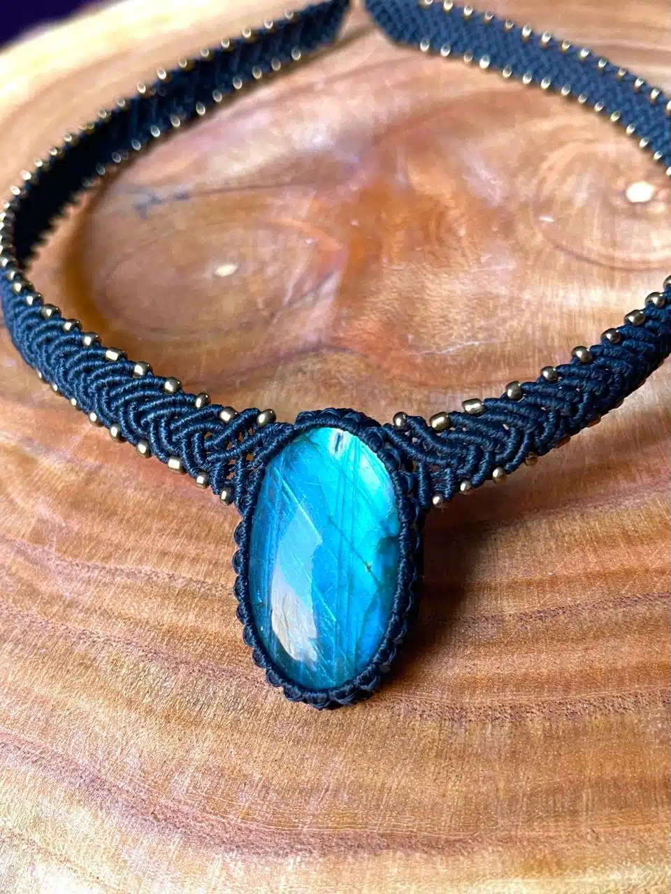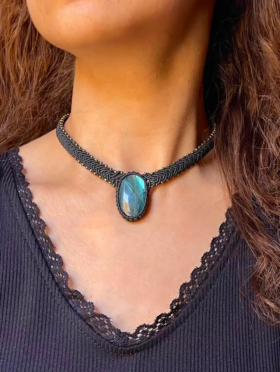 A Handmade adjustable necklace created with Labradorite crystal and brass woven by black cords making a statement piece.