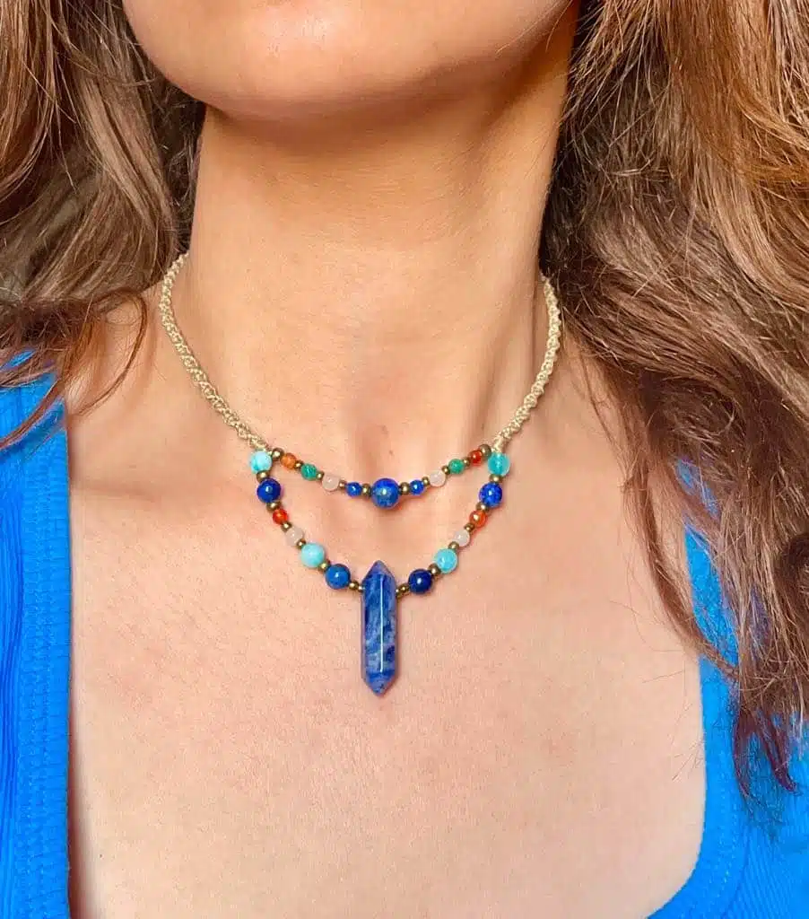 Handmade creation reflects the blend of blue tones from lapis and larimar, invoking a calming oceanic vibe, while the clear quartz, carnelian, and Aventurine bring harmony and balance