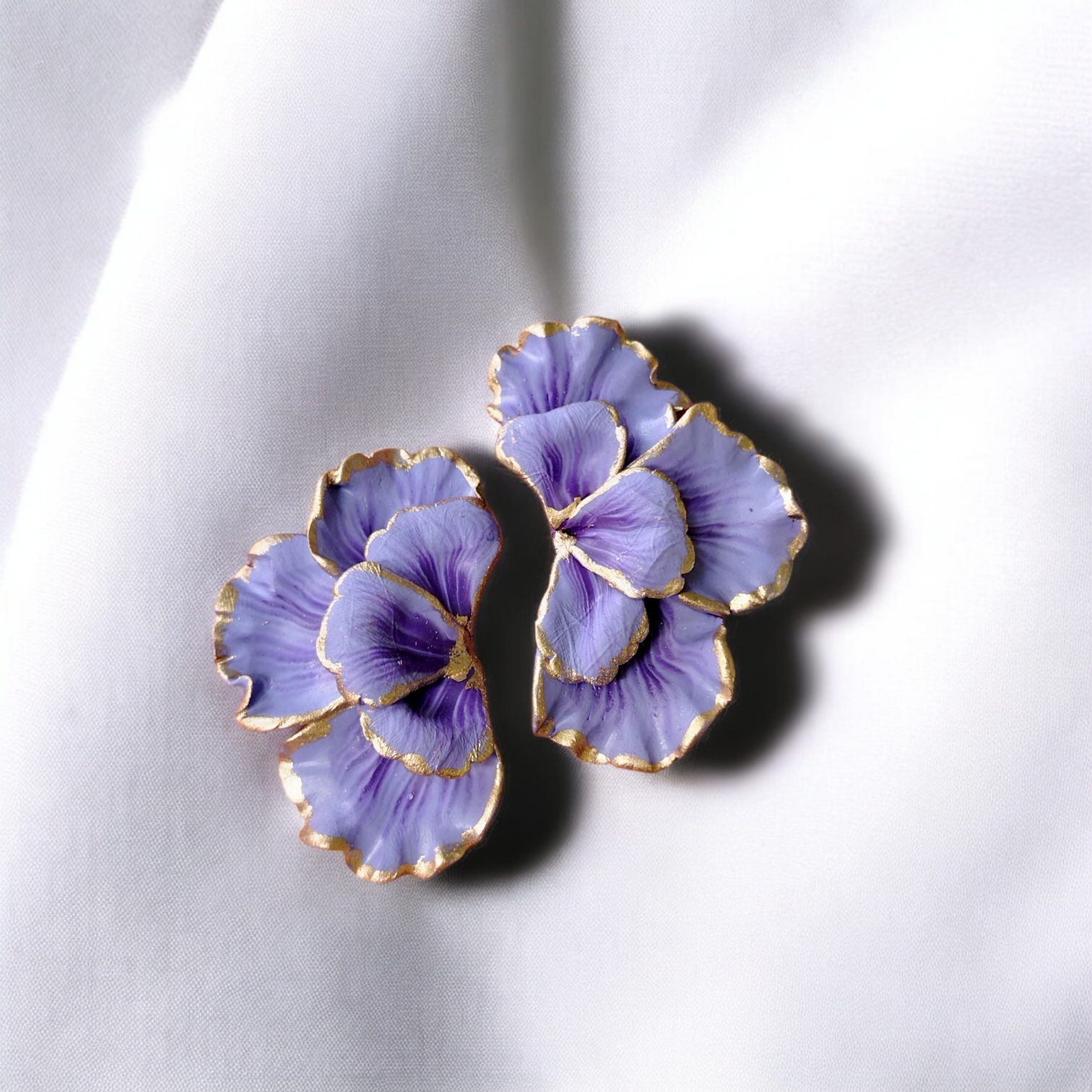 Elegant and artfully designed lavender flower stud earrings with a sophisticated gold leaf rim