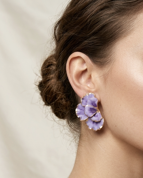 أقراط “بريمة” (Studs) أنيقة مصممة فنياً على شكل زهرة اللافندر مع حواف متطورة من ورق الذهب