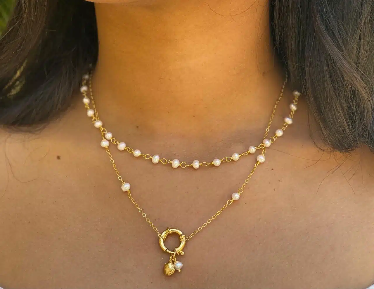 Pure 925 silver platted in 18K gold with the addition of real pearls layered Necklaces.