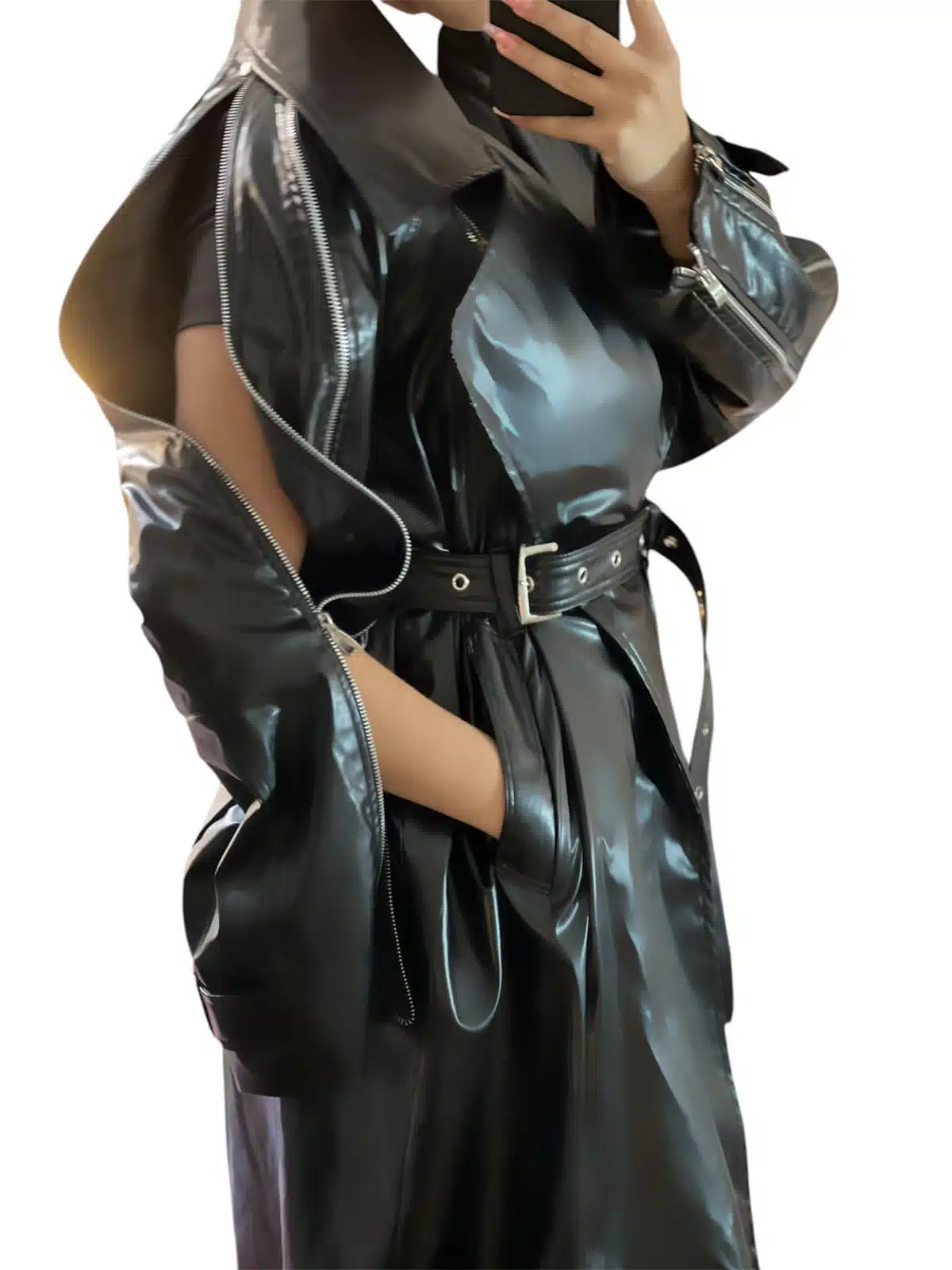 Edgy and bold, this high-shine leather coat features statement zippers, a belted waist, and a futuristic silhouette for a striking look. Available in four stunning colors: Burgundy, Black, Red, and Burnt Orange.