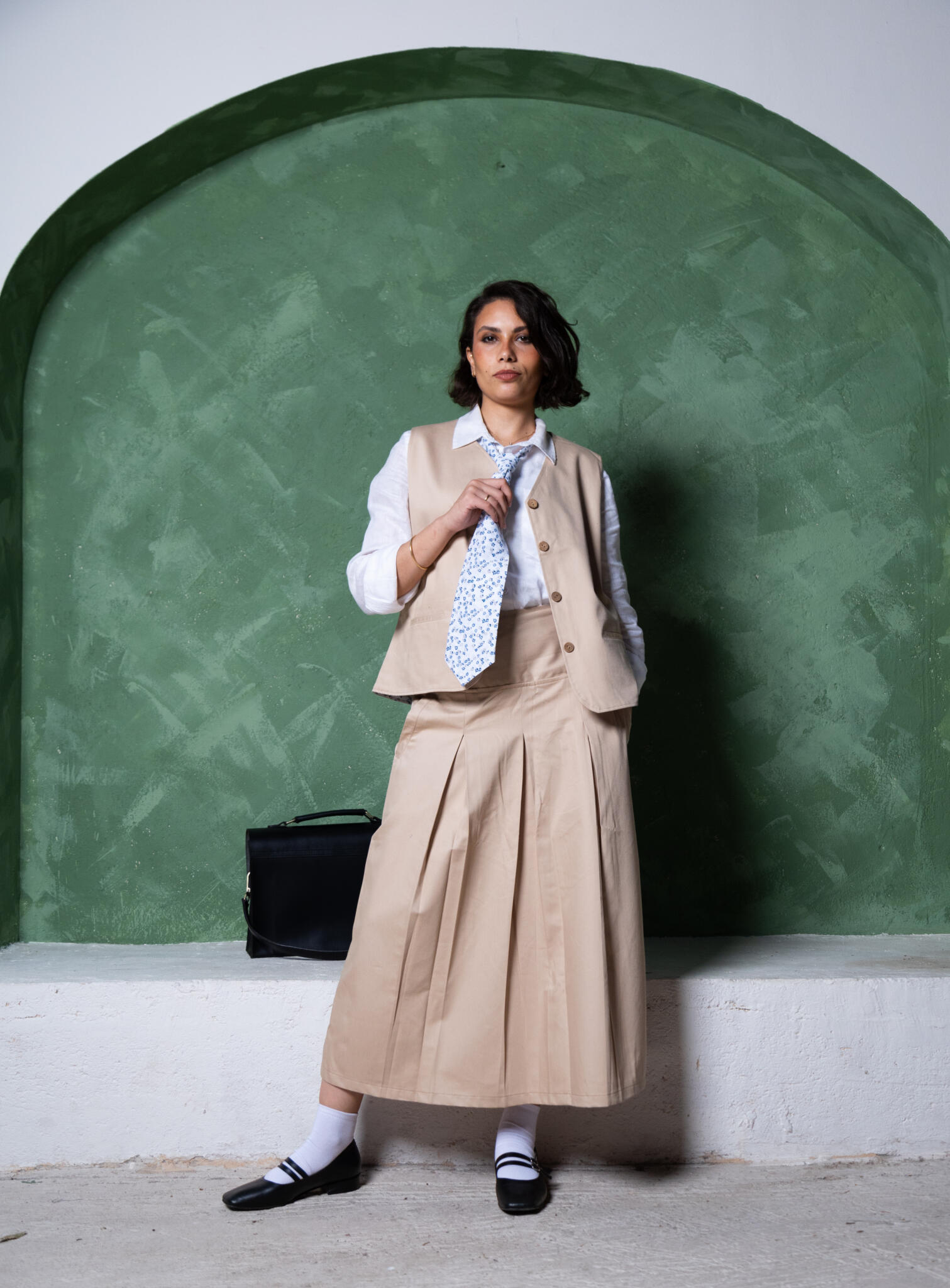 Effortlessly graceful, the Leila Skirt flows to the ankles in pure Egyptian cotton. Three soft pleats at the front and back create movement and structure, while side pockets and subtle button closure add functional ease. A versatile piece that embodies understated sophistication.