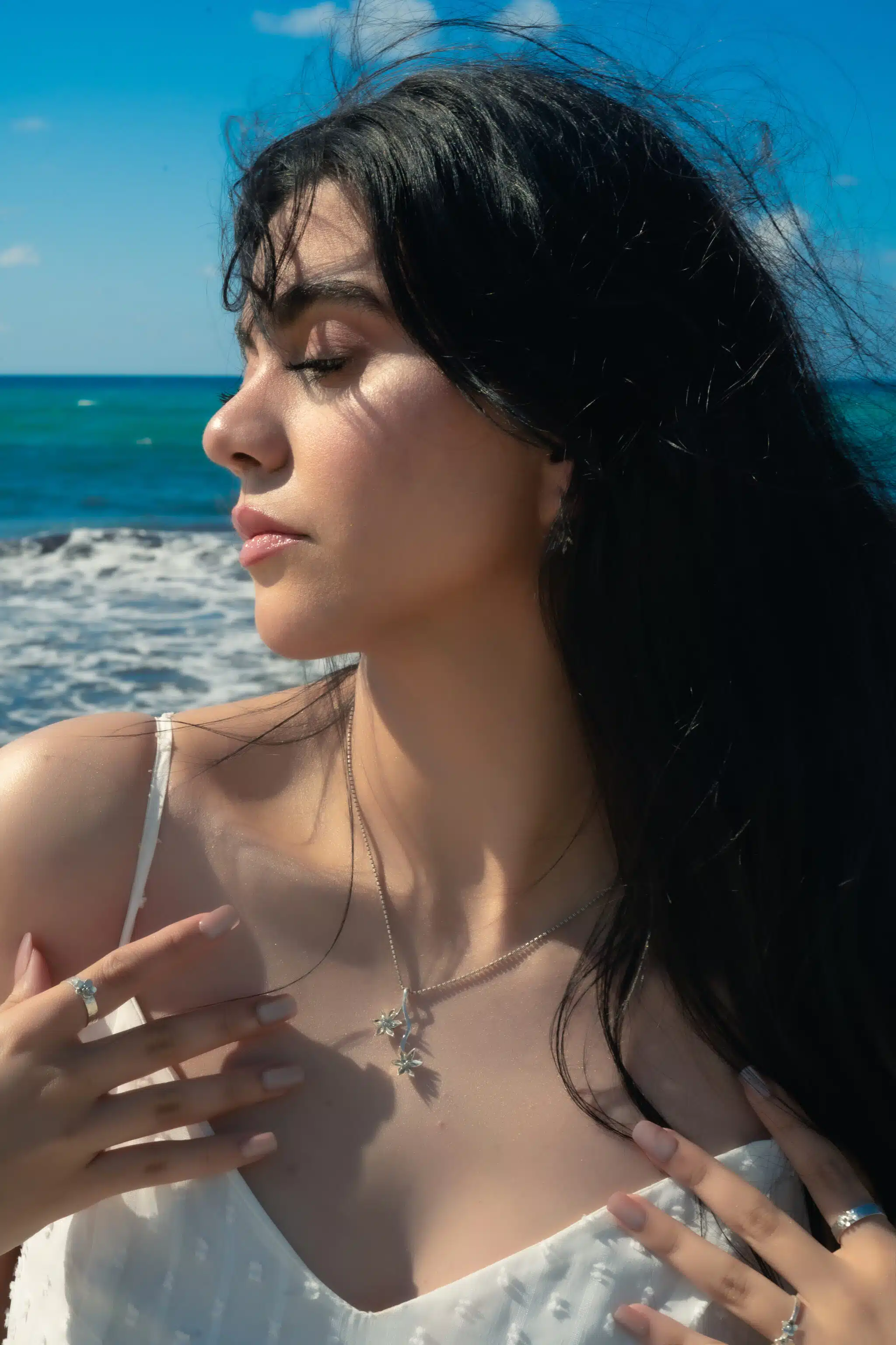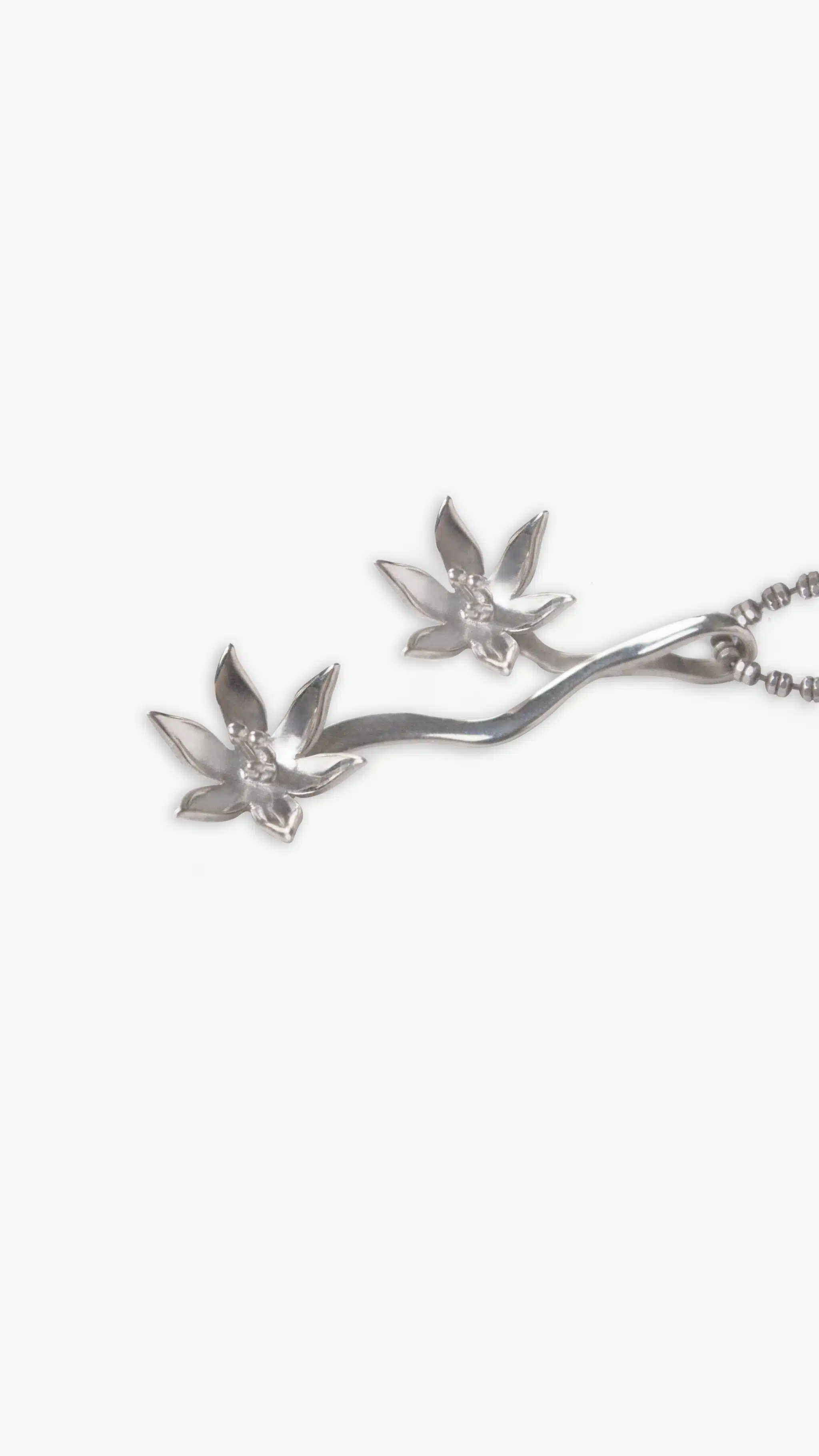 This silver pendant features a graceful, organic design inspired by blooming lilies. Two flowers rest delicately on a curved stem, capturing movement and softness in polished sterling silver. It’s a piece that feels both natural and refined – perfect for adding a quiet, artistic statement to your look.