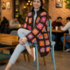 The cardigan is knee length with coloured squares