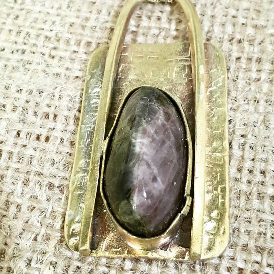 Hammered and oxidized lock-shaped pendant with tourmaline stone.