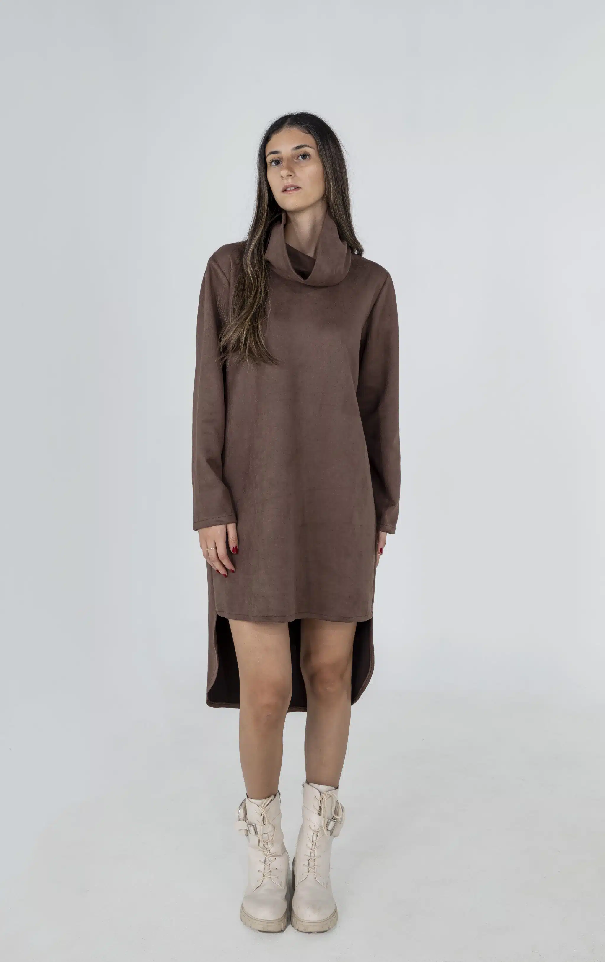 Brown short winter dress with long sleeves. Available in small, medium & large.