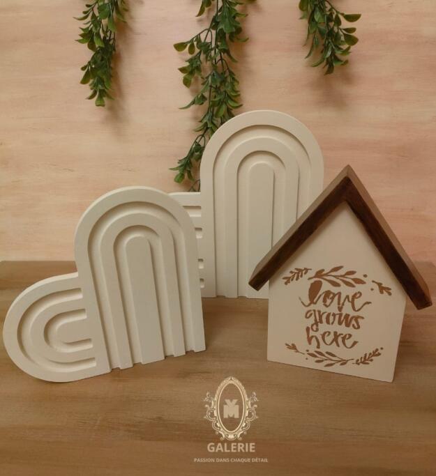 2 heart-shaped decorative accessories & wooden house