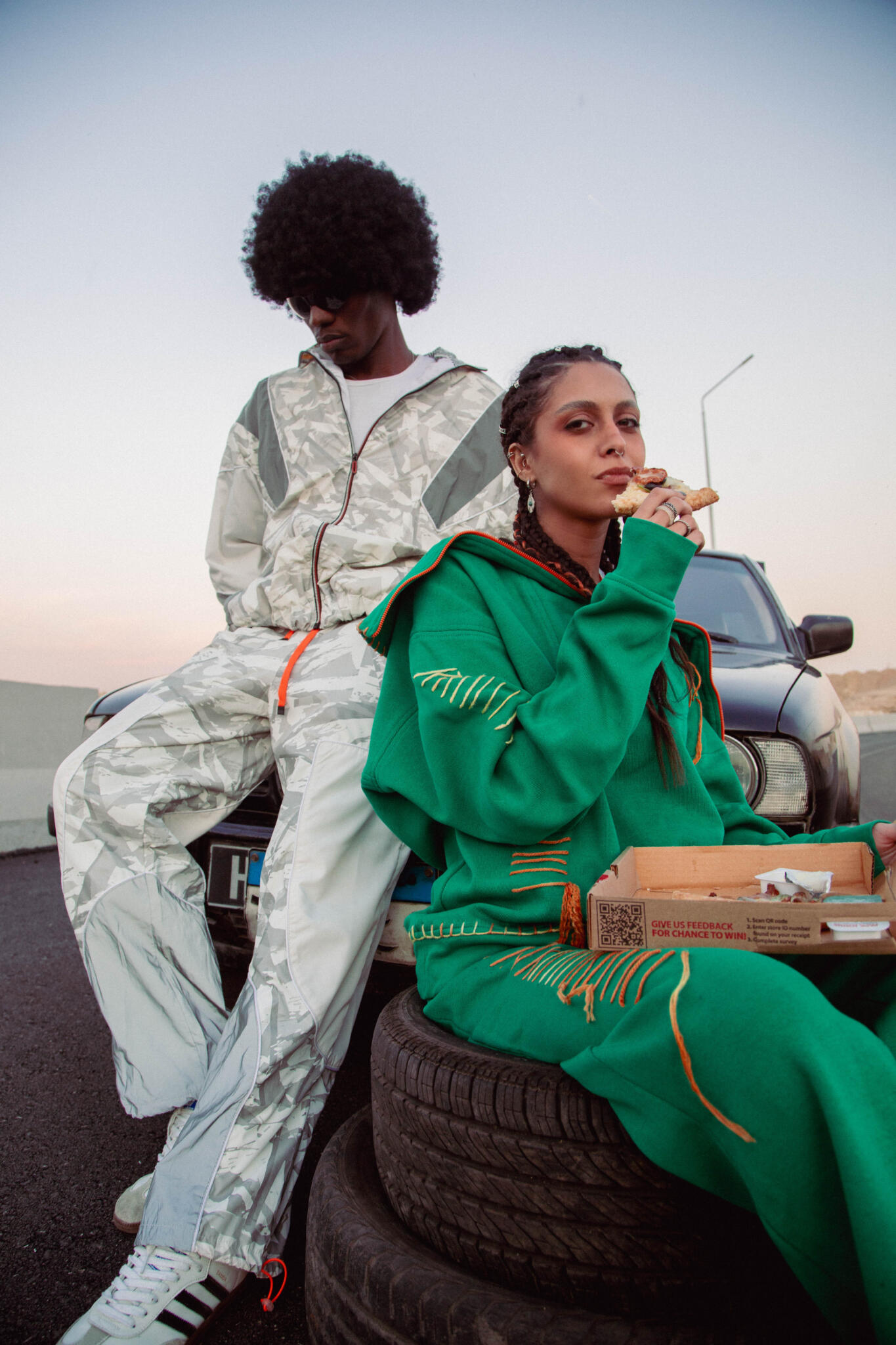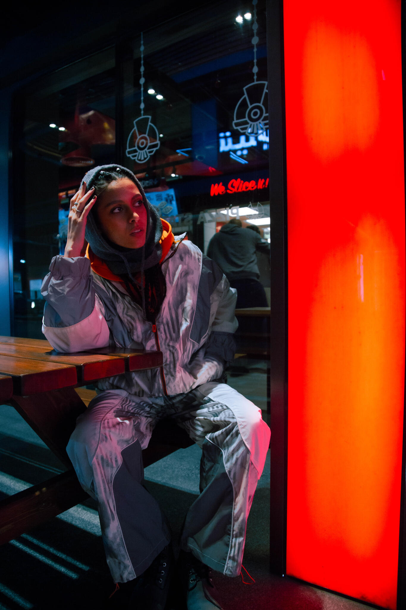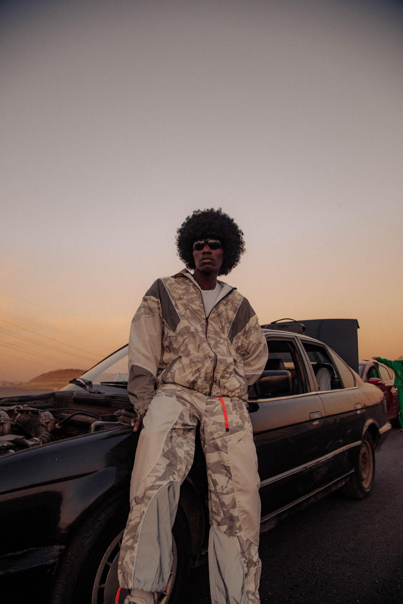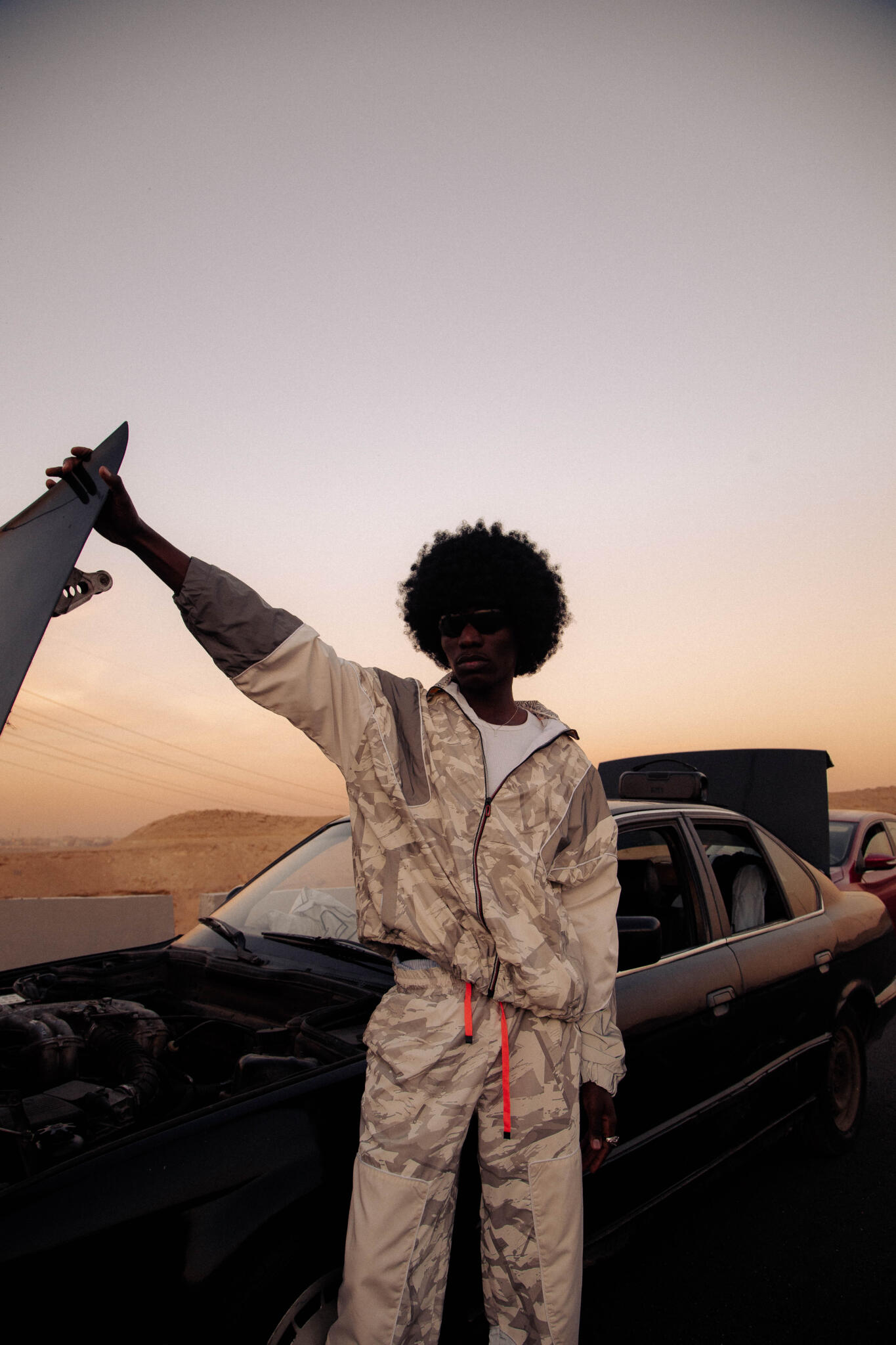 Waterproof pants crafted from waxed leather with a reflective finish. Designed with adjustable orange drawstrings at the waist and cuffs for a versatile fit — wear them relaxed or tapered for a bold utility streetwear look.