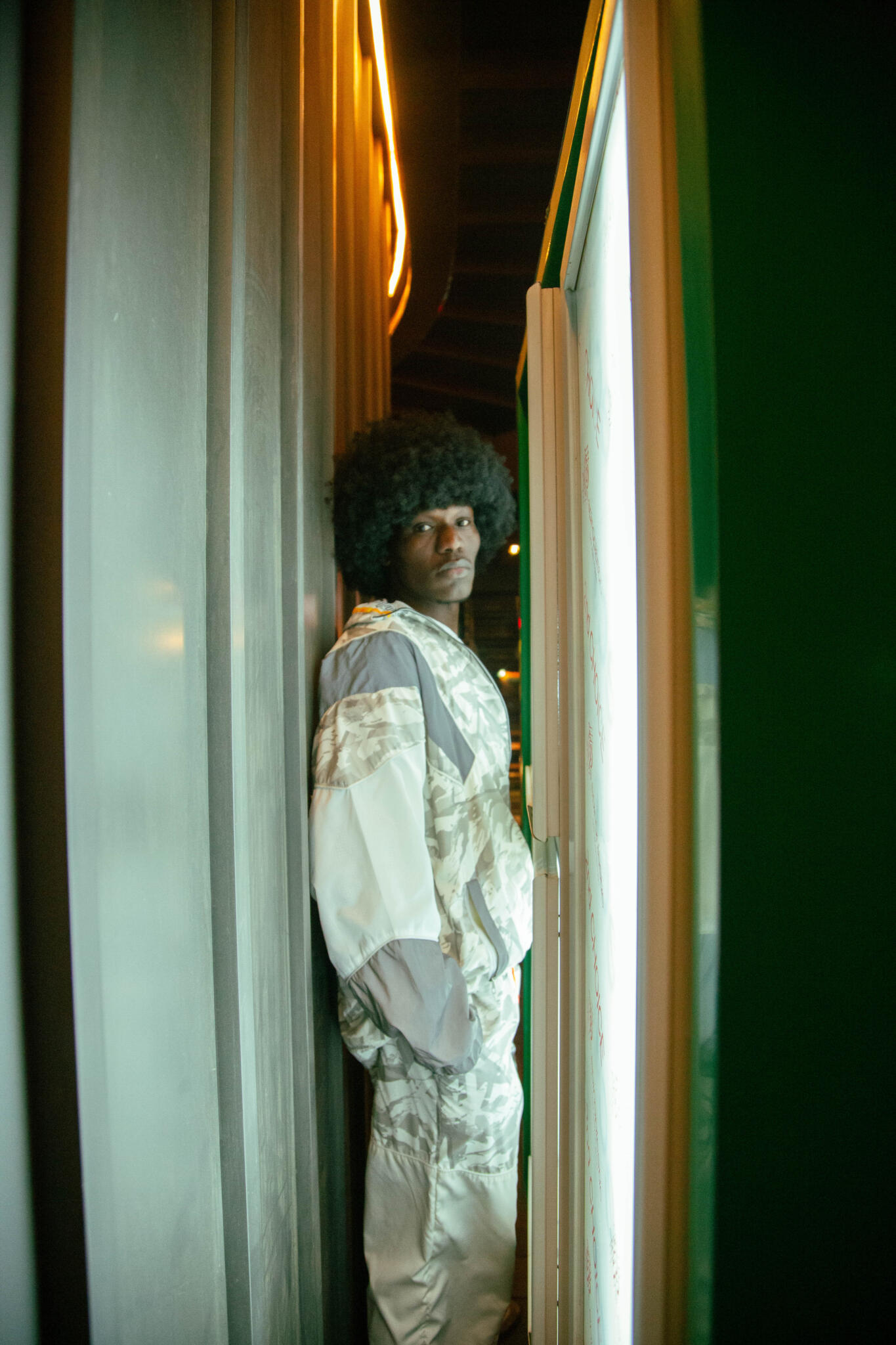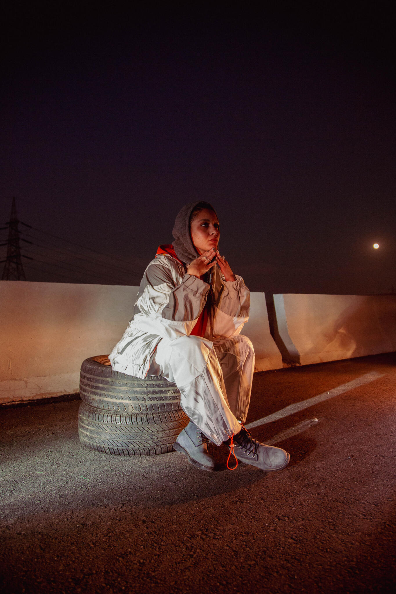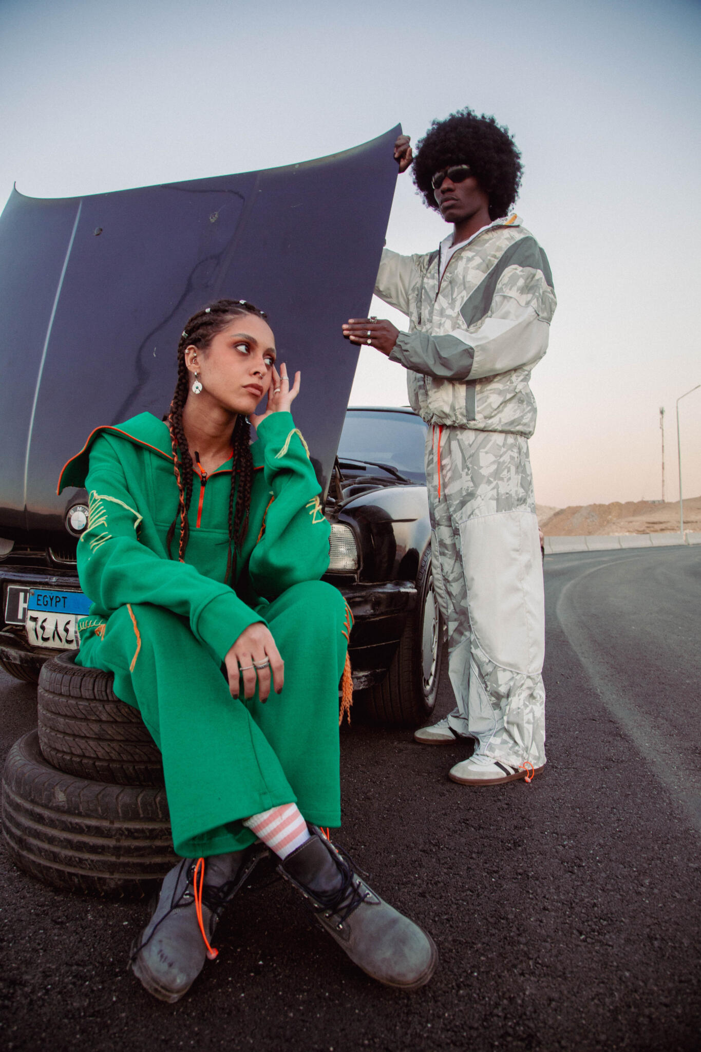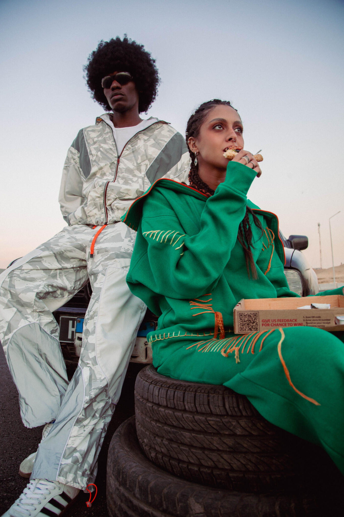 Waterproof pants crafted from waxed leather with a reflective finish. Designed with adjustable orange drawstrings at the waist and cuffs for a versatile fit — wear them relaxed or tapered for a bold utility streetwear look.