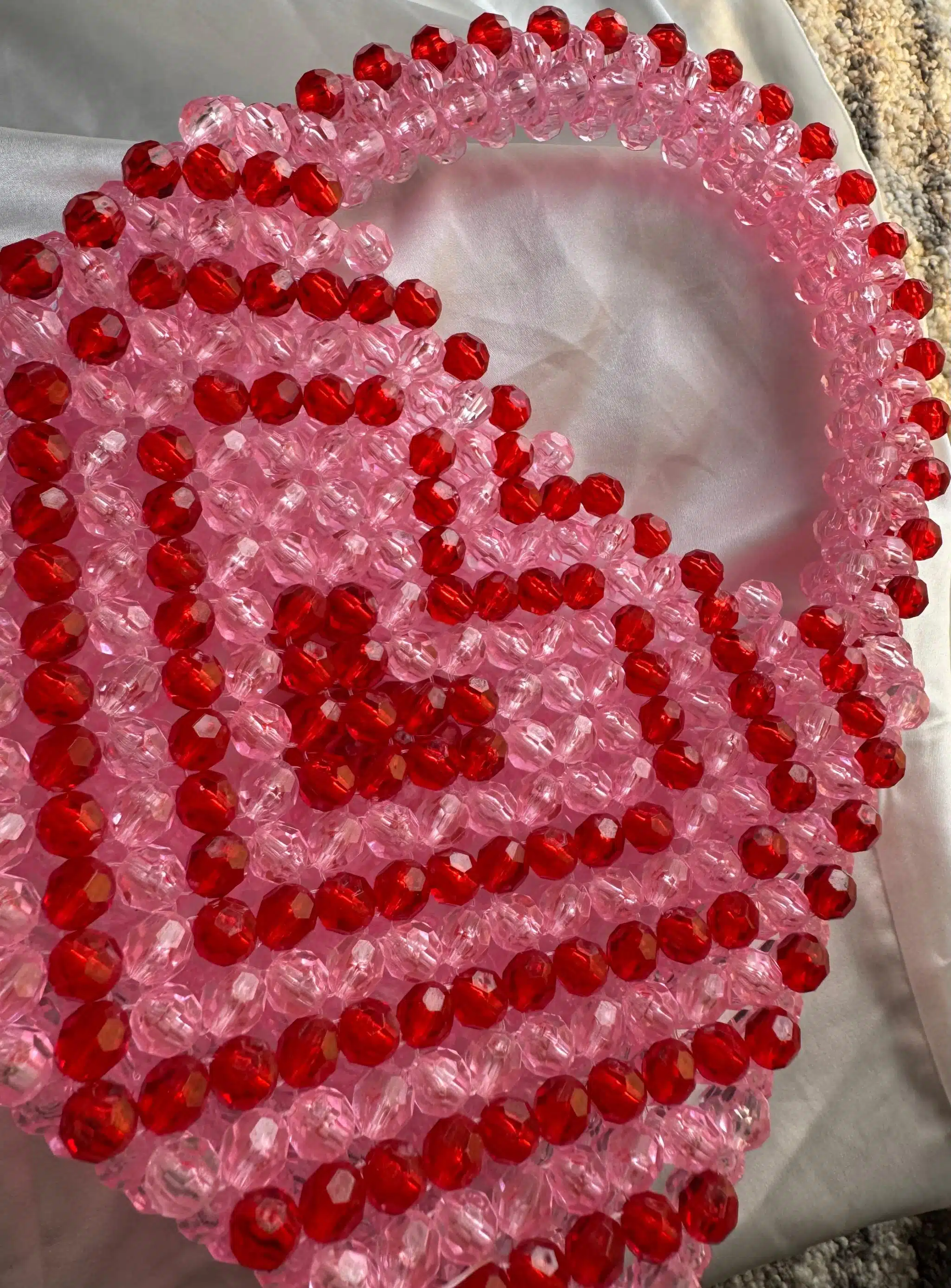 Lovingly Handcrafted: Each bead is carefully placed by hand, blending deep reds and soft pinks into a vibrant, artisanal design.