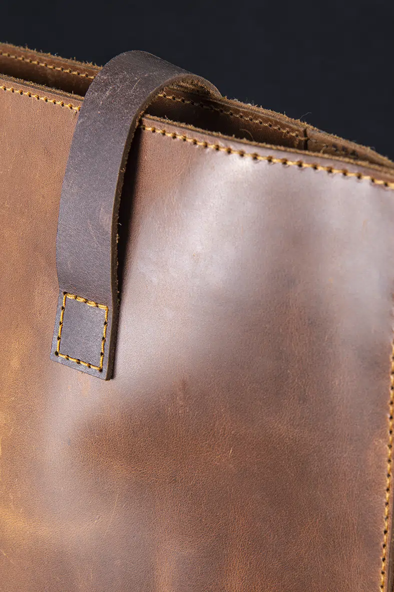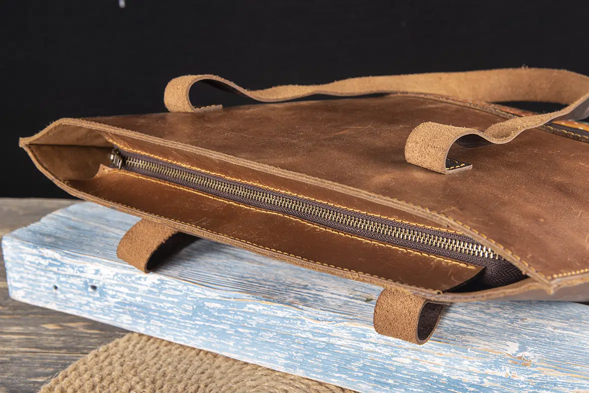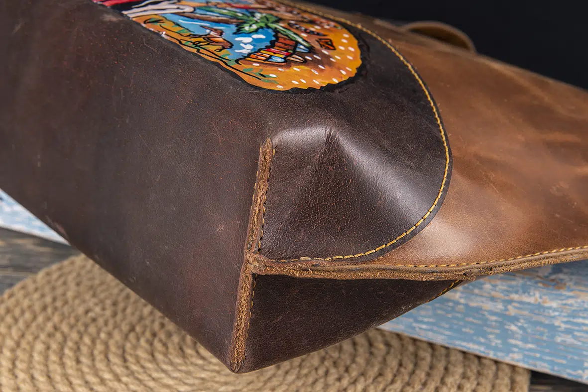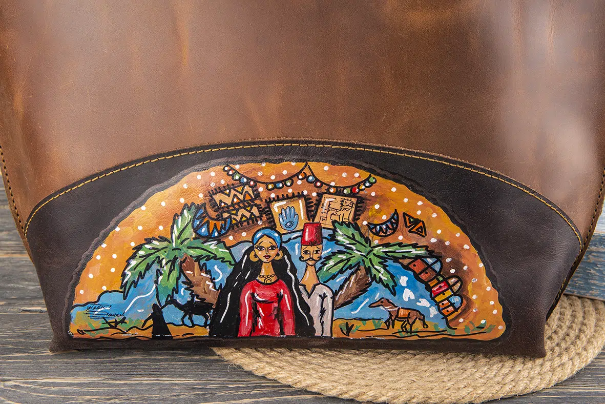 Add a touch of modern elegance with this handcrafted bag made from premium pull-up leather in a beautiful blend of havana and brown tones. Designed for practicality, it features a secure zippered pocket and is adorned with a hand-painted artistic motif that reflects authentic heritage.