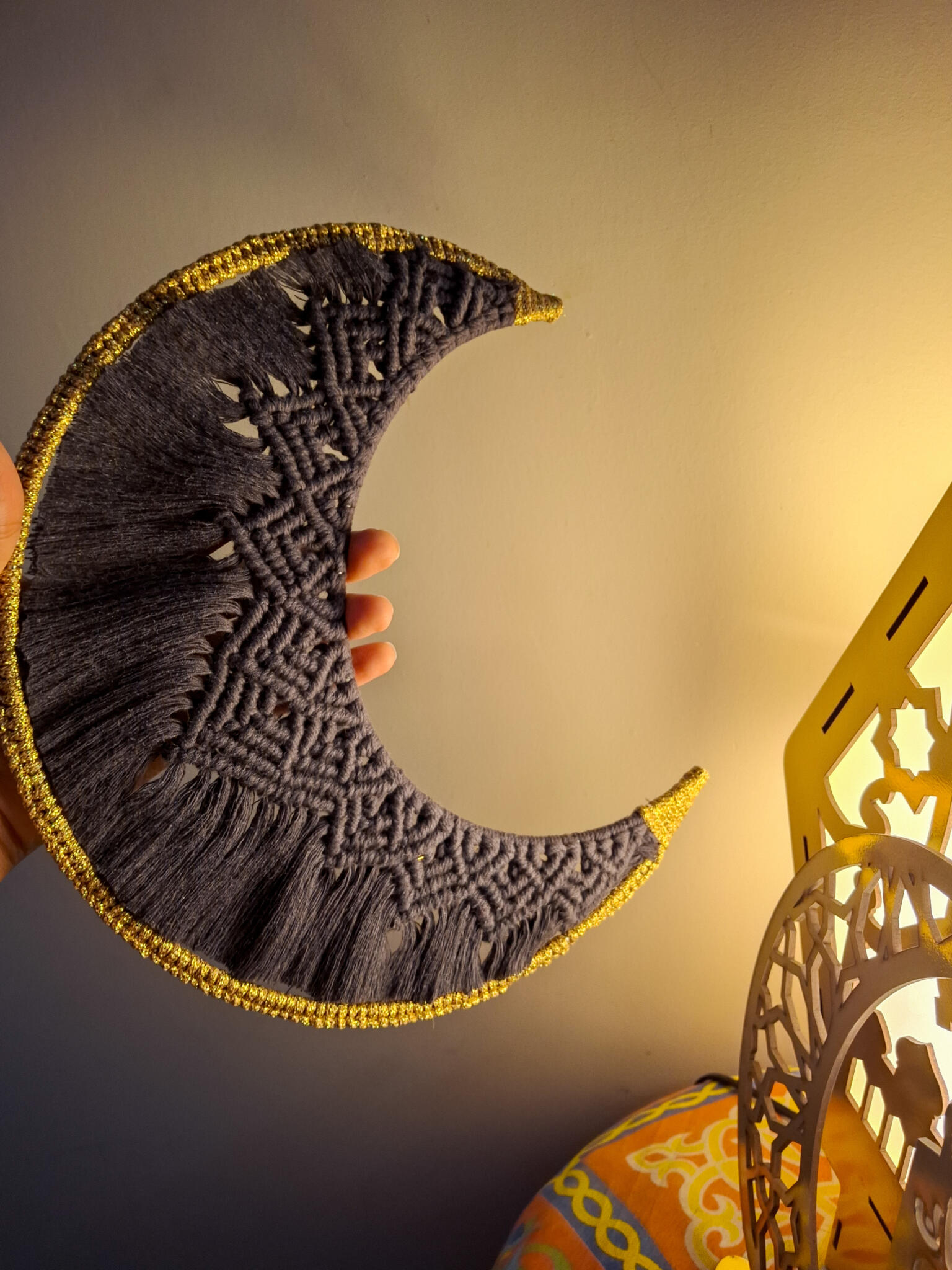 macrame moon grey and gold