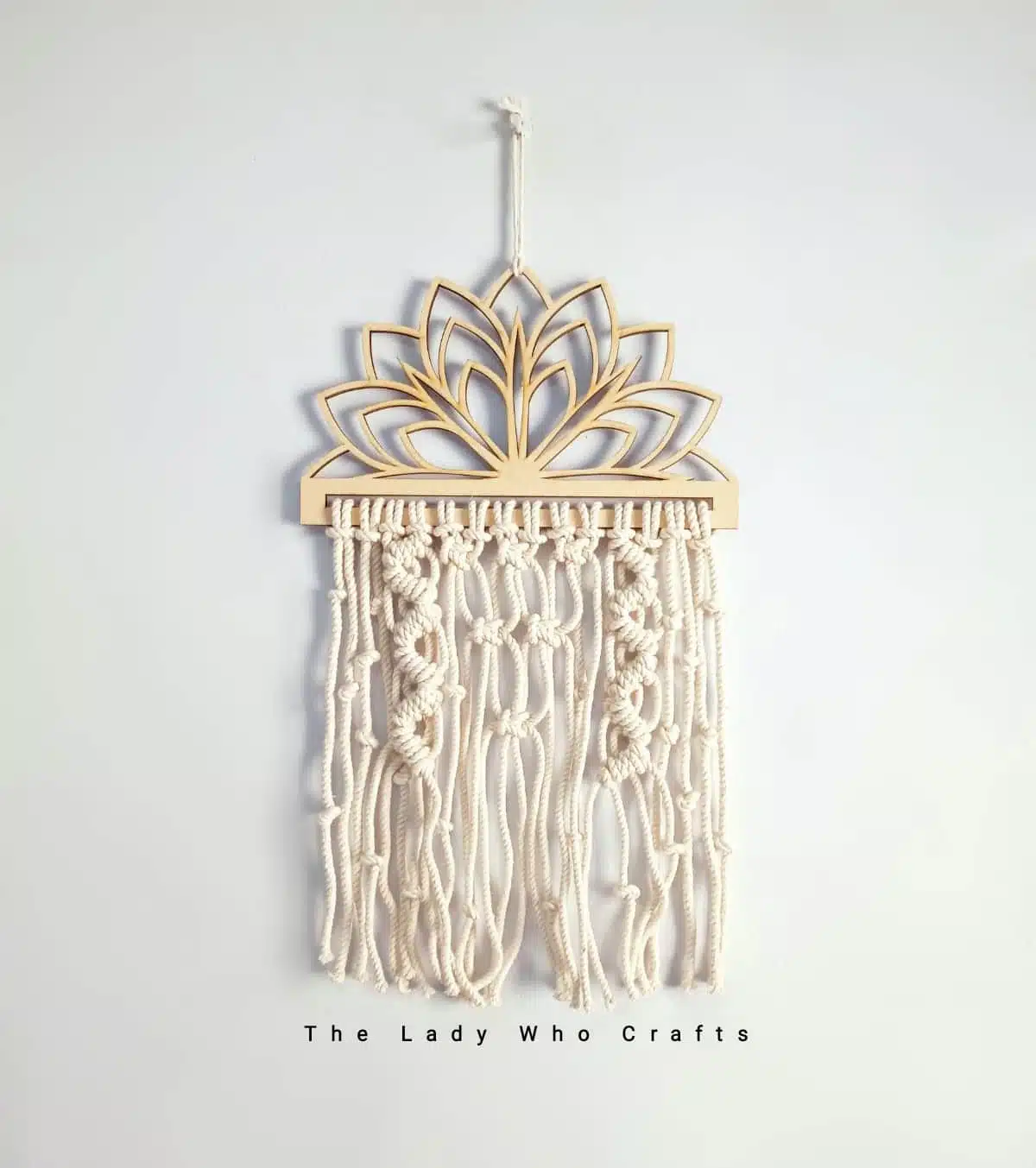 dimensions: 30*60 cm. Materials: wooden half flower, and cotton cords.