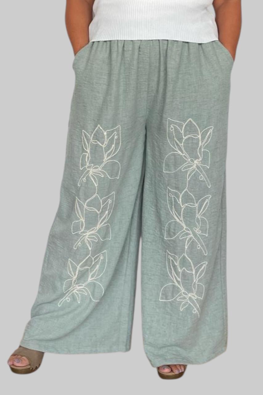 Effortless style meets everyday comfort. These wide-leg pants are crafted from a breathable linen-cotton blend, making them perfect for warm weather. Featuring delicate floral embroidery along the legs, they add a touch of artisanal charm to your look. The relaxed silhouette, elastic waistband, and side pockets keep them as functional as they are stylish — ideal for casual days, vacations, or weekend lounging.