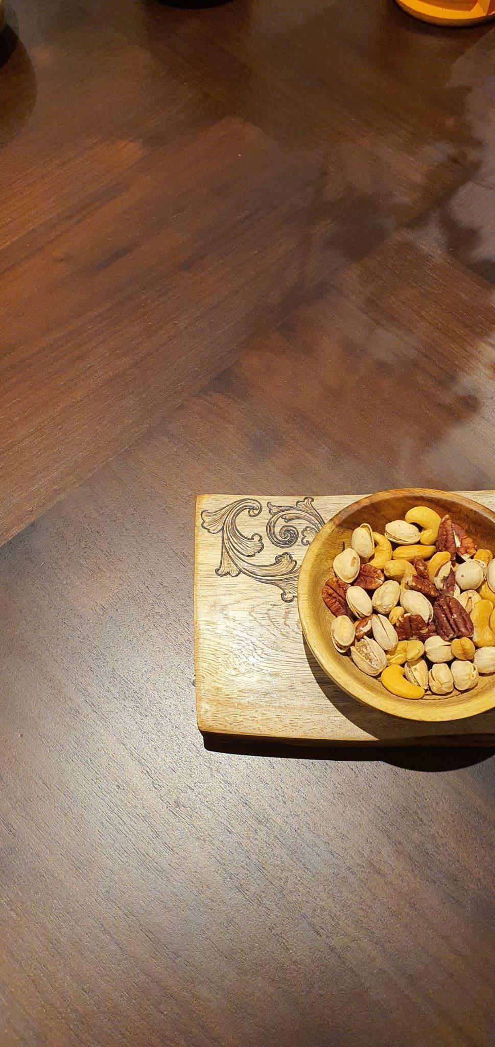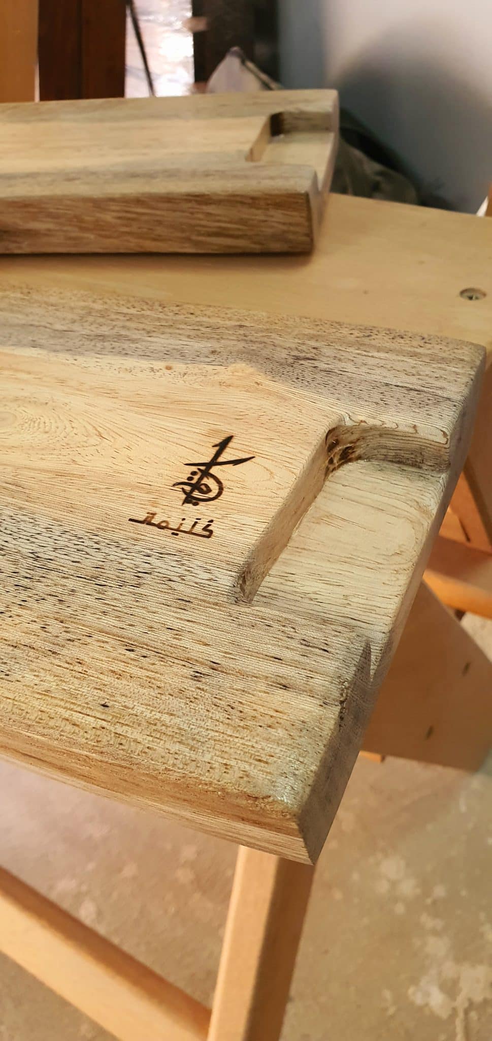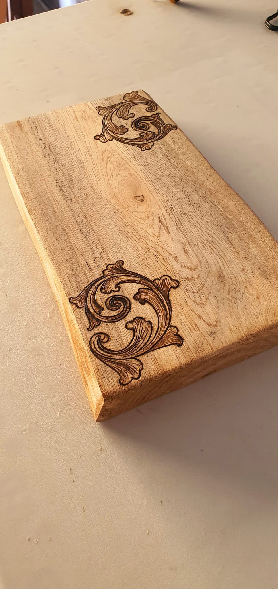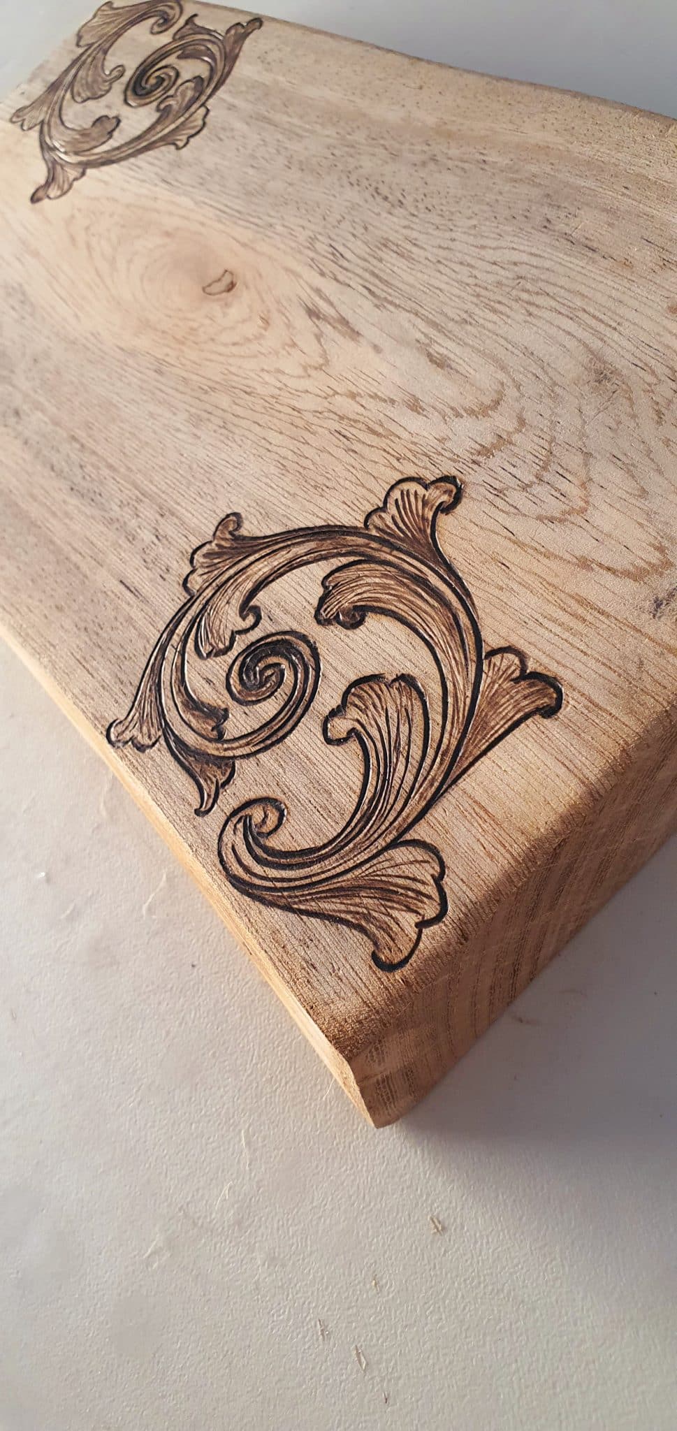 An elegant serving board, cut from a reclaimed tree slice with high protection, designed with a hand-burned unique pattern.