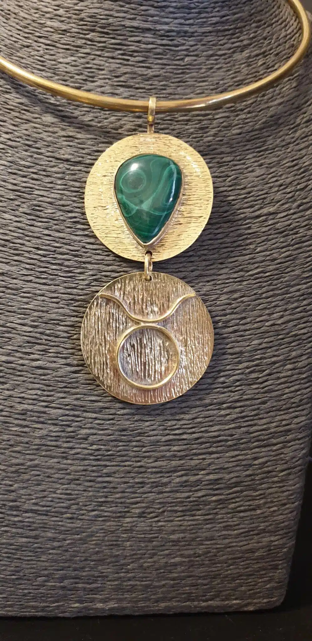 Necklace, bracelet and ring are textured copper with Taurus sign.