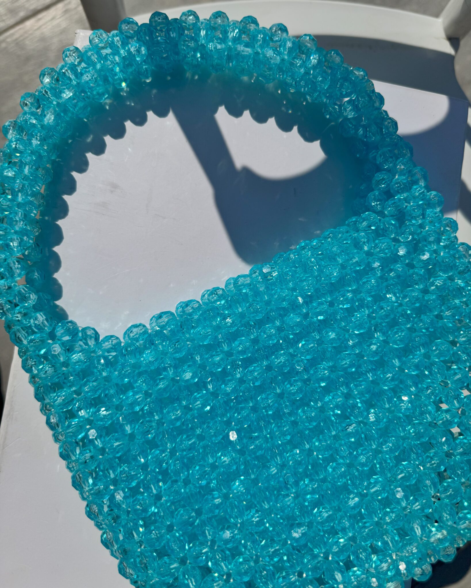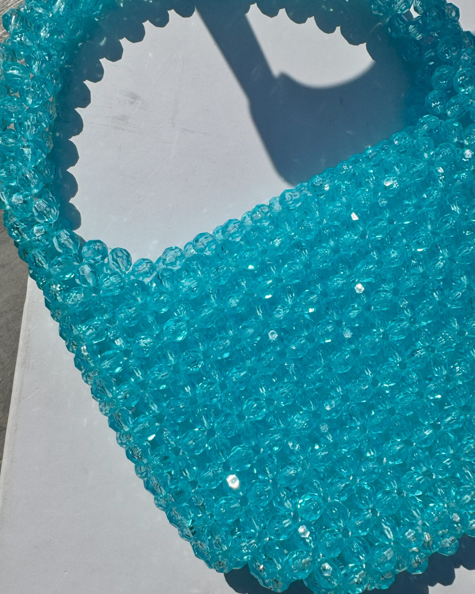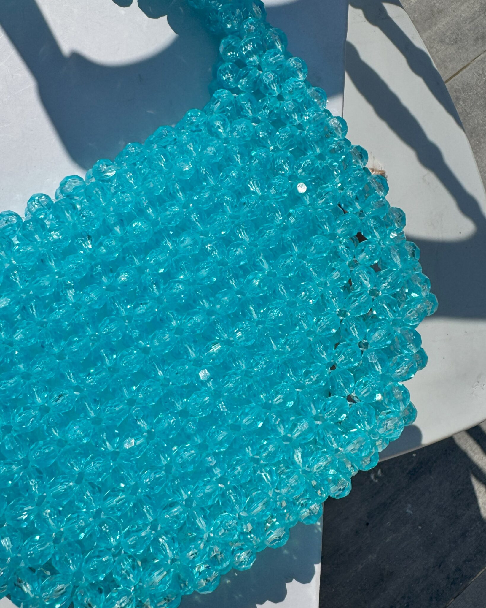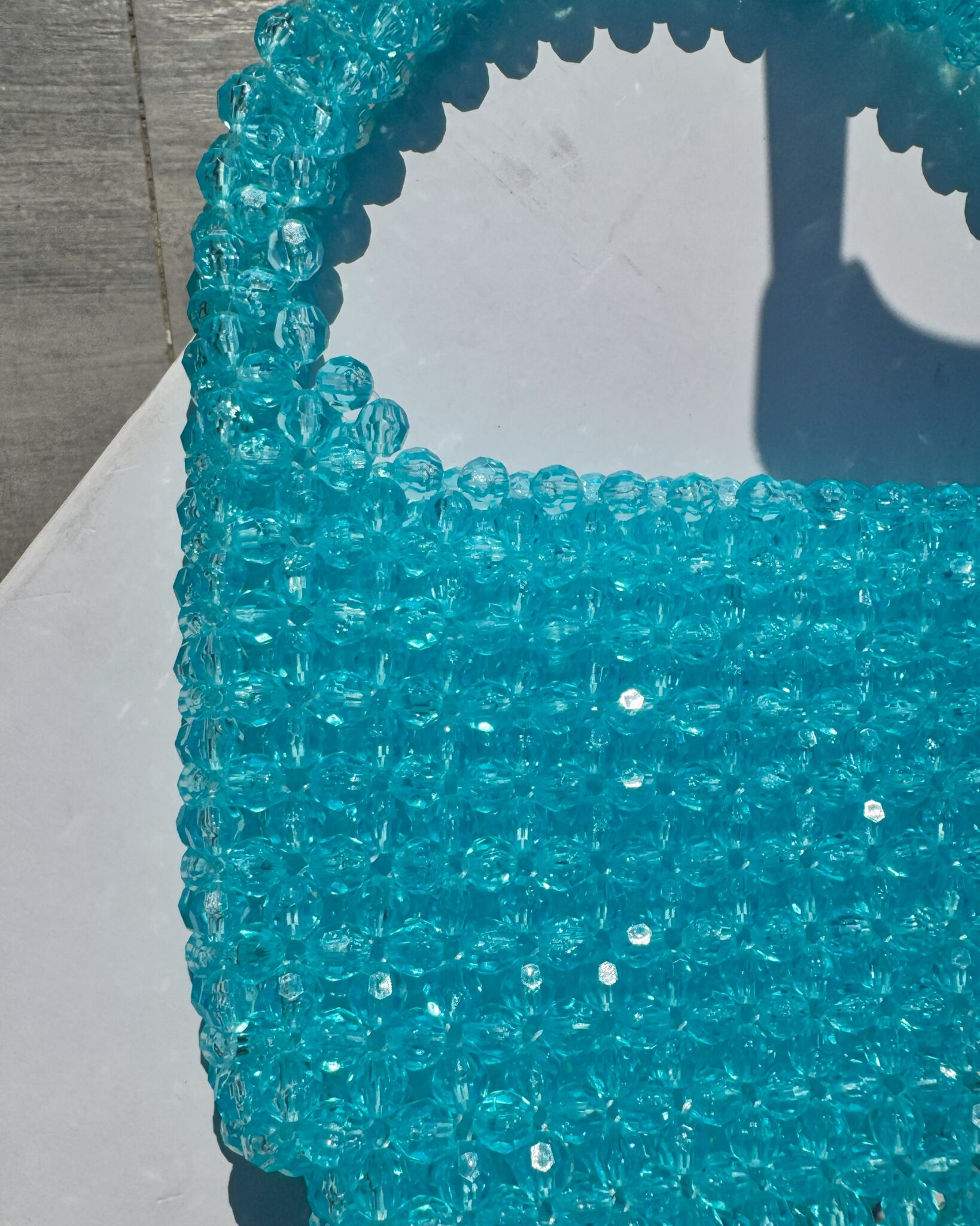 Make a statement with the Marcelle Bag—a sleek, structured piece handcrafted from glossy turquoise acrylic beads. With its curved silhouette and modern edge, it’s the perfect pop of color for sunny days, breezy nights, and everything in between.