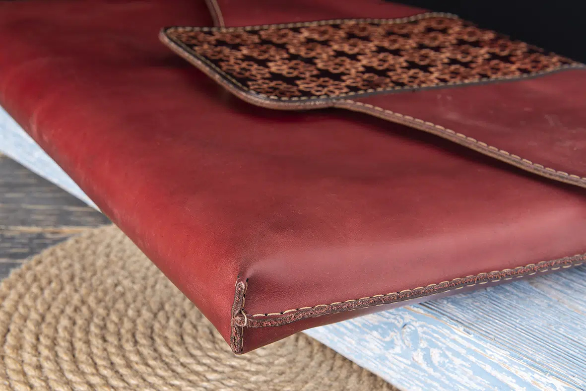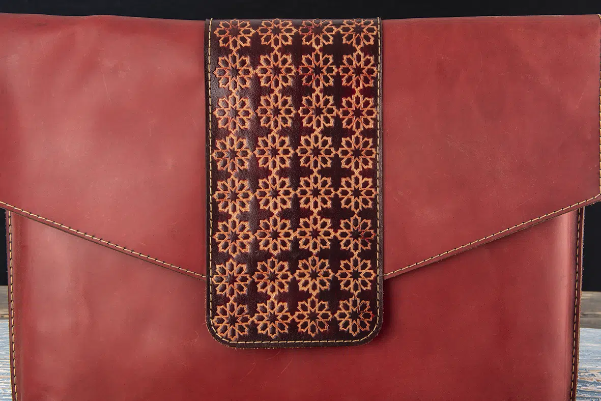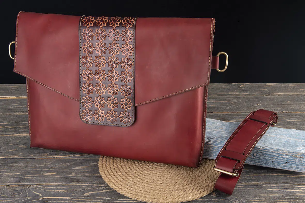 Handcrafted from premium pull-up leather, this deep burgundy laptop bag (42x32x4 cm) features exquisite hand-carved detailing and a sleek interior with a secure zip pocket. Comes with a detachable crossbody strap. Designed for sophisticated who appreciate class and craftsmanship.