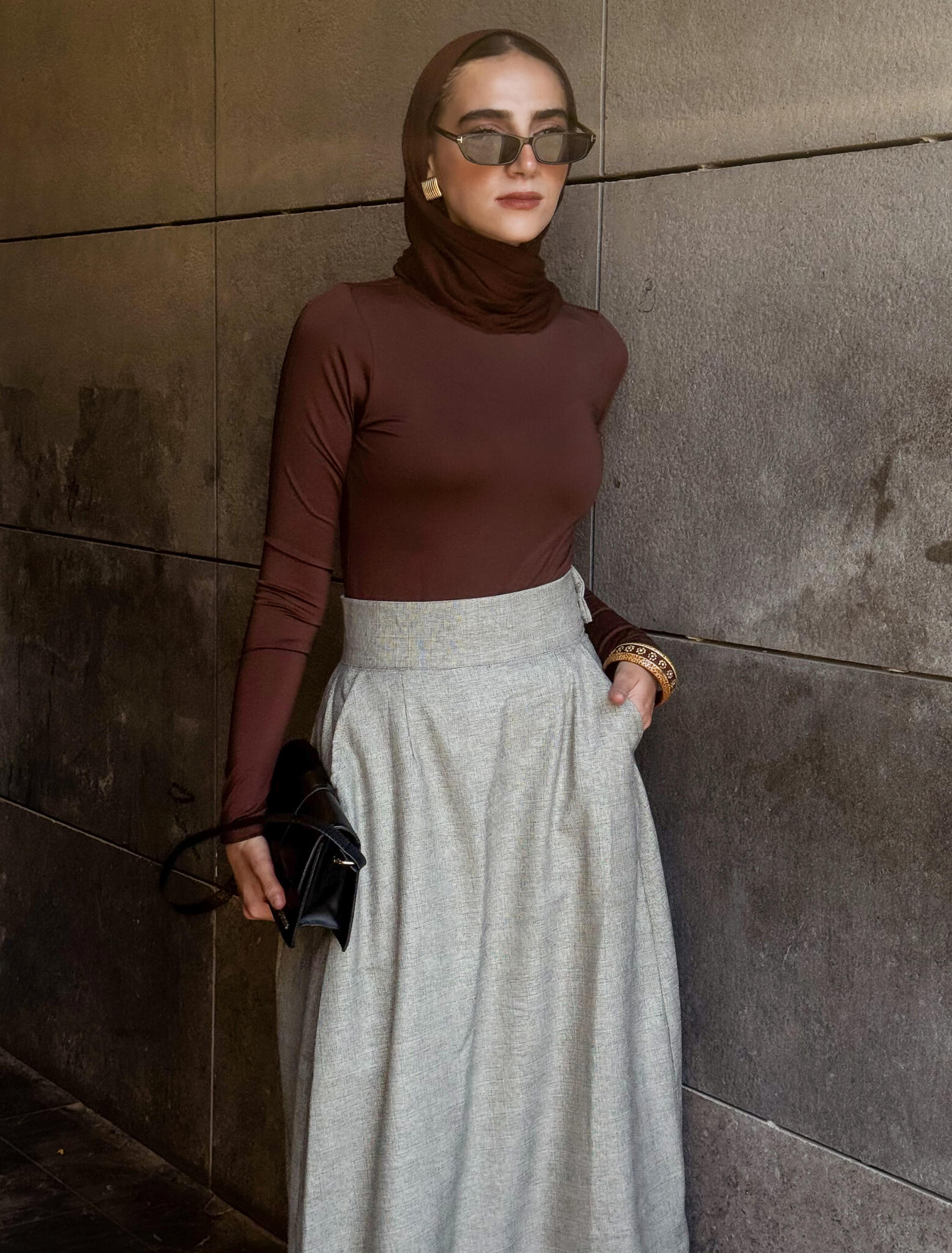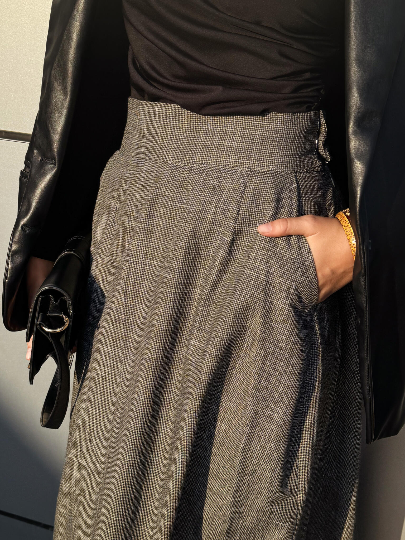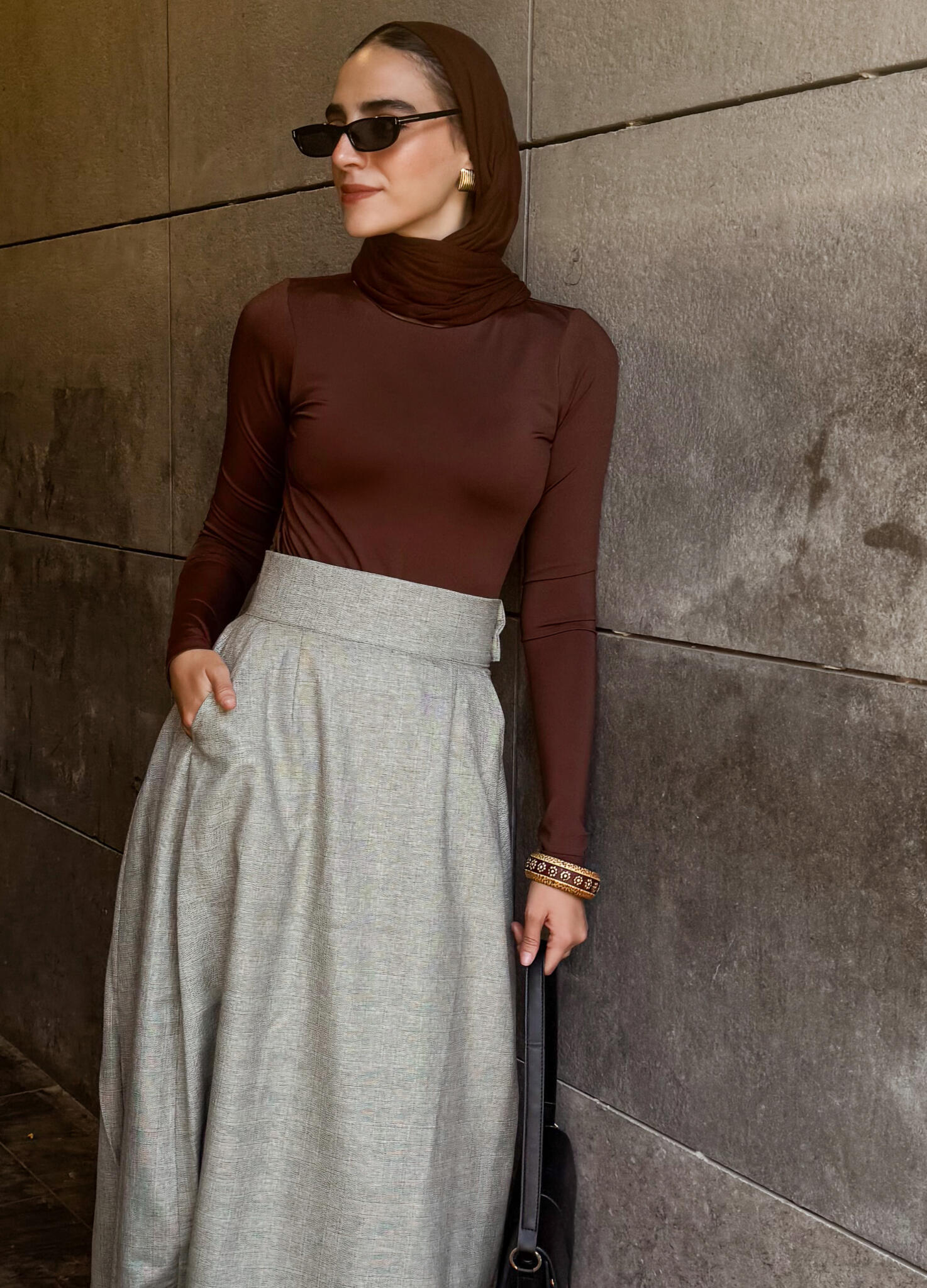 High-waist maxi skirt ,made from a wool-blend yarn. side pockets with side metal hook and zipper.