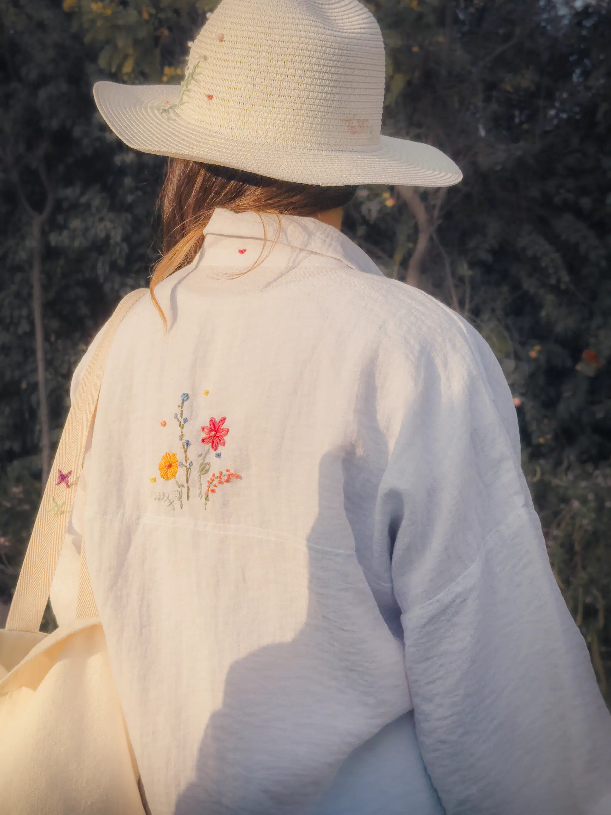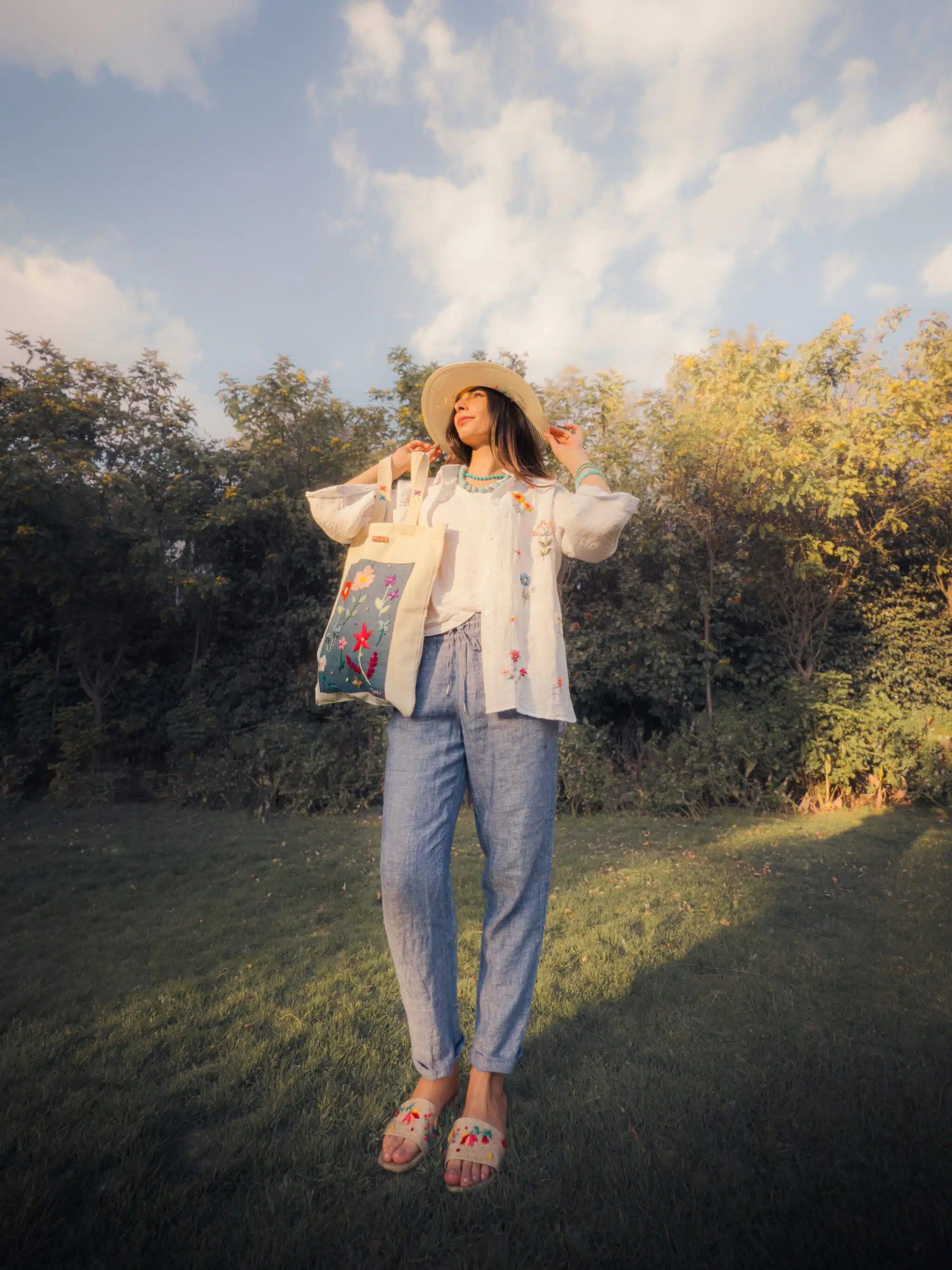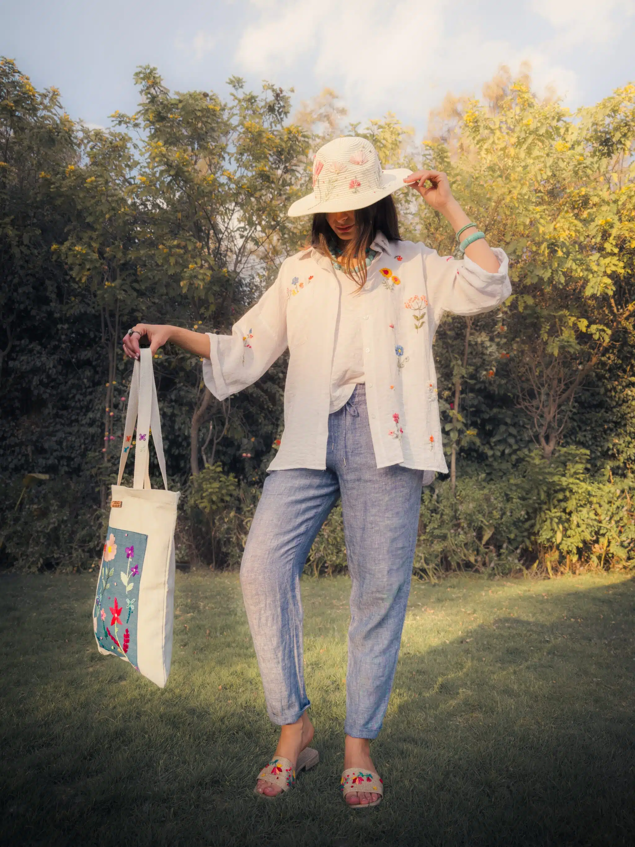 - Available products in photo: Denim patch tote, straw cowboy hat, linen slippers