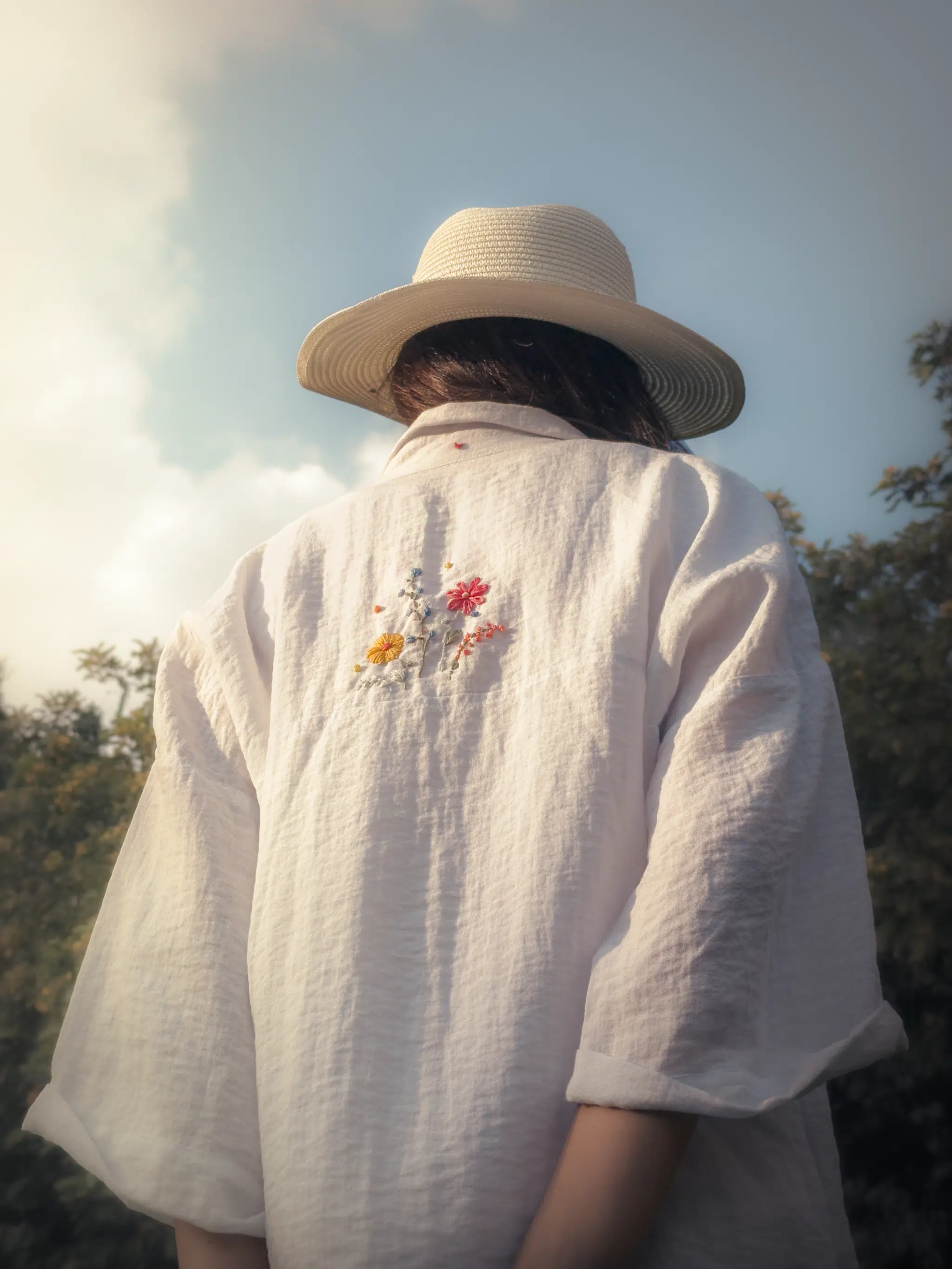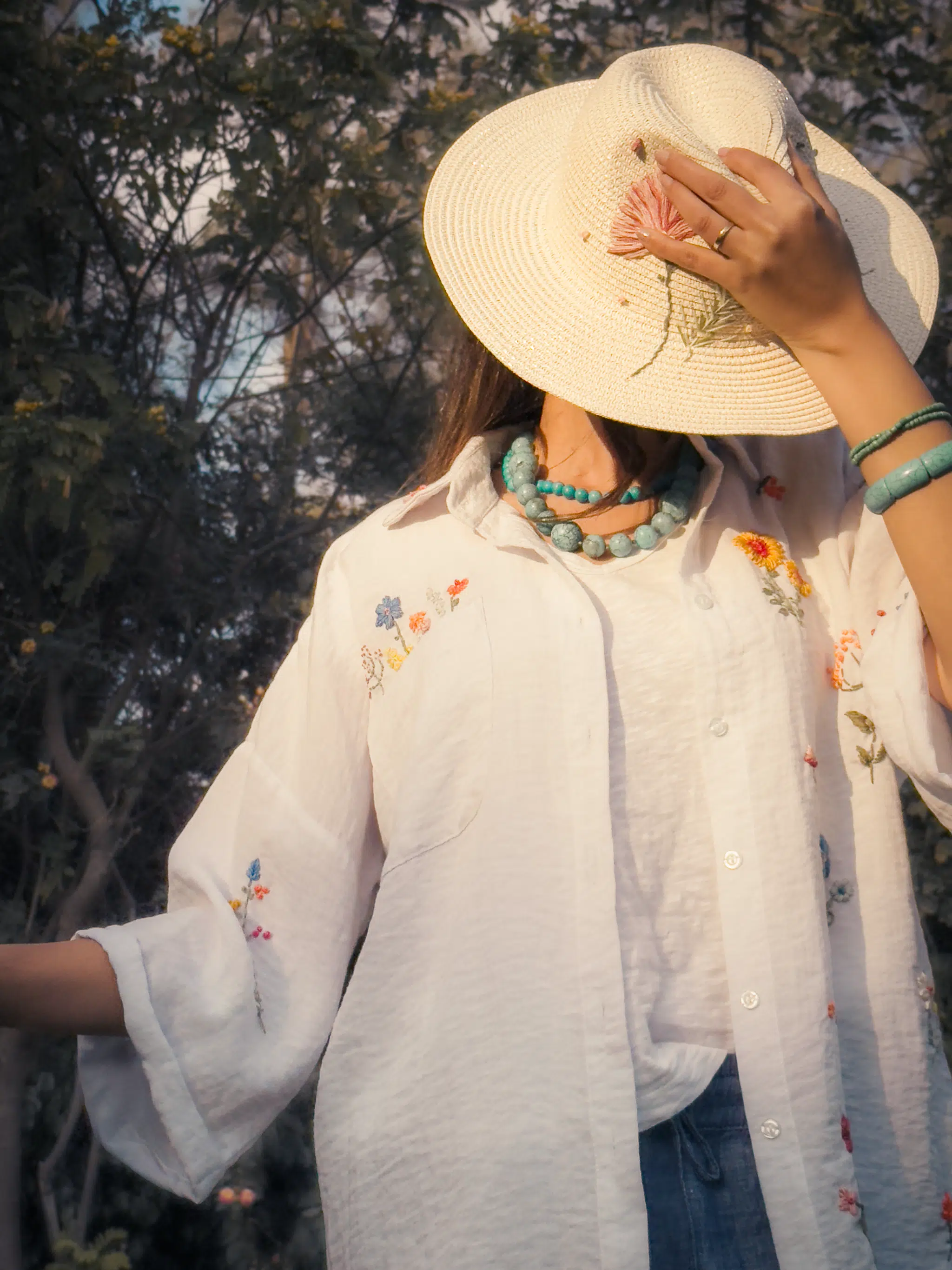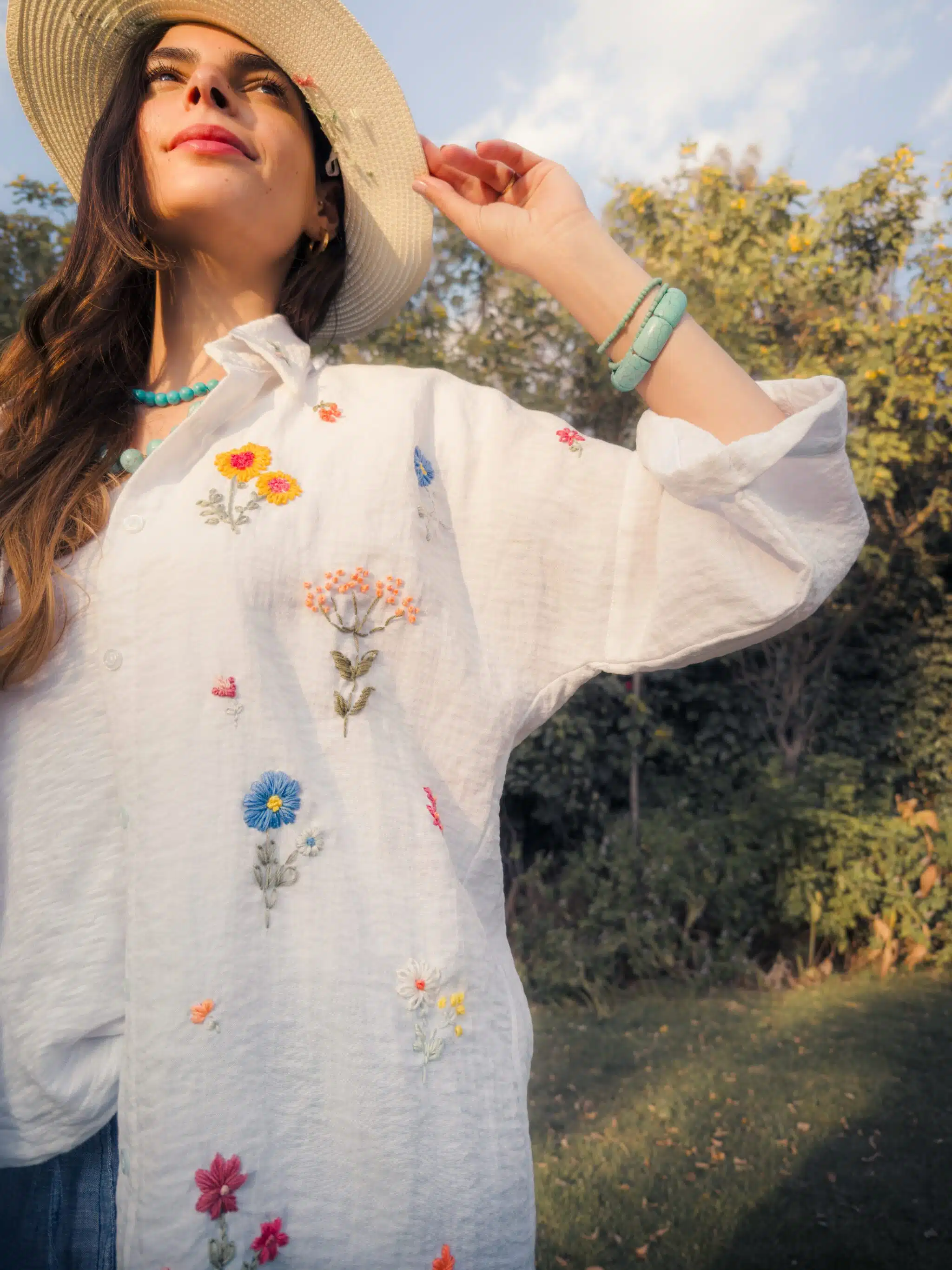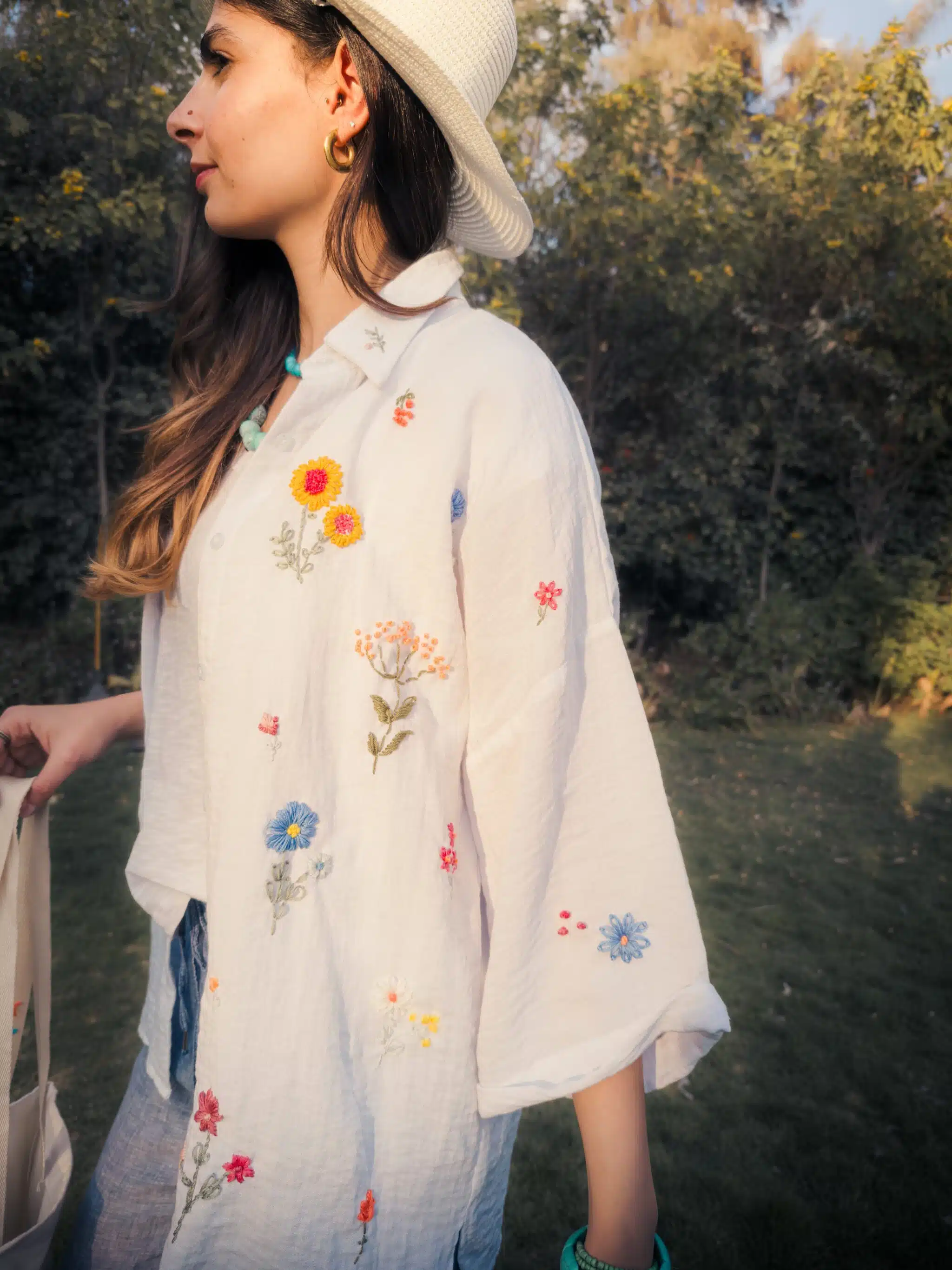 - Available products in photo: Denim patch tote, straw cowboy hat, linen slippers