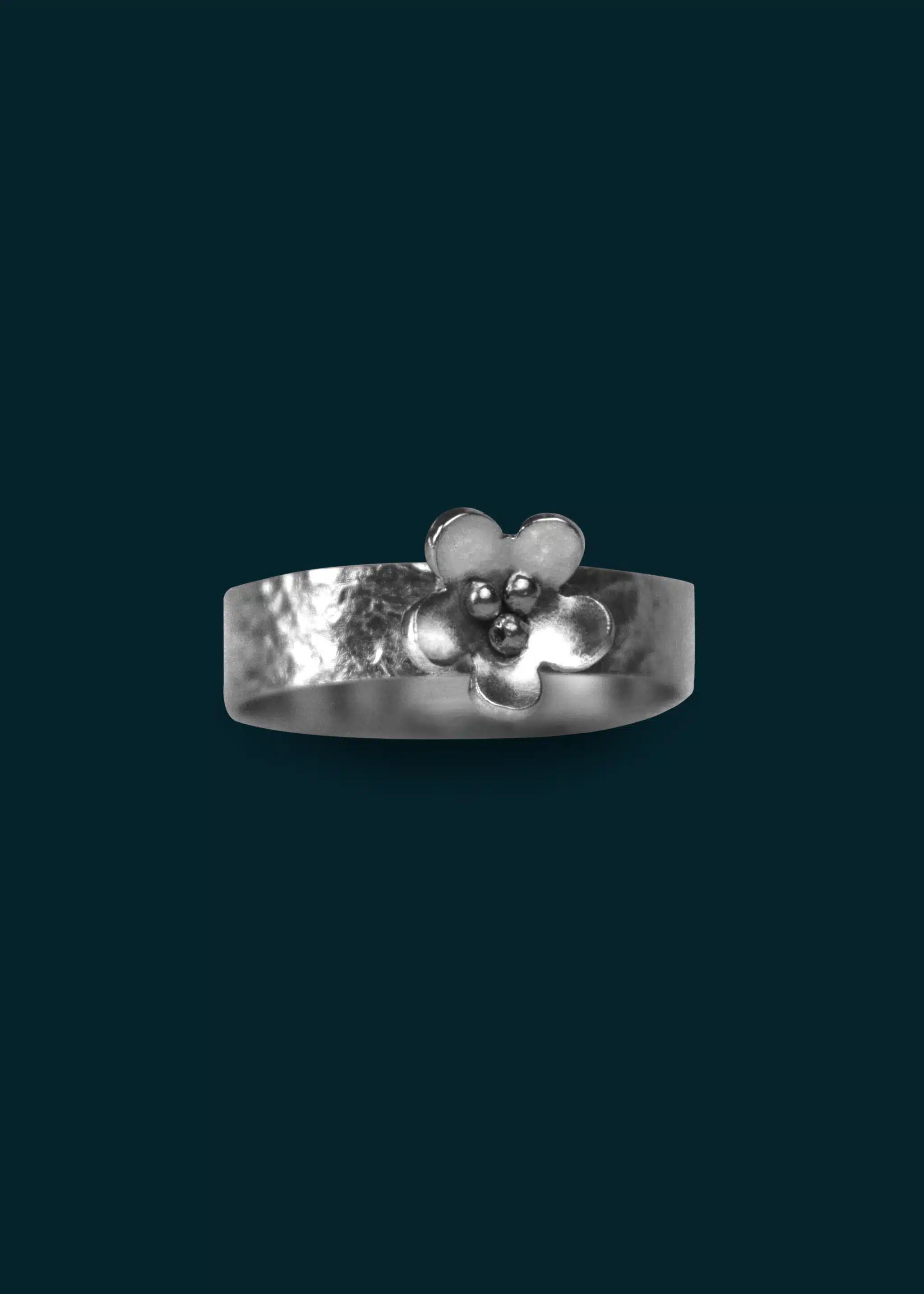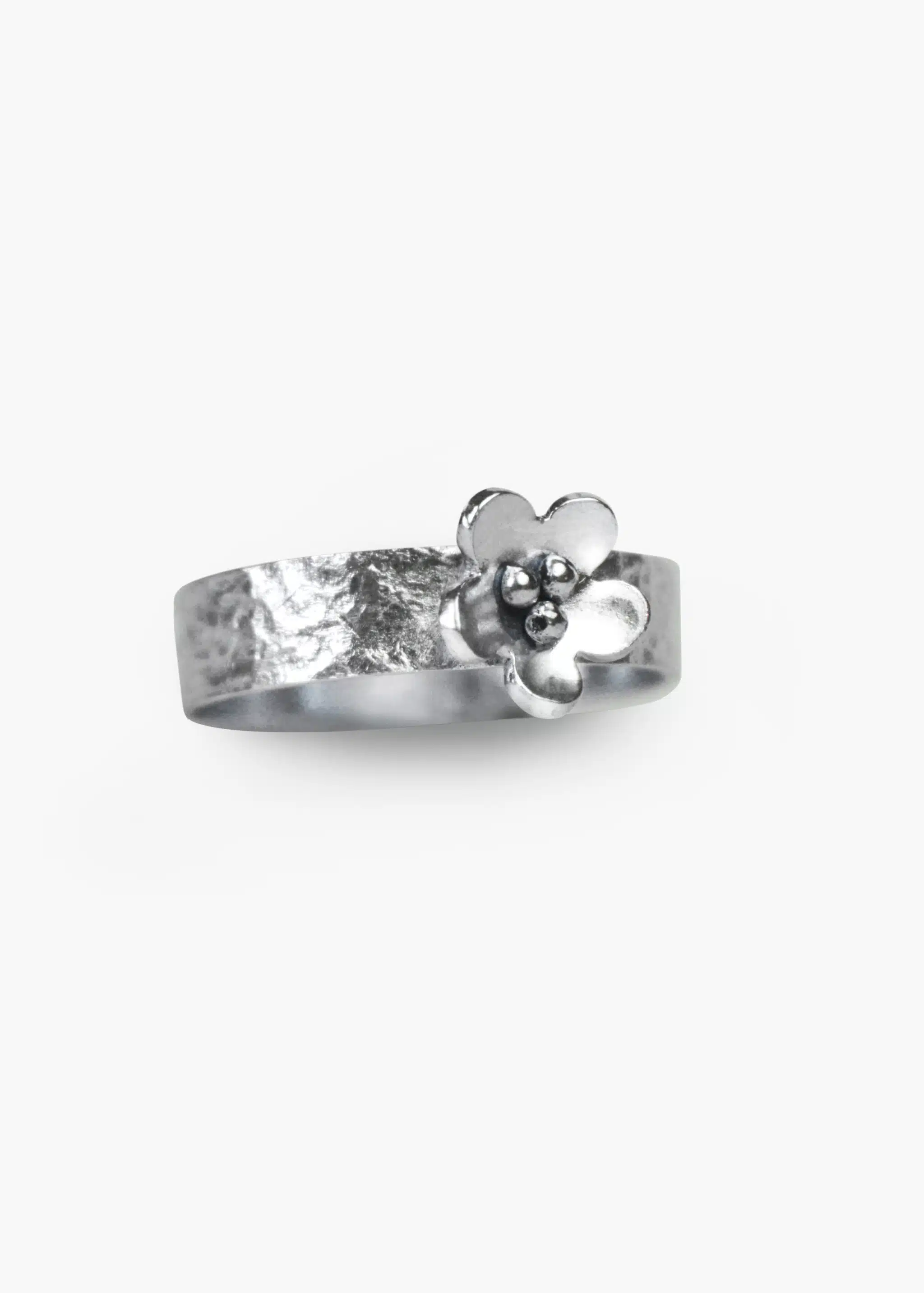 Silver band ring with a luminous texture and a delicate flower detail. Accented with a medium sized flower. Perfect for stacking.