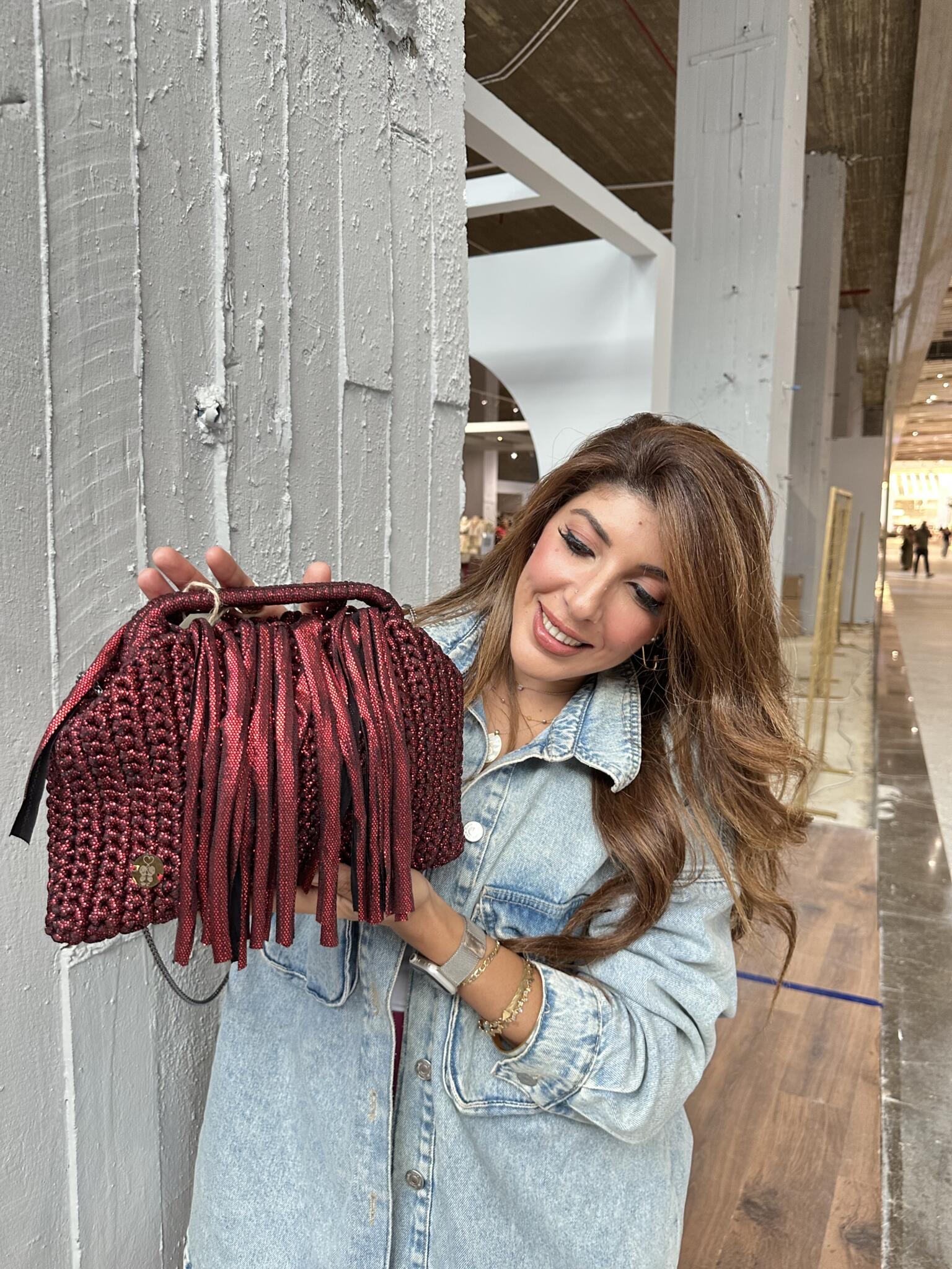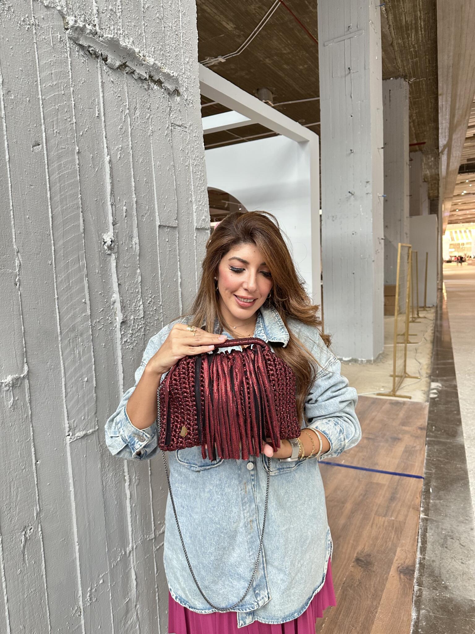 Metallic dark red dotted clutch, made from leather metallic threads.