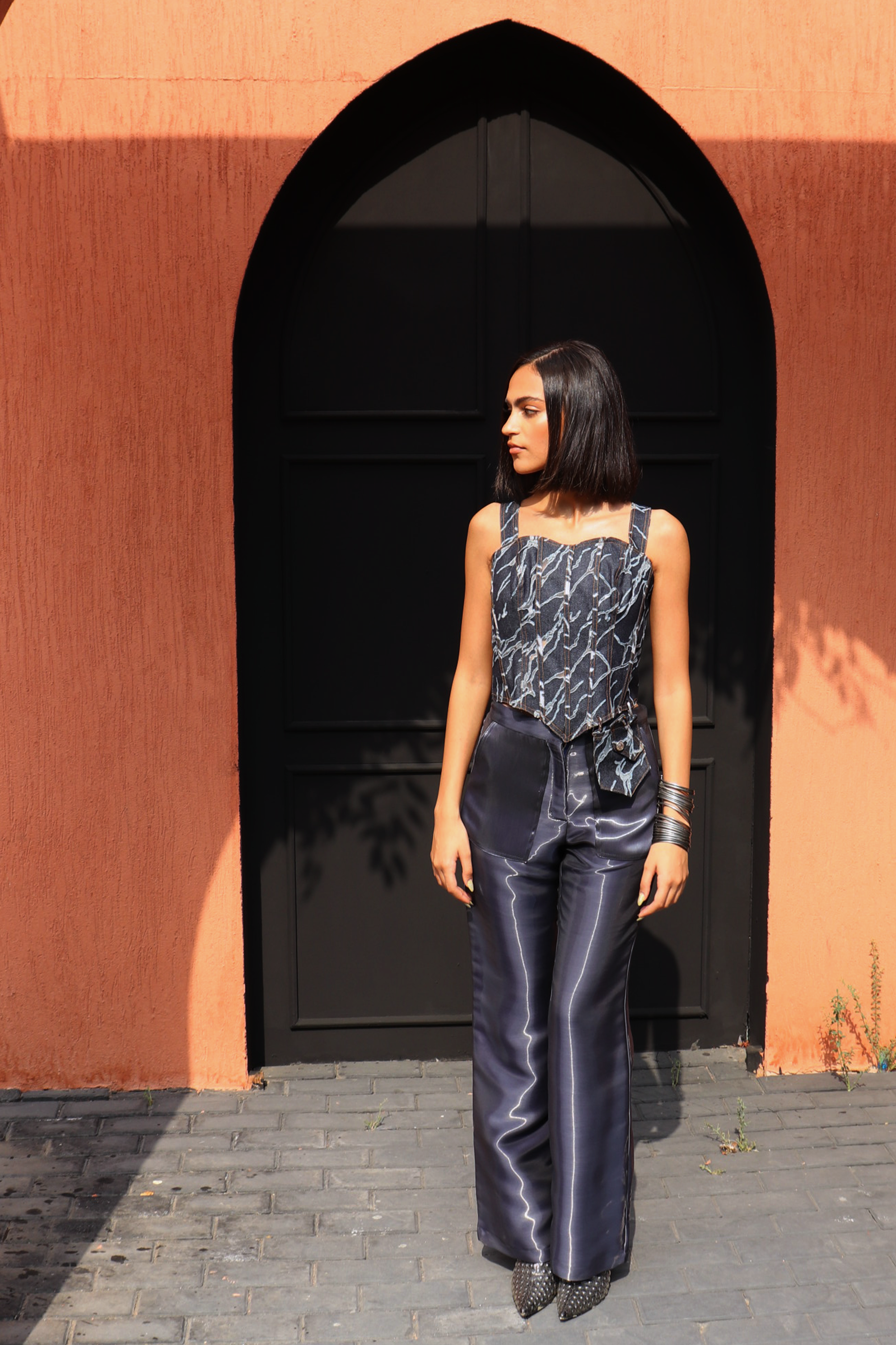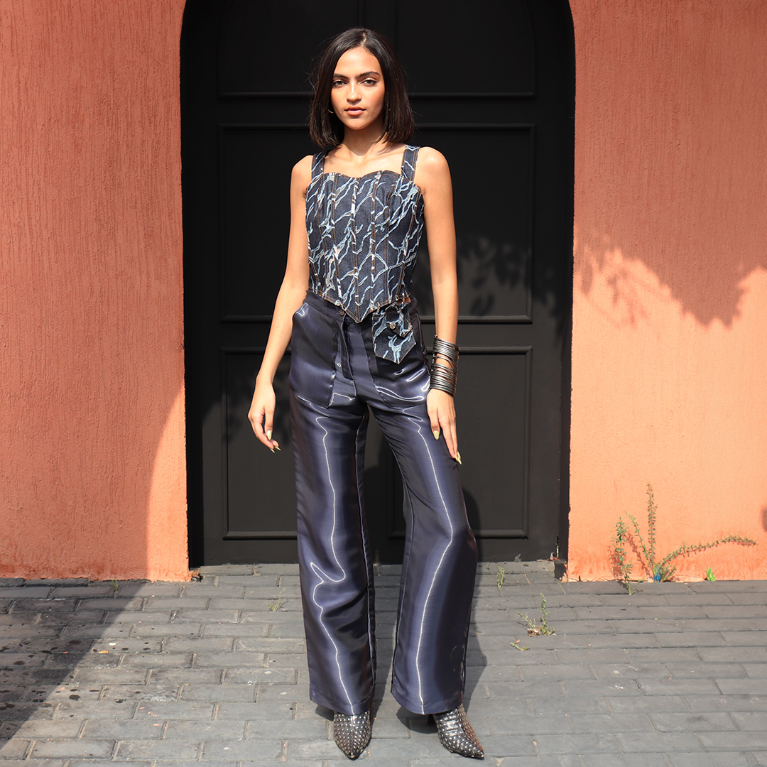 Crafted from Italian liquid effect metallic polyester fabric sourced from Italy. the fabric flows with light, creating a soft mirror-like sheen that catches every movement. Designed with a straight-leg silhouette and structured waistband for a polished yet fluid look.