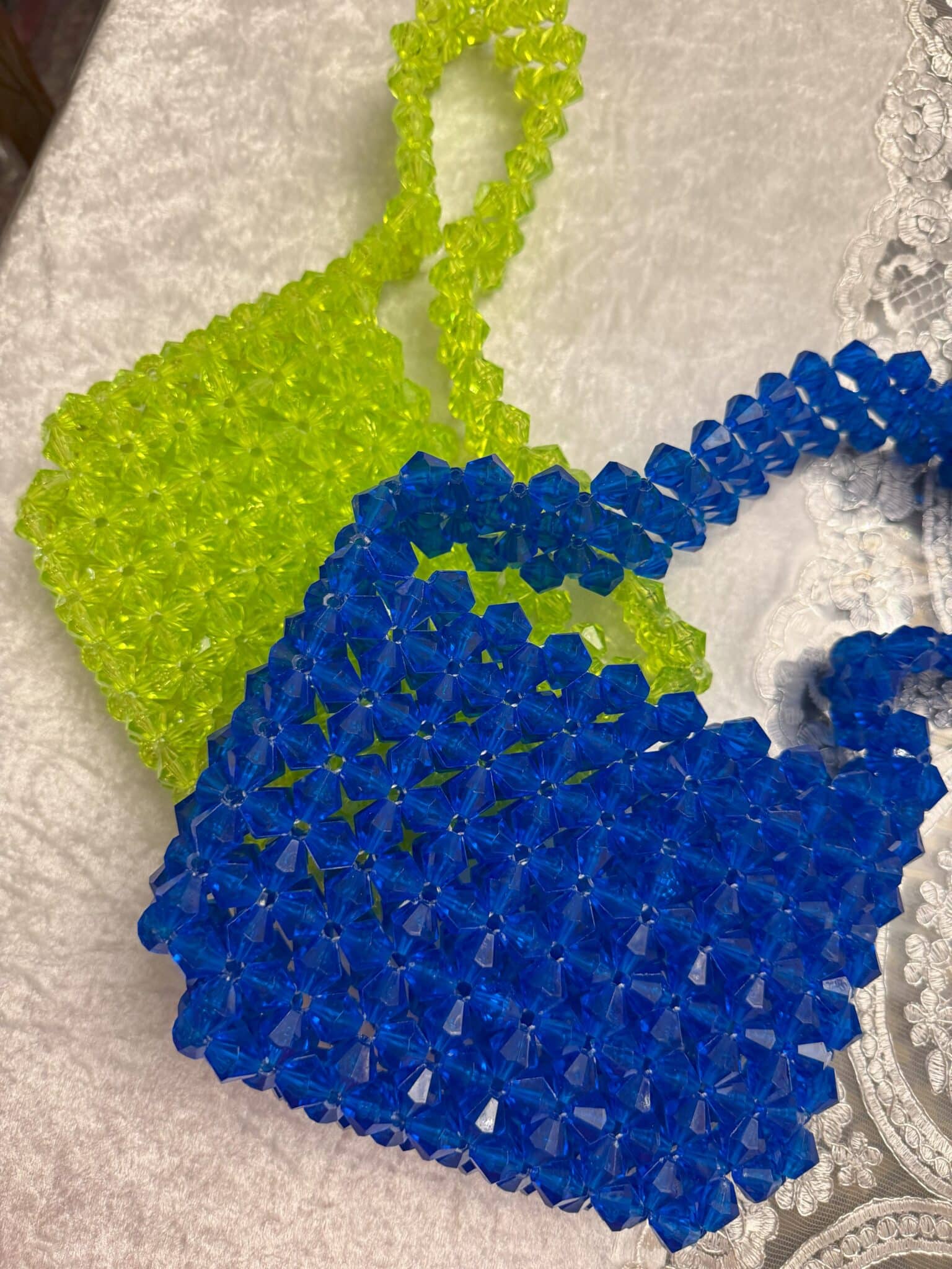 Turn heads with the Mia Bag, a dazzling shoulder accessory made entirely from glossy acrylic beads in vivid electric green and blue. Perfect for adding a pop of color to your warm-weather wardrobe, this bag blends playful energy with polished design.