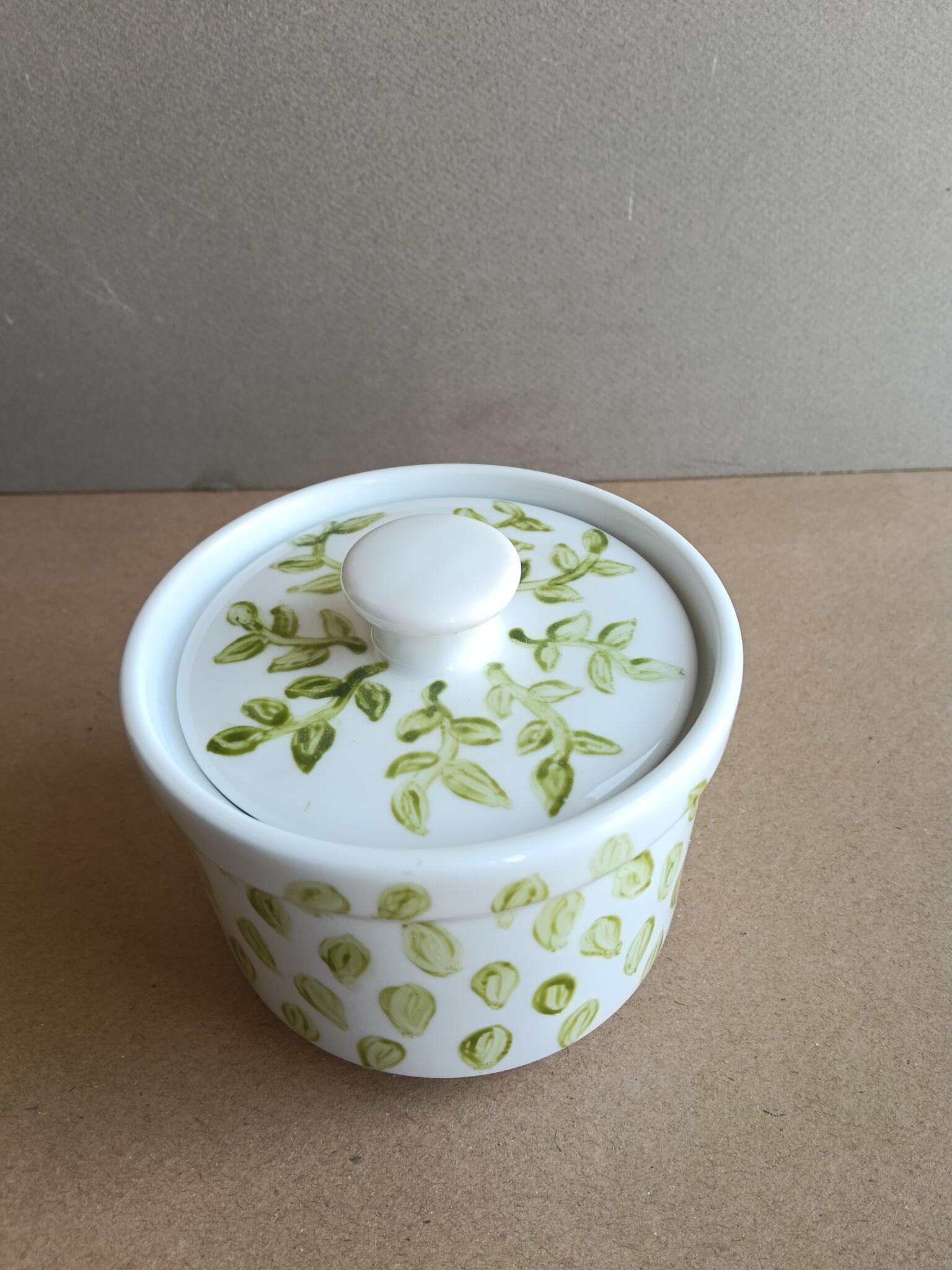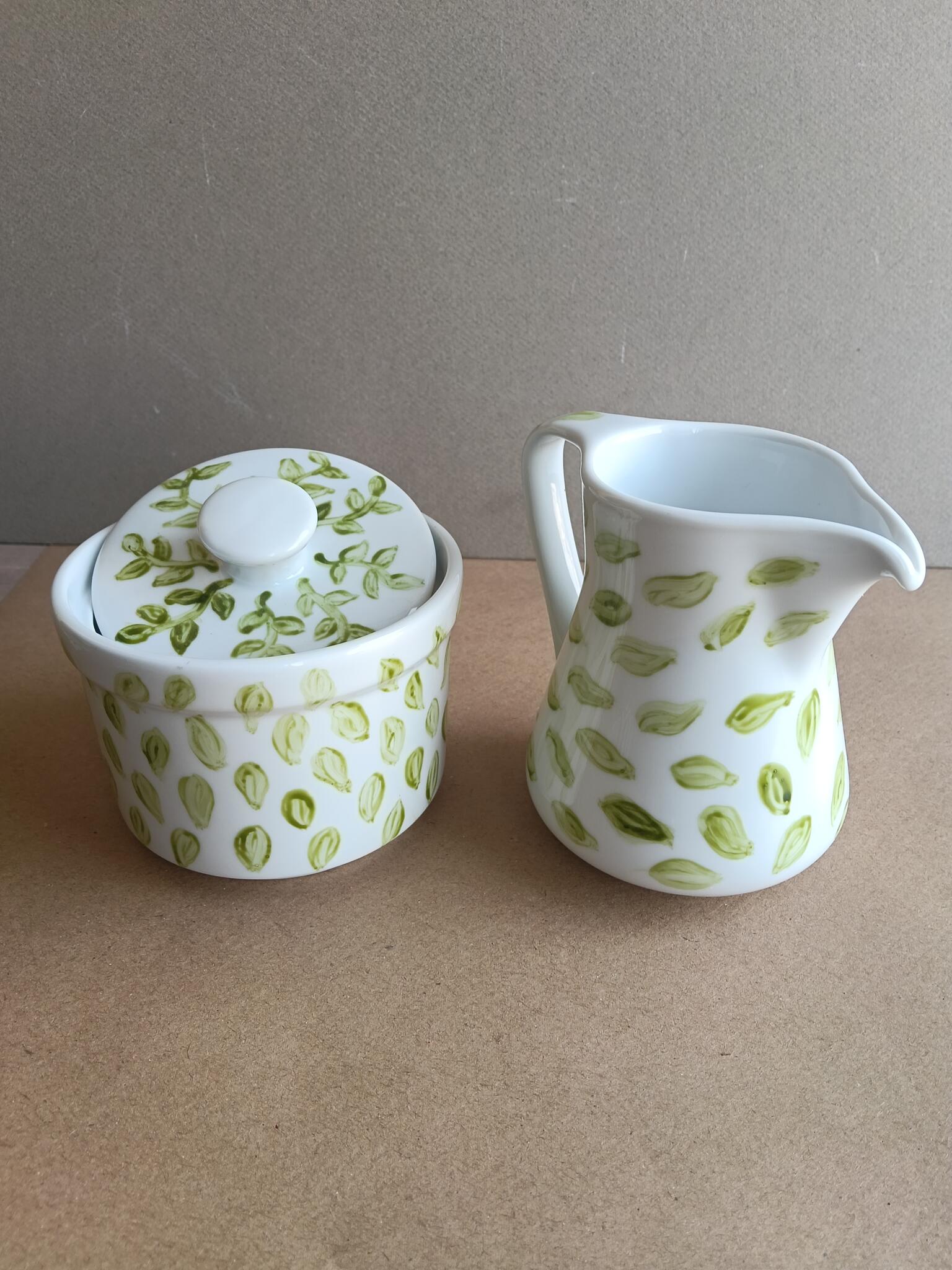 Porcelain milk jug and sugar pot both hand painted with green leaves