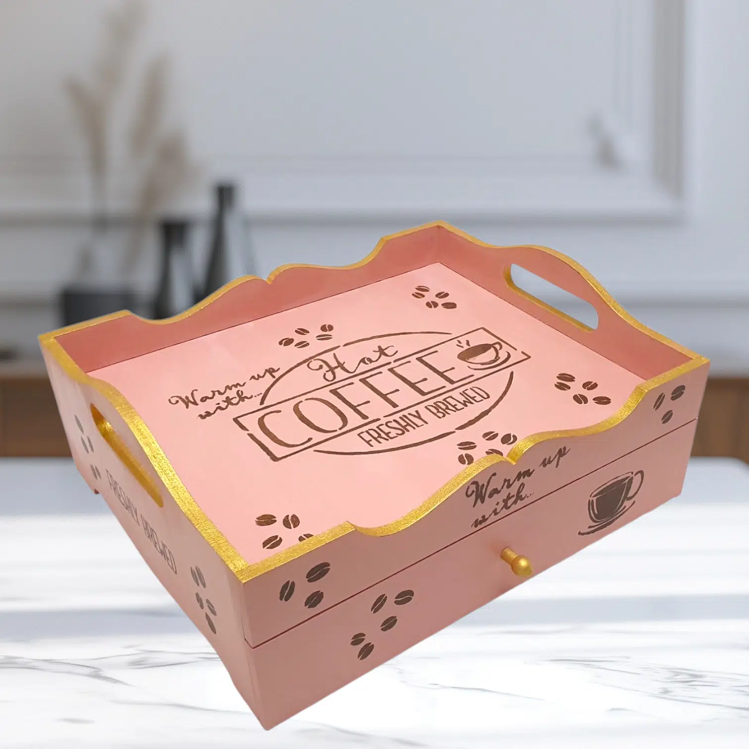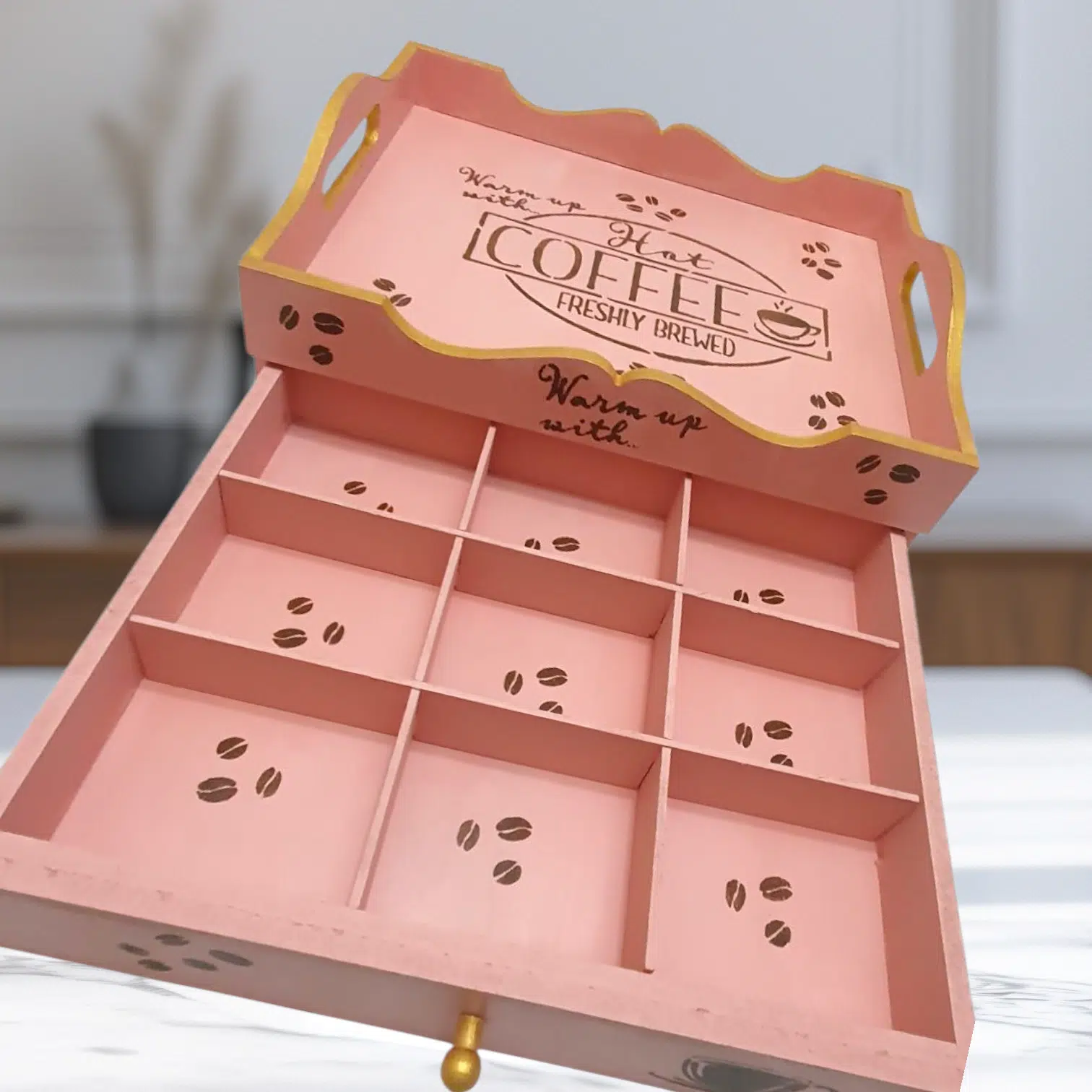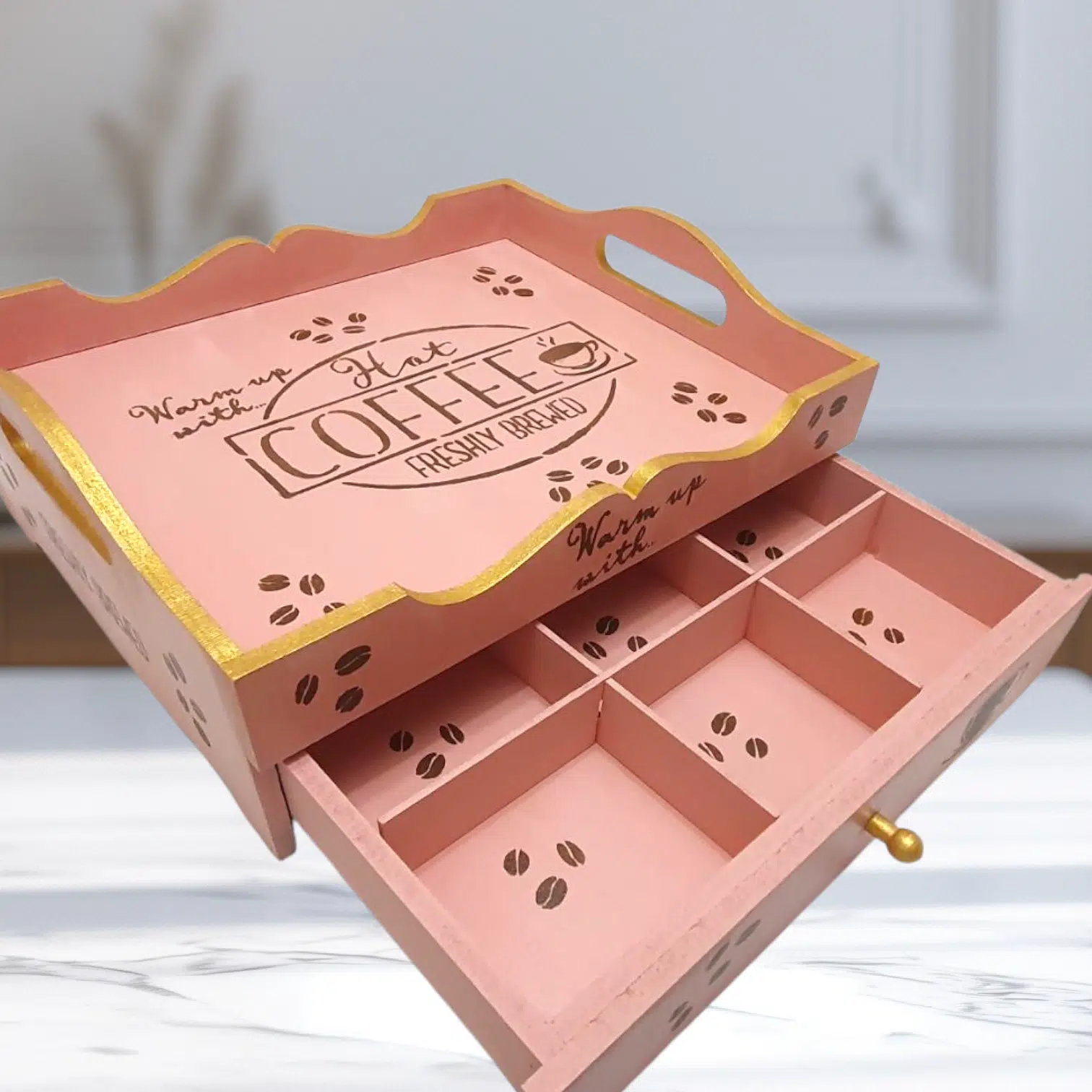 A mini coffee corner (tray with a drawer that has removable separators)