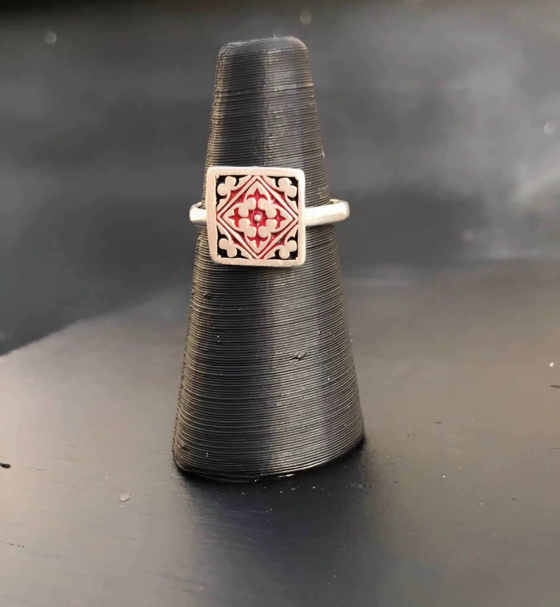 The sterling silver miniature ring is a delicate piece of jewelry yet it has an intricate design. Every single detail is hand painted. Ring size is adjustable.