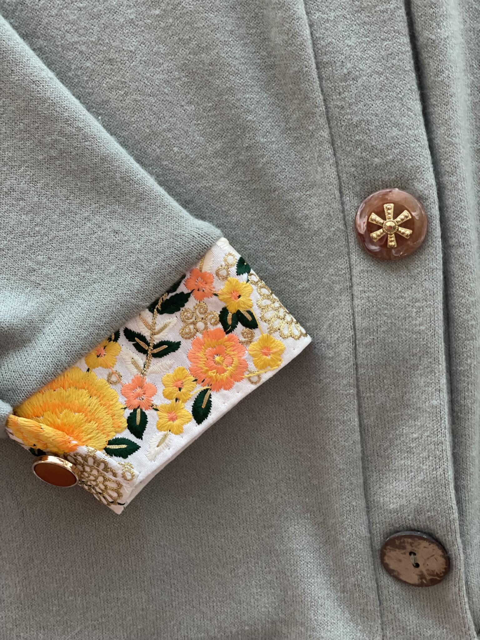 A fresh take on a cozy classic, our Mint Floral Cuff Cardigan combines soft comfort with handcrafted charm. Designed in a soothing mint tone, this cardigan is beautifully finished with floral fabric accents on the cuffs, adding a subtle pop of color and artistic detail.