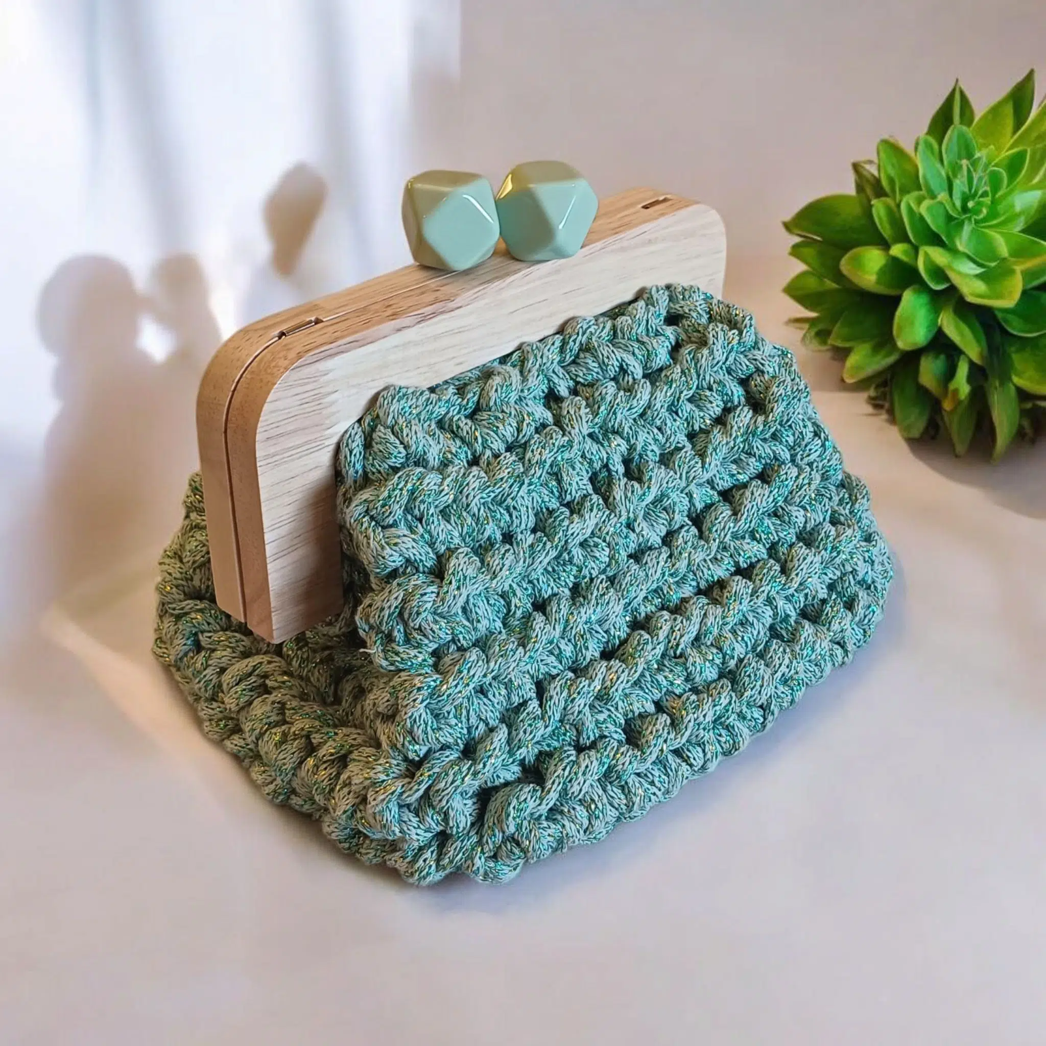 Mint green crochet clic-clac summer clutch with a lovely wood frame and mint green ball accessories