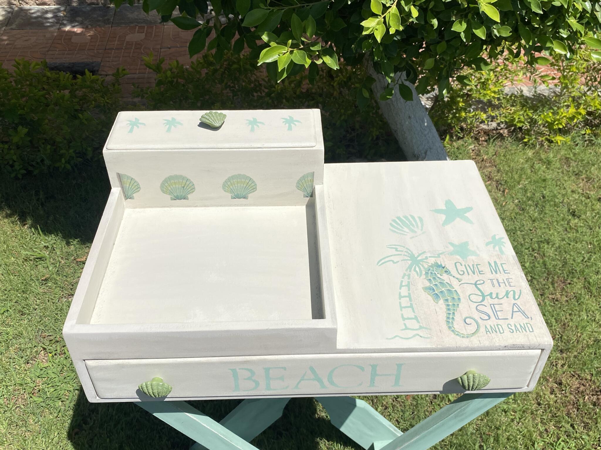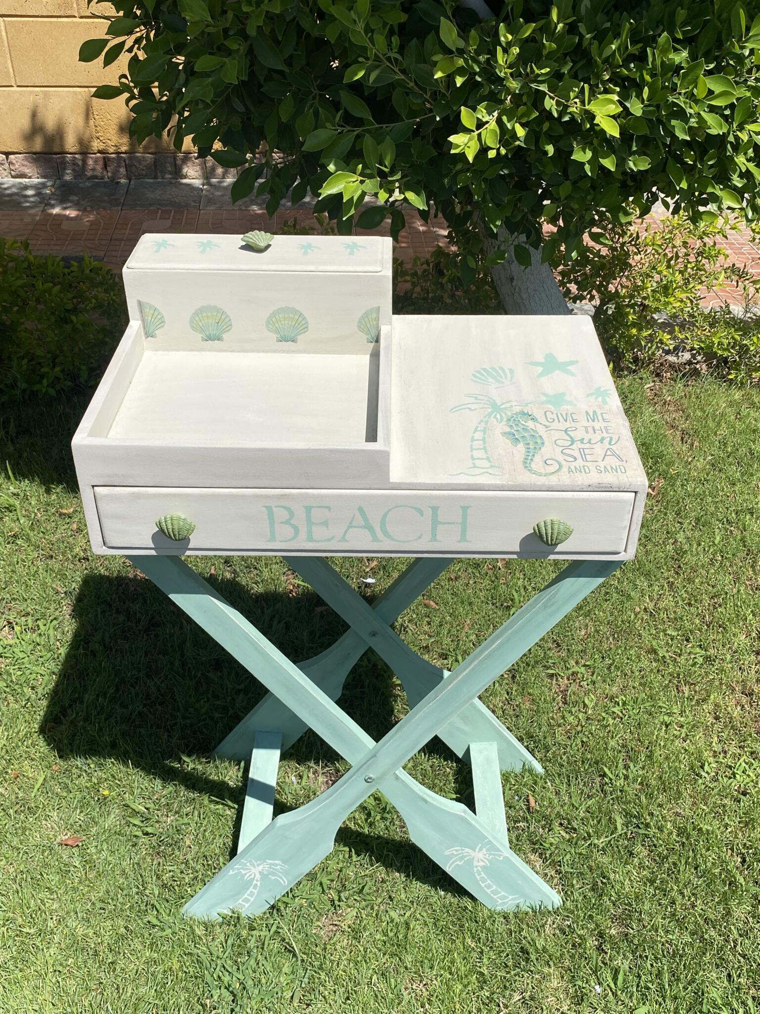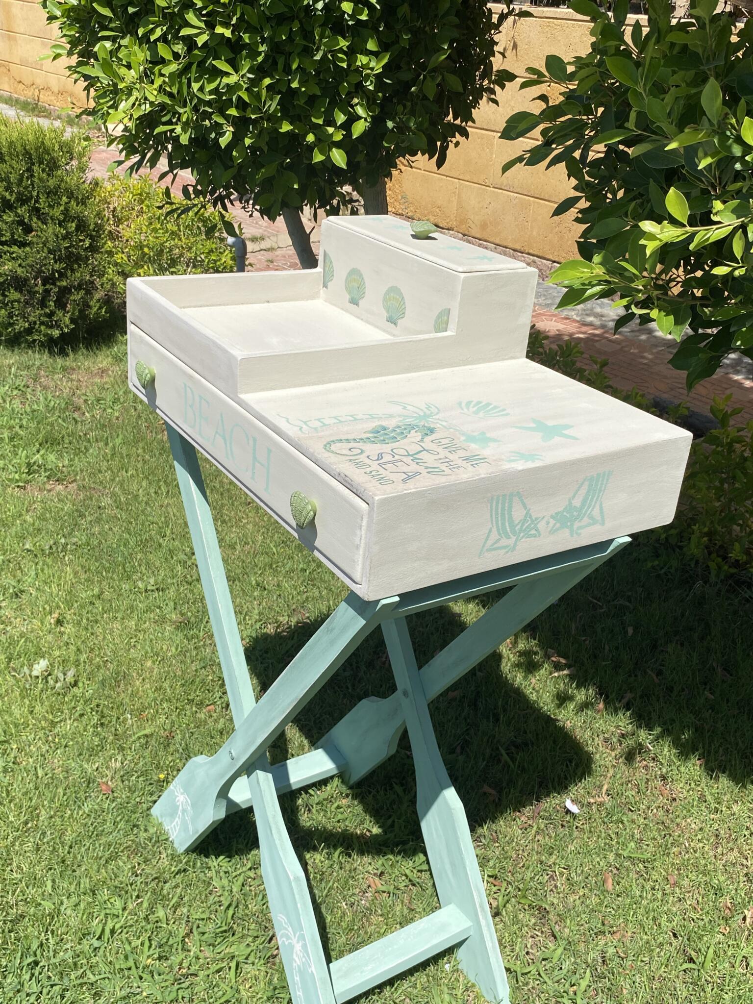 Wooden summer coffee table in mint x beige colors and tropical theme