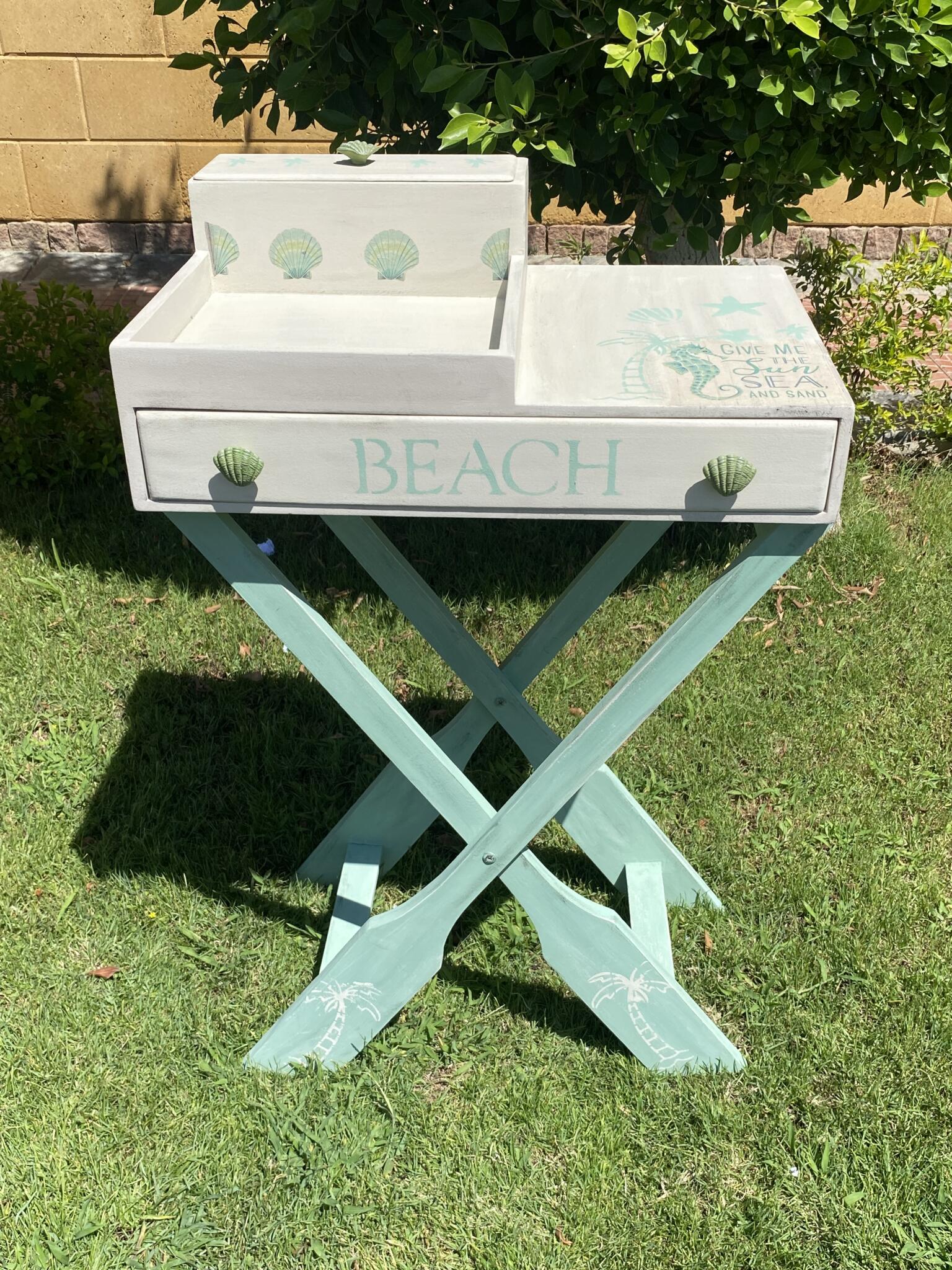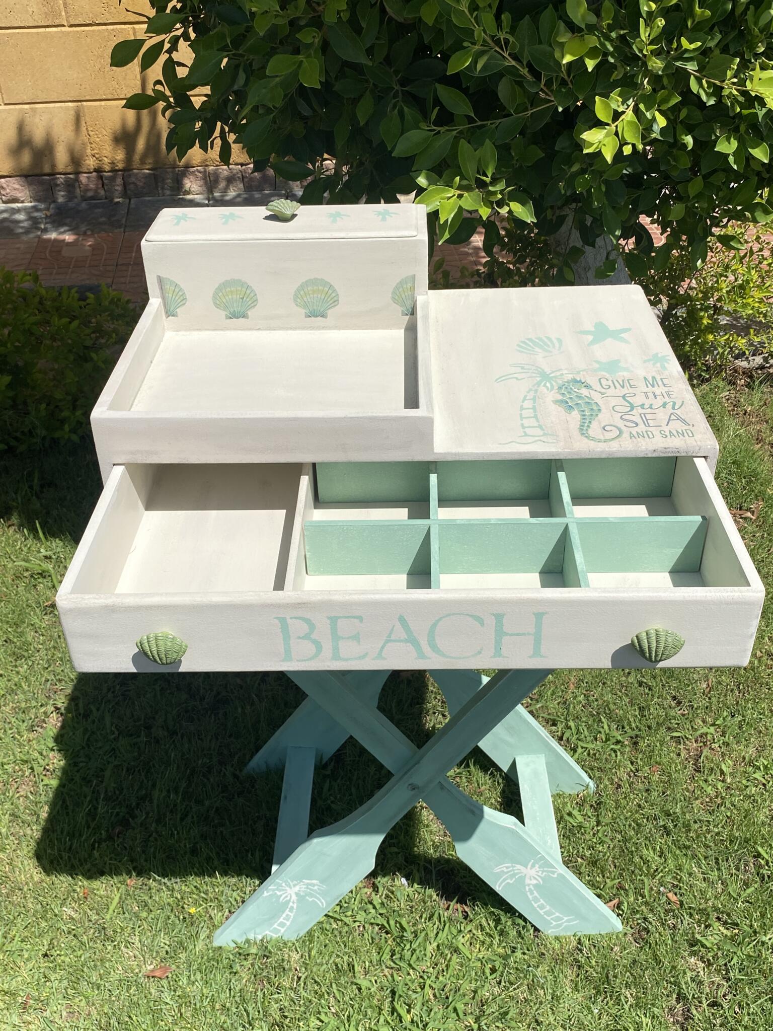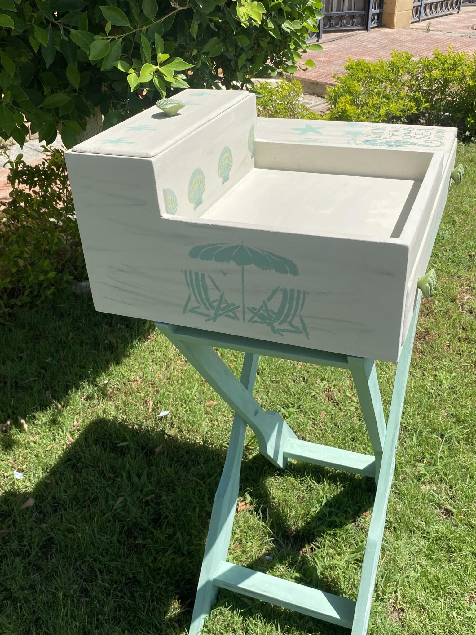 Wooden summer coffee table in mint x beige colors and tropical theme